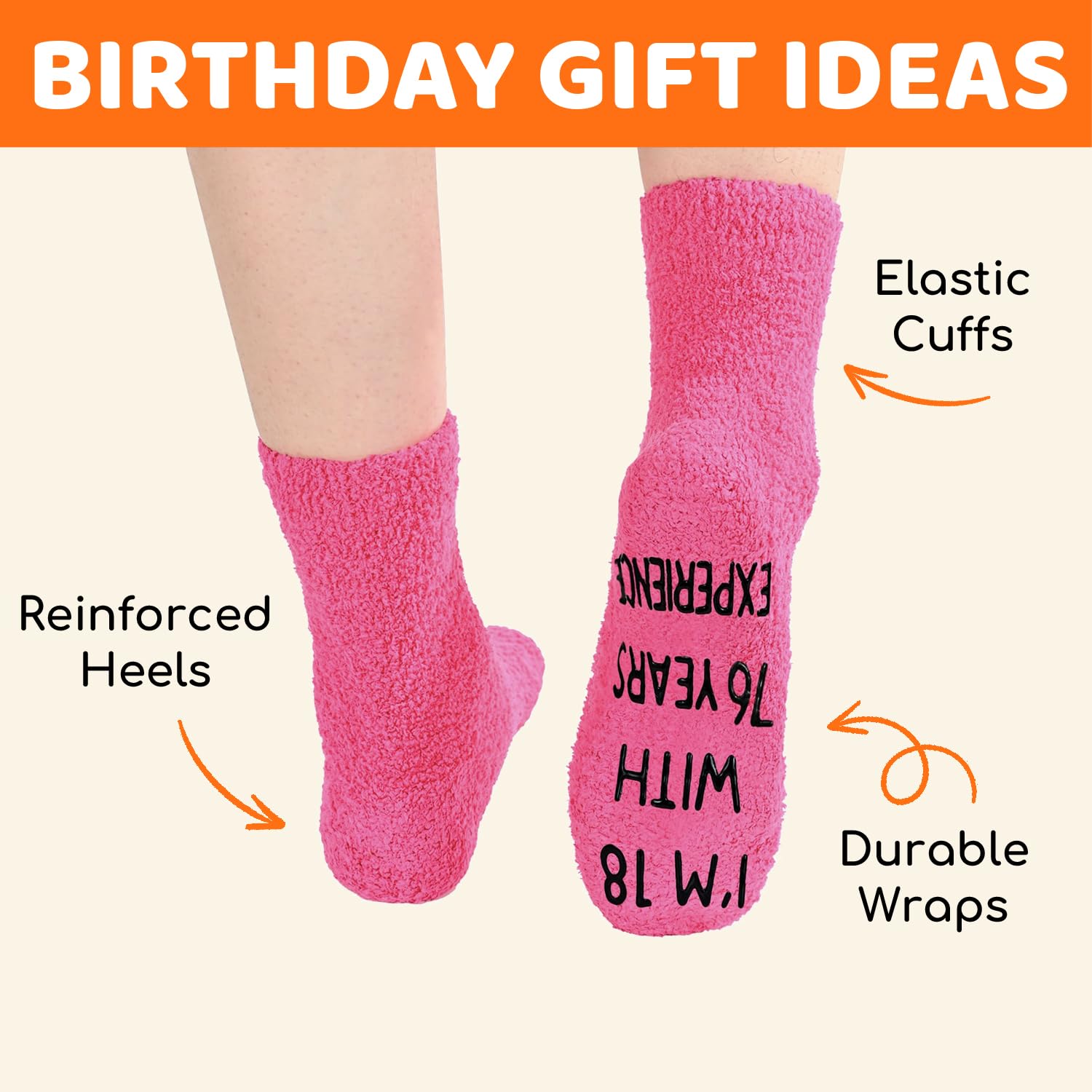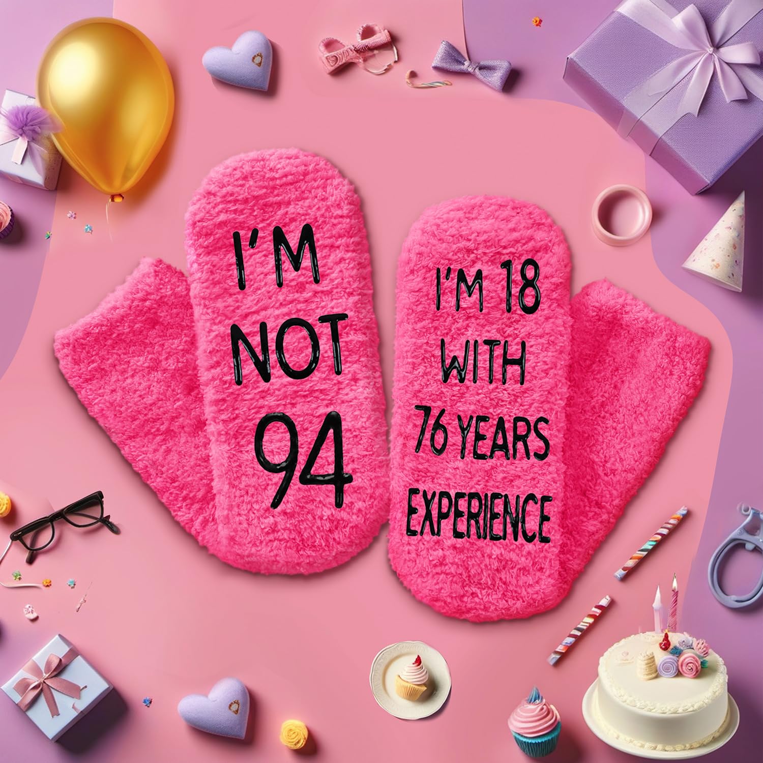 GIFTS FOR WOMEN IN THEIR 94S: Say it with socks - "I'M NOT 94, I'M 18 WITH 76 YEARS EXPERIENCE." These are suitable for elderly senior citizens, and older people.