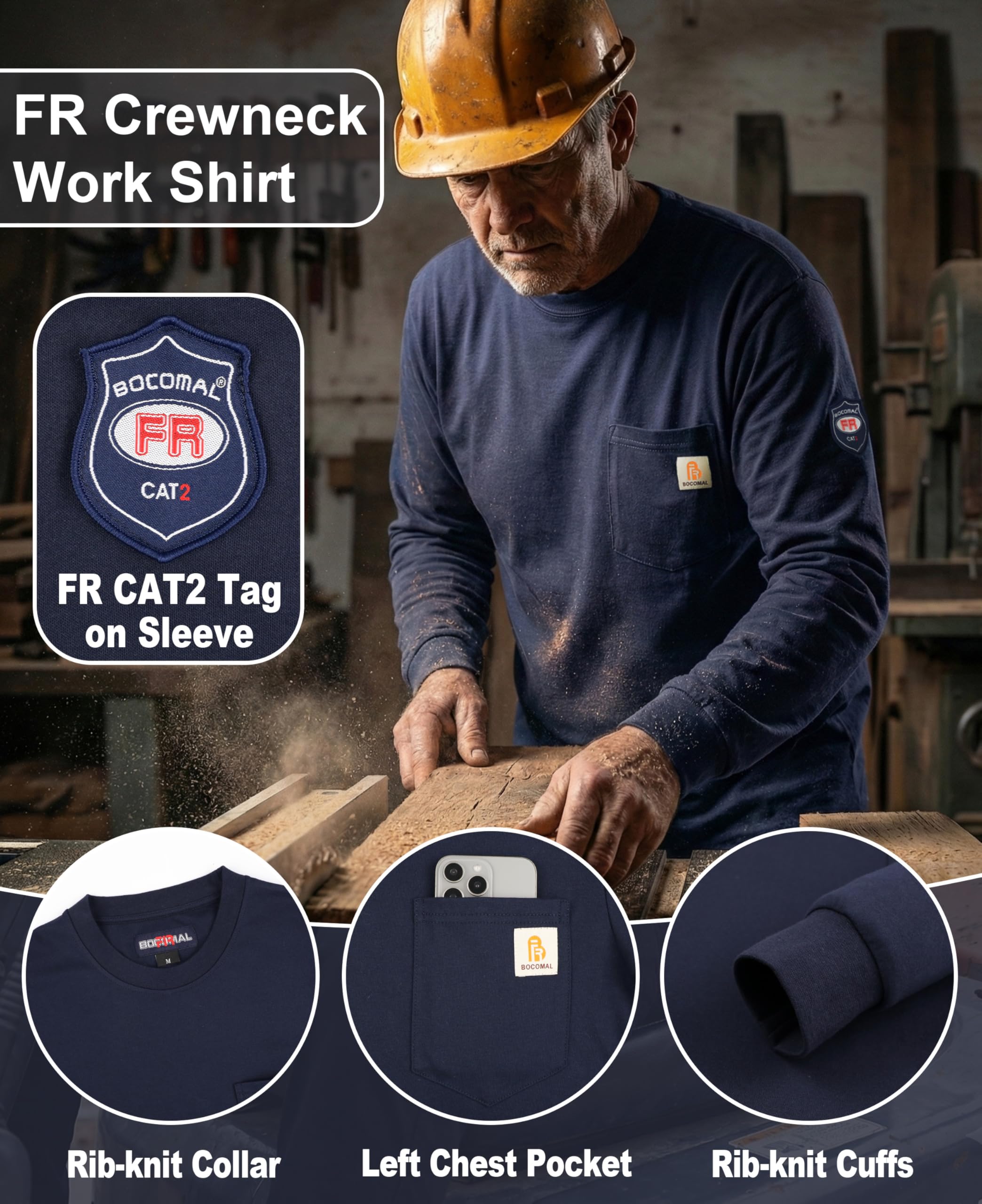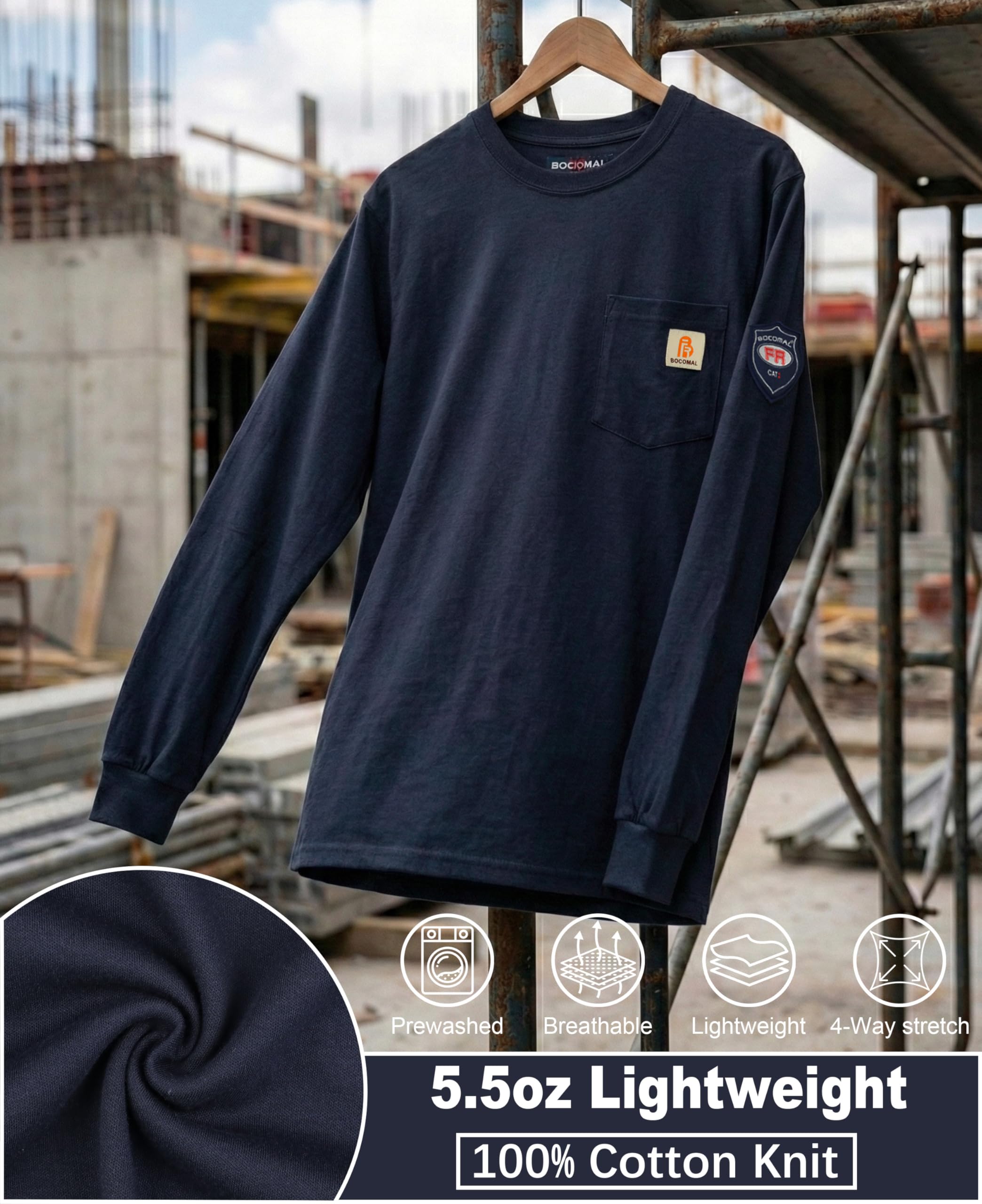 FR MATRIALS LIGHTWEIGHT:5.5oz knit featured flame resistant treated cotton,stitched with FR armid threads.Eyecatch FR Tag on pocket.we have included a small sample inside the package for customers to try out the FR properties firsthand.