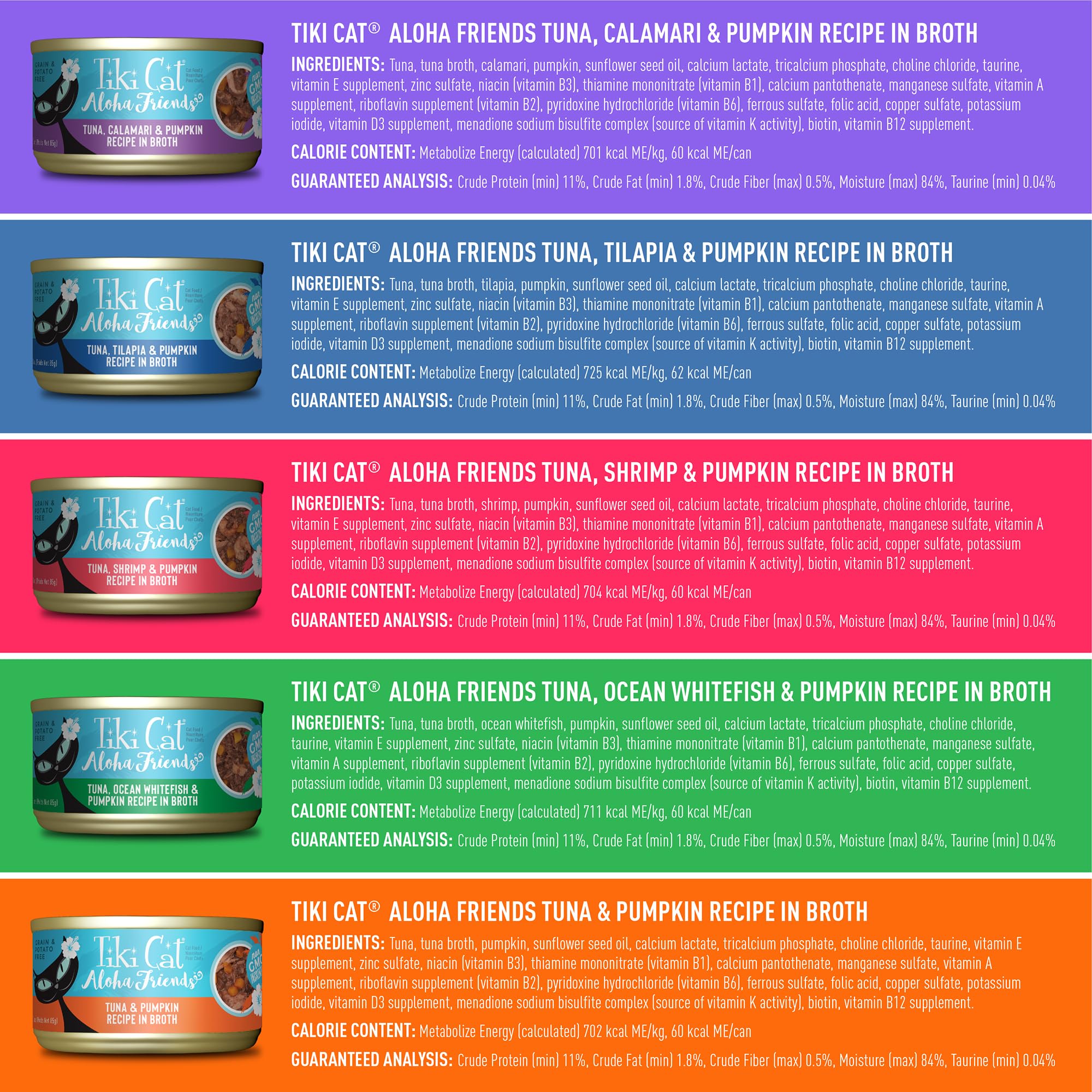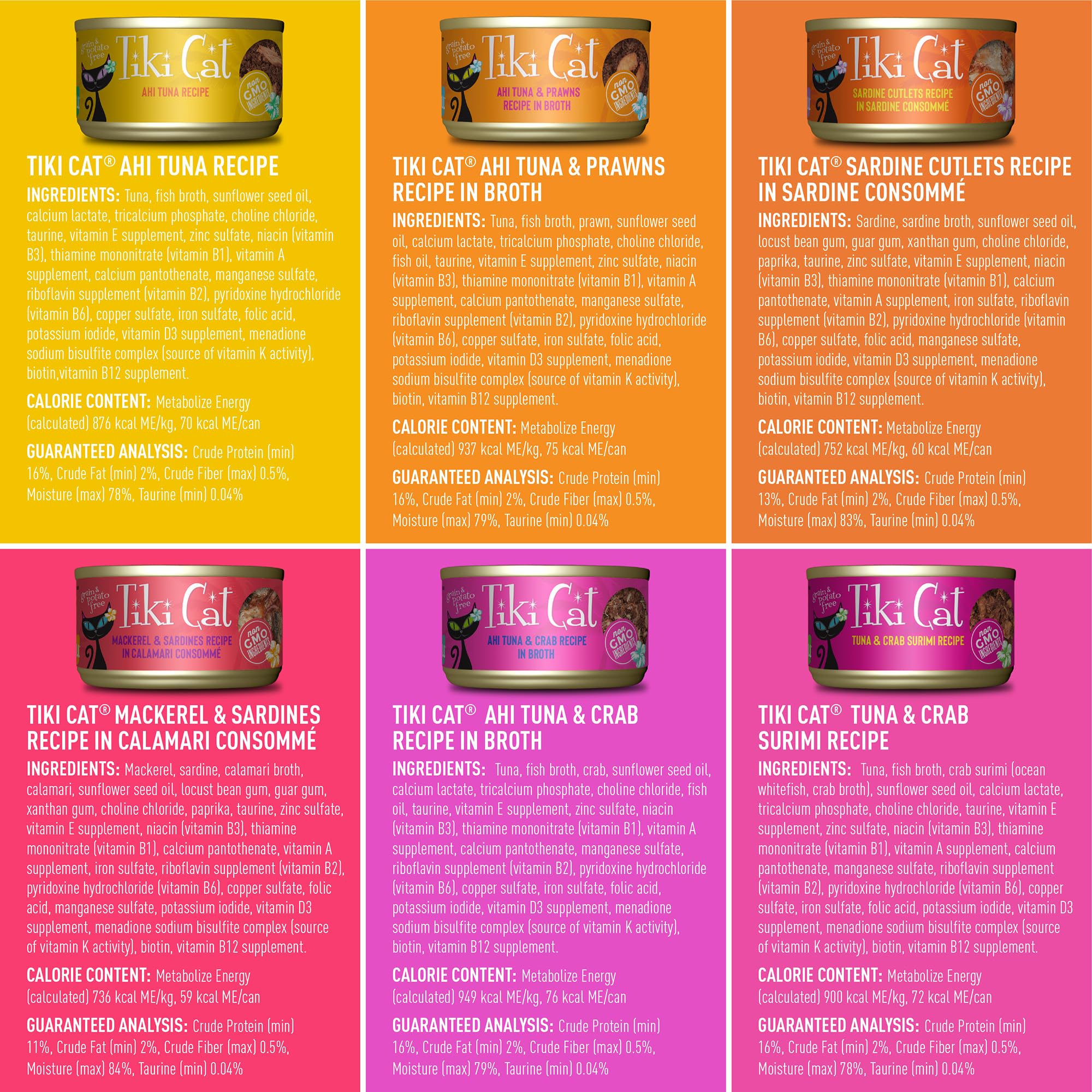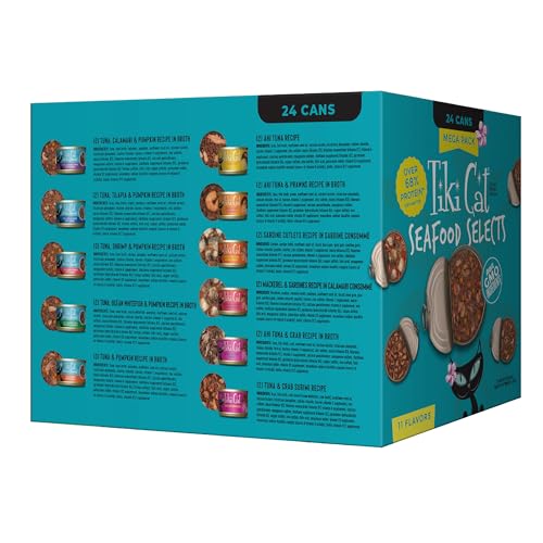 The ultimate variety pack for cats! The Tiki Cat Fish Favorites Mega Pack is perfect for multi-cat households or those who simply prefer less shopping trips. Tiki Cat Fish Favorites Mega Pack features 24 servings of the high-protein, high-moisture nutrition cats need as carnivores. 12 servings are Tiki Cat Aloha Friends™ Recipes, which feature wild-caught ahi tuna as the first ingredient, plus pumpkin to aid digestion. Included Aloha Friends recipes are: Tuna & Pumpkin Recipe in Broth Tuna, Shrimp & Pumpkin Recipe in Broth Tuna, Tilapia & Pumpkin Recipe in Broth Tuna, Ocean Whitefish & Pumpkin Recipe in Broth Tuna, Calamari & Pumpkin Recipe in Broth 12 servings are Tiki Cat Grill, indulgent seafood and fish recipes, with real flaked tuna, sardines, crab and prawn in a savory broth. Included Grill recipes are: Ahi Tuna Recipe Sardine Cutlets Recipe in Sardine Consomme Ahi Tuna & Prawns Recipe in Broth Mackerel & Sardines Recipe in Calamari Consomme Tuna & Crab Surimi Recipe Ahi Tuna & Crab Recipe in Broth Delight your cat with a new fishy flavor at each meal!