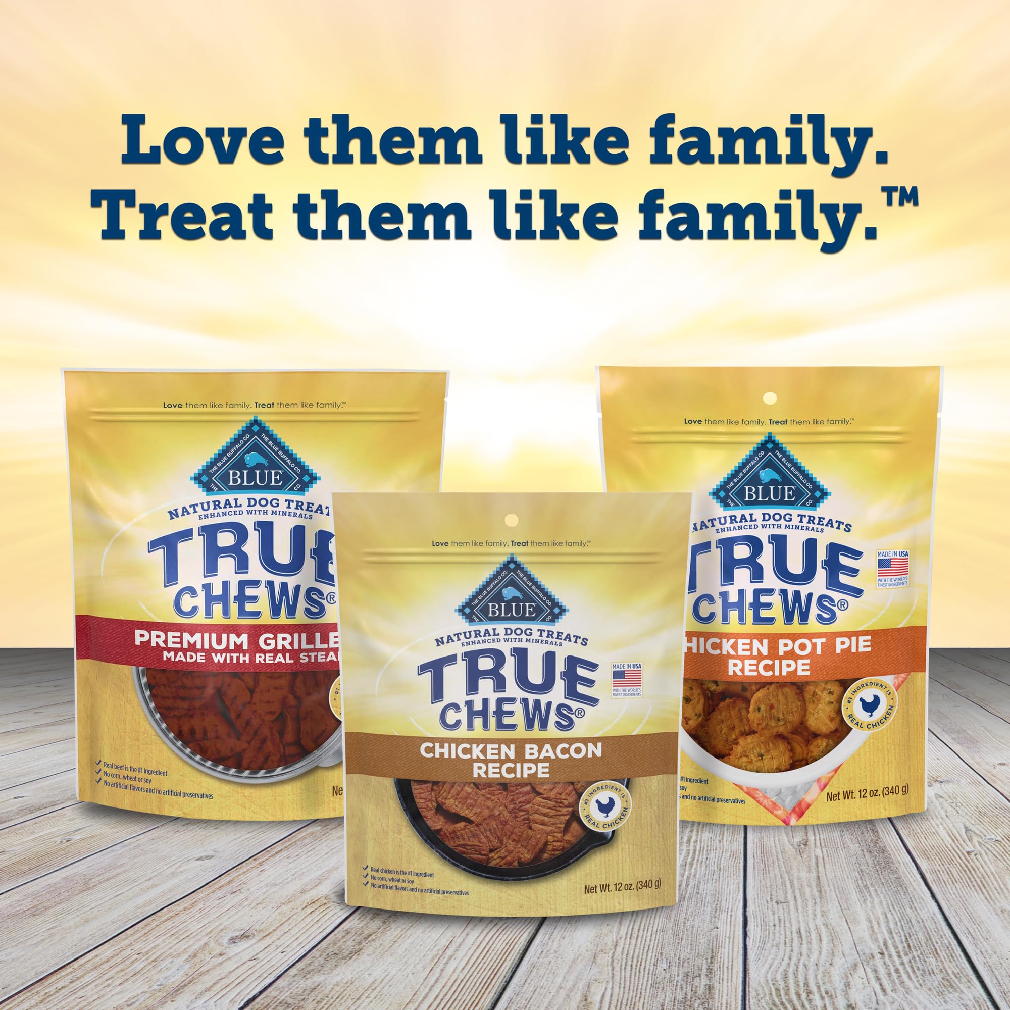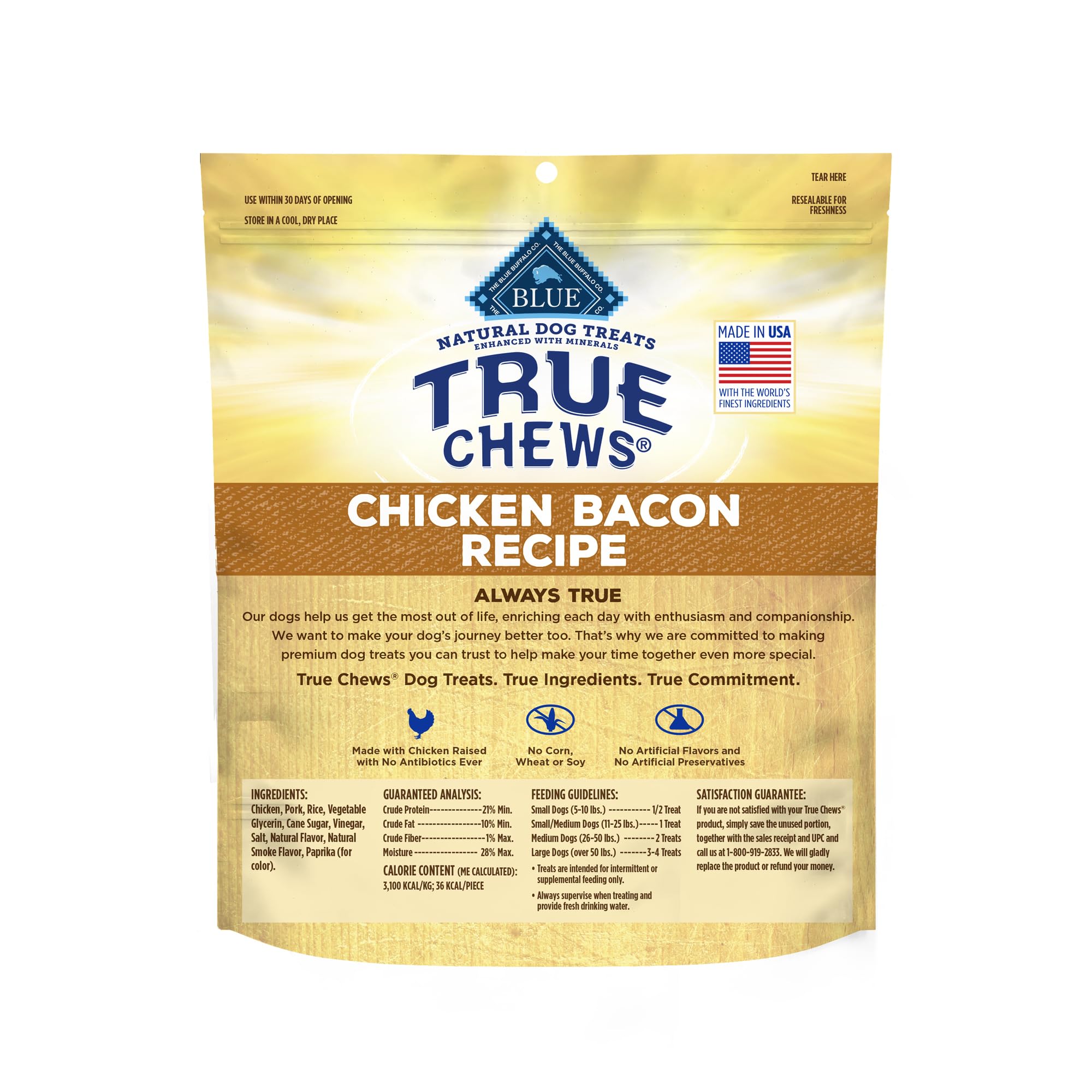 Contains: One (1) 12-oz bag of BLUE True Chews Natural Chewy Dog Treats; Chicken Bacon Recipe