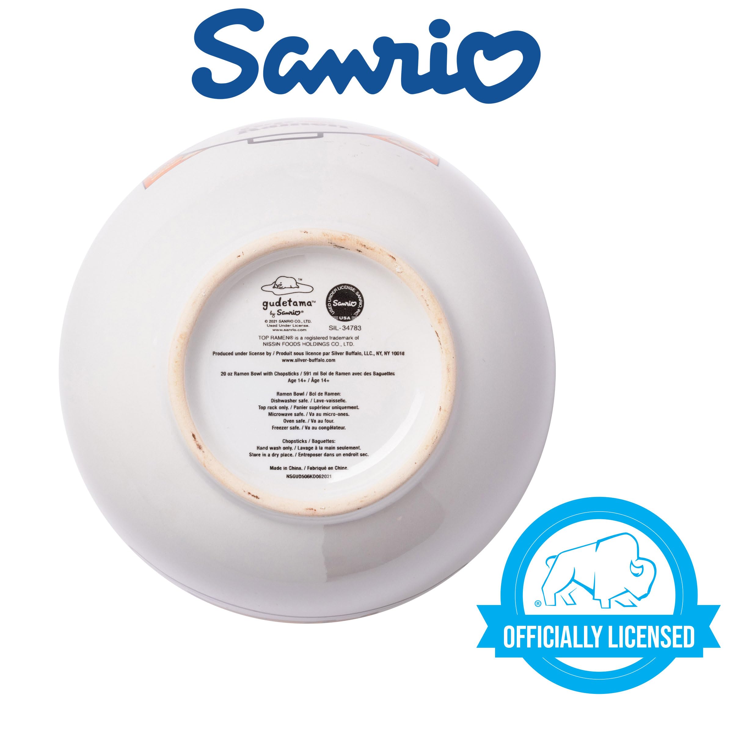 Official Licensed Sanrio Gudetama Merchandise. Enjoy this Gudetama ceramic ramen bowl with chopsticks. Our Gudetama Top Ramen Bowl with Chopsticks holds 20 ounces of your favorite food. This ceramic Ramen Bowl has a wide mouth opening and can be used for rice, soup, coffee, ice cream, or cereal. Perfect for hot or cold food, BPA-free, microwave safe, and top-shelf dishwasher safe. Have confidence knowing you are purchasing an officially licensed Sanrio Gudetama product from Silver Buffalo. Working in collaboration with licensors and brands, Silver Buffalo develops unique, creative, and ground-breaking products with a devotion to detail and innovation, while staying true to current trends. Silver Buffalo prides themselves on manufacturing and distributing exciting products that connect with the child or fan(atic) in all of us. We focus on the design, manufacture, and distribution of items featuring popular cultural icons. Silver Buffalo features all of your favorite comic heroes, cartoon characters, board games, movies, and more. #TAG: Dinnerware, Ramen, Bowl, Chopsticks, Ceramic, Soup, Cute, Noodle, Kawaii, Ramen bowl with chopsticks, Noodle Bowl, Cute ramen bowl, Kawaii bowl, Round bowl, Food, Pattern, Fruit bowl, BPA-free, Irregular bowl, 20 Ounces, Salad bowl, Wide mouth bowl, Dessert bowl, Retro ceramic bowl, Soup bowl, Pottery bowl, Silver Buffalo Dishware Bowl, Hello kitty, Sanrio, Japanese, Gift, Christmas, Housewarming, Birthday, Novelty, Home, Kitchen, Accessories, Hello Kitty Accessories, Hello Kitty bowl, Hello Kitty, Ramen Bowl, Hello Kitty Noodle Bowl, Breakfast, Lunch, Dinner, Nissin, Top Ramen, Badtz Maru, Gudetama, My Melody, Keroppi, Sanrio, Lazy Egg, The Lazy Egg, Gude Gude, Egg, Hello Kitty