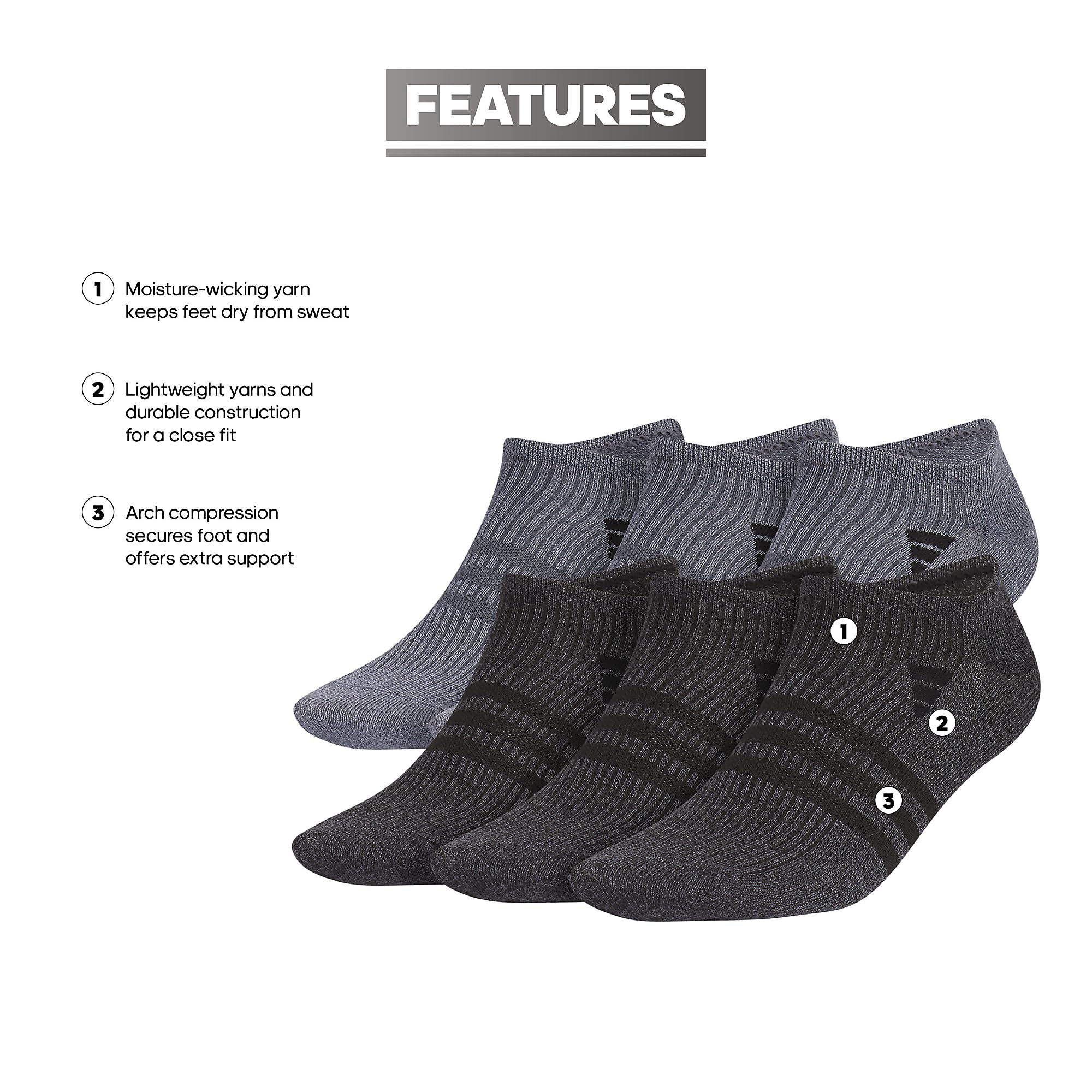 Description Enjoy comfort with the adidas Superlite No Show Socks, featuring arch compression for a supportive fit. These Men's Adidas Socks are crafted to provide a lightweight feel and moisture-wicking fabric that helps keep feet dry. Engineered to stay hidden beneath your footwear, the mens socks no show design is suitable for everyday wear. Perfect for active individuals, these men's socks provide breathability. The design of the men's arch compression socks provides the necessary arch support during workouts or casual outings