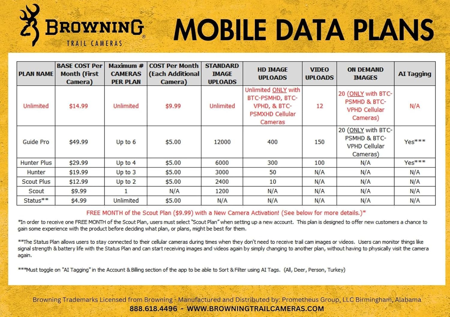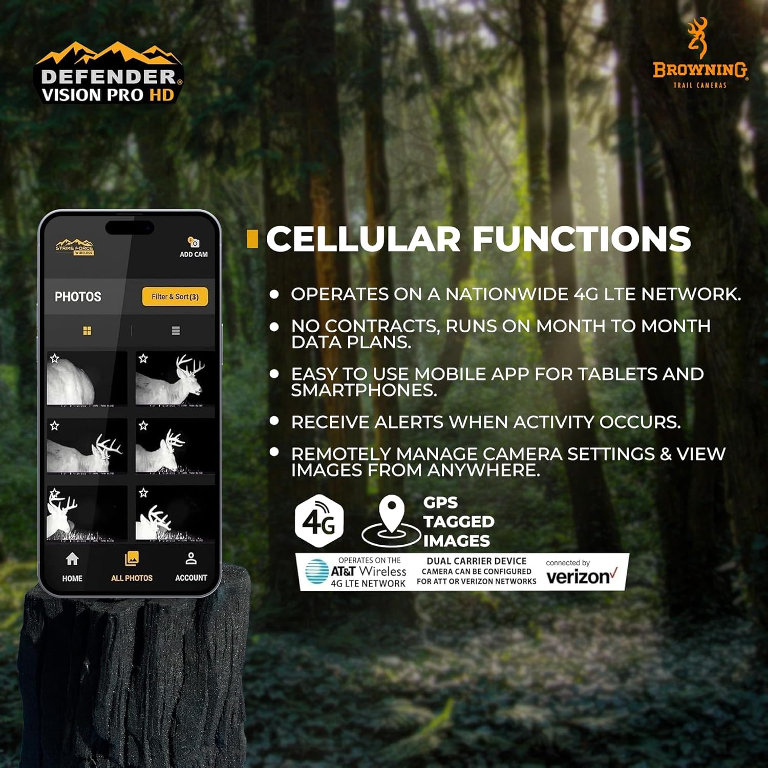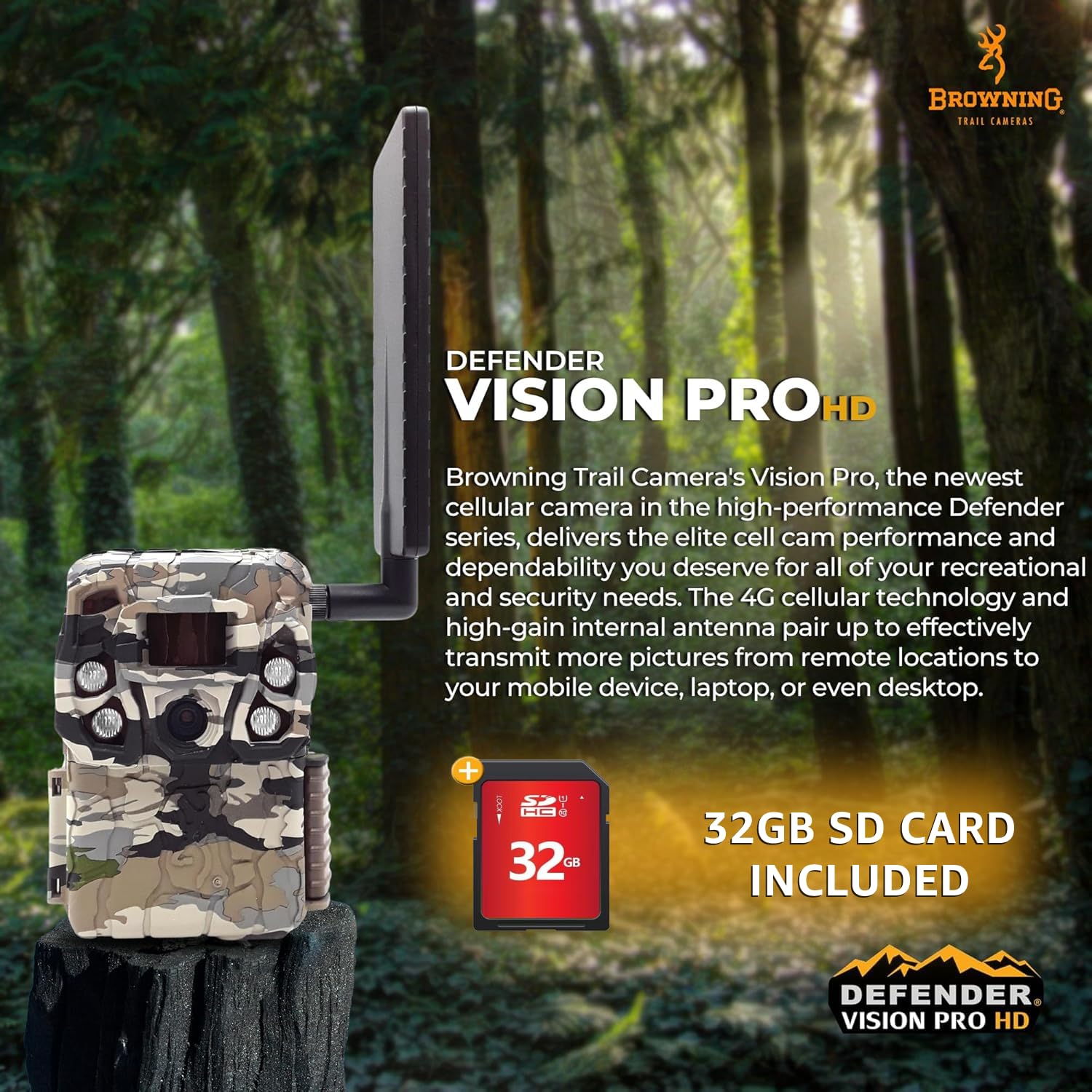 The new Browning Trail Camera Defender Vision Pro HD Series Cellular Trail Camera is a great scouting camera for your hunting hot spots. The all new HD all the time feature transmits all of your images in 1080pFull HD. You no longer need to request HD images from your camera. The new photo and video on demand feature allows you to request an immediate picture or video upload from the field. The 4G cellular technology and high gain antenna pair up to transmit more pictures from remote hunting spots to your mobile device or laptop. Industry leading 0.135 second trigger speeds, 110 feet night illumination range and superior battery life make this camera a real workhorse in the field. The new Vision Pro HD cell camera operates on Verizon or ATT 4G networks for superior reliability. It has an adjustable IR flash (power save, fast motion, long range) and 0.135 - 0.7 second adjustable trigger speed. The camera boasts GPS theft protect security system and has an external port to connect a booster antenna. Enjoy 1920 x 1080 FHD videos with sound (5 sec.- 2 min. length). The camera features an adjustable detection range up to 80 feet. It has GPS tagged images and superfast 0.5 second recovery time between images. To store with ease, it offers SD card management options. For night time pictures, it has Illuma-Smart technology that automatically adjusts IR flash for perfect night photos. Defender Wireless Vision Pro HD Smart camera offers IR video and boasts a long battery life from 8 AA batteries (not included). The battery meter functions with alkaline and lithium batteries. The camera offers up to 8 multi shot images and up to 8 rapid fire images. The picture info bar displays time, date, temperature, moon phase, and camera ID. It has a 12 volt external power jack and it supports up to 512GB SDXC memory card (not included), features a ¼ inch -20 tripod socket, and a metal tree mount bracket.