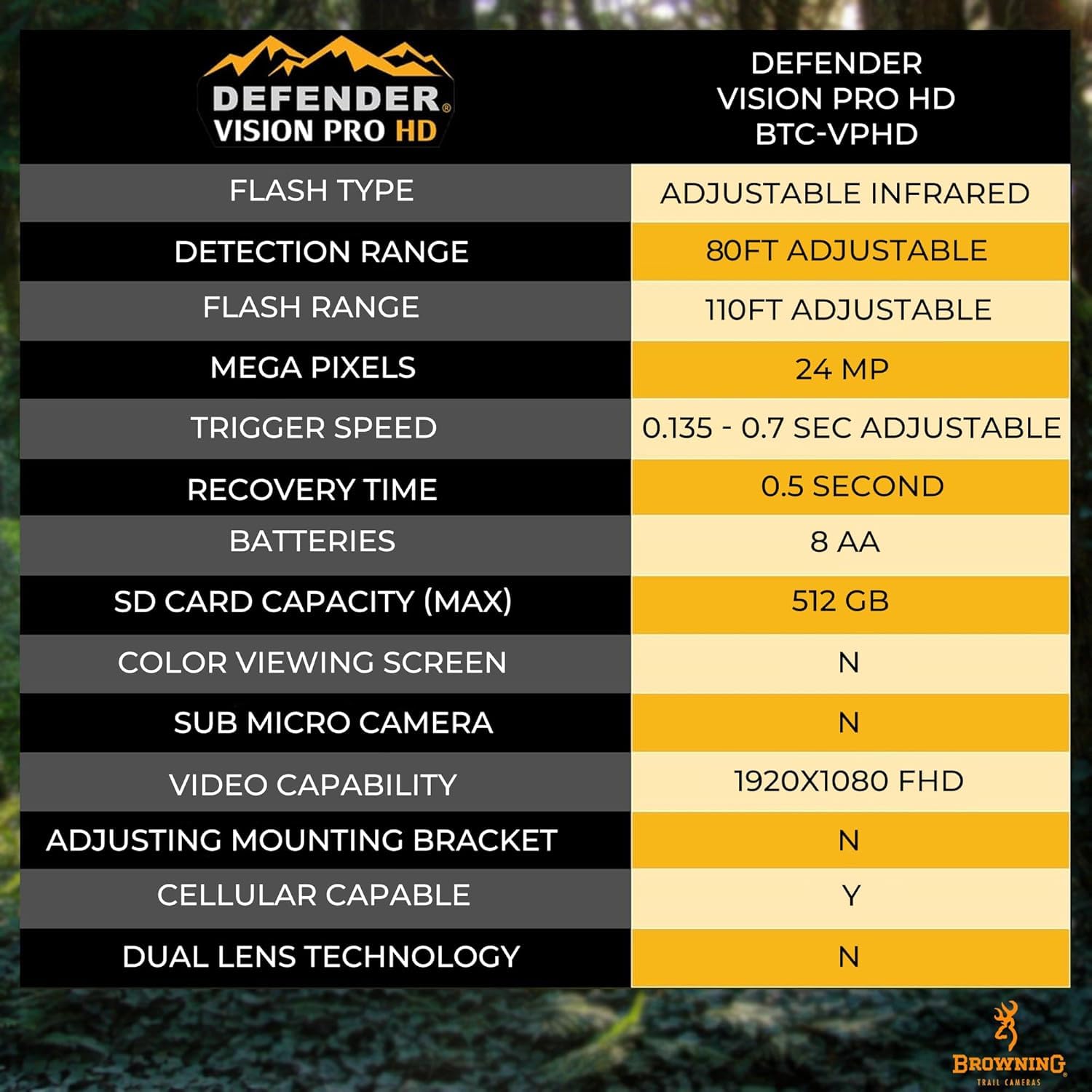 ALL HD ALL THE TIME: The Defender Vision Pro HD cellular game and trail camera is equipped with a 24 Megapixel camera capable of producing HD Images and 1920 x 1080 FHD Videos. With Browning's new on demand pictures and videos, users can also instantly upload high quality photos and videos.