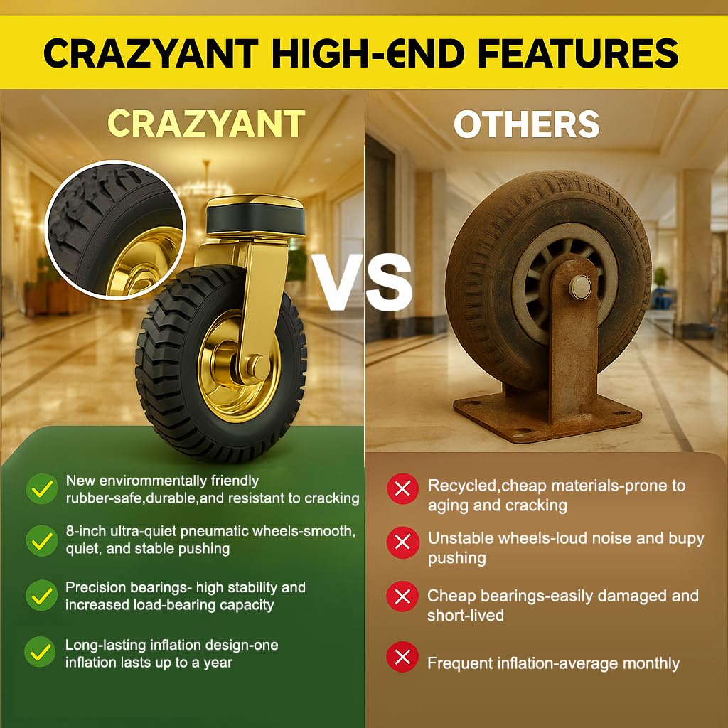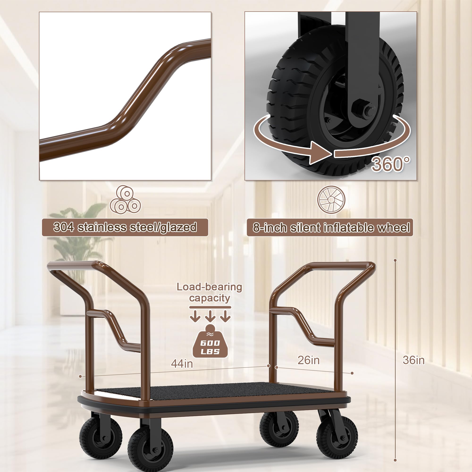 【8" Ultra-Quiet Pneumatic Rubber Wheels】 Equipped with four 8" wheels (2 swivel + 2 directional), this bellman trolley glides smoothly over carpet, tile, hardwood, and uneven terrain. The pneumatic rubber design delivers 50% quieter operation than standard wheels—perfect for quiet, guest-friendly environments.