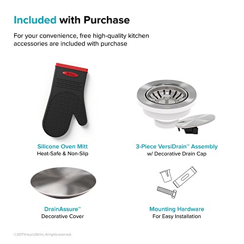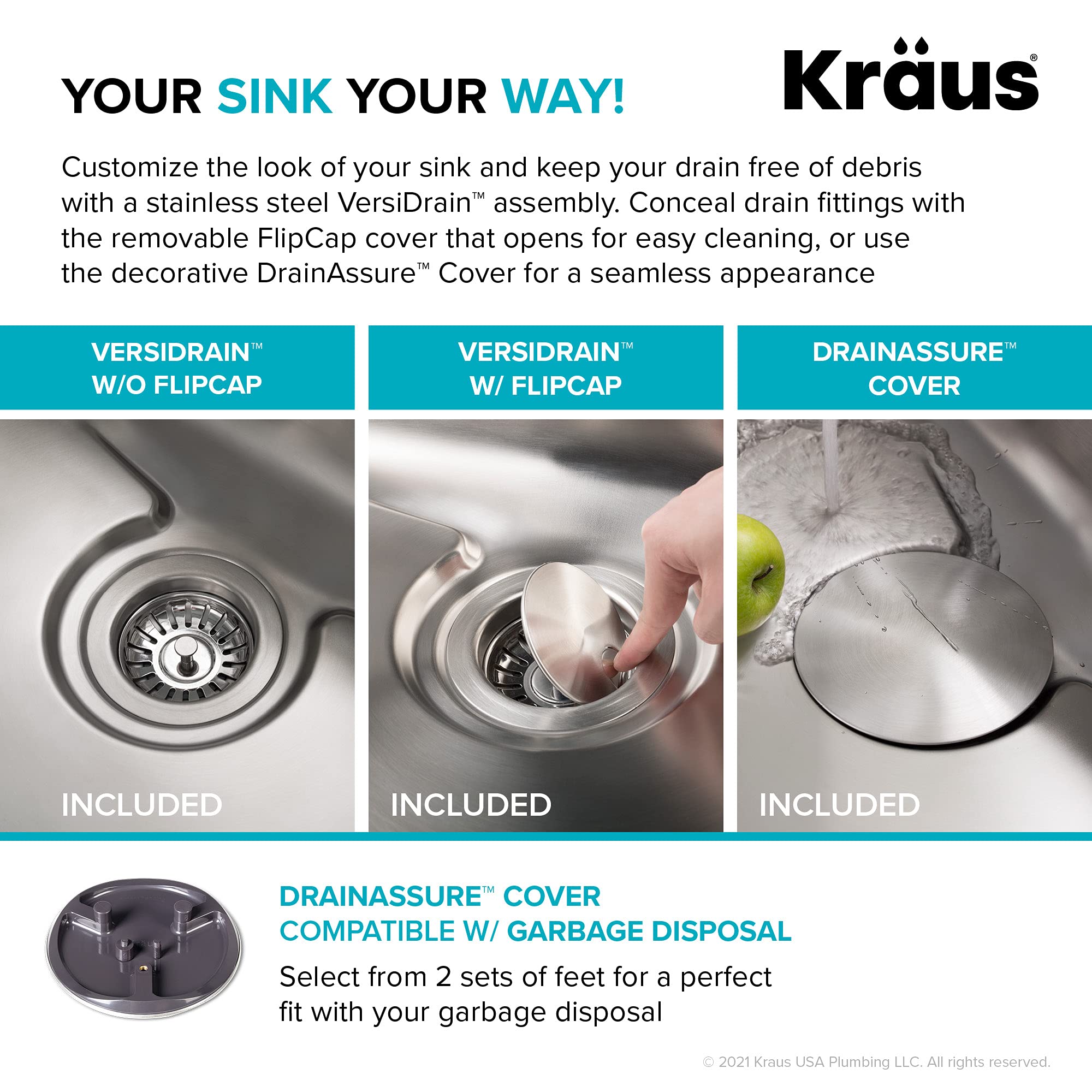 KRAUS EXCLUSIVE DrainAssure WATERWAY: Ground-breaking waterway engineered to channel water directly into the drain, even with dishes in the sink, helping prevent standing water at the bottom of the bowl