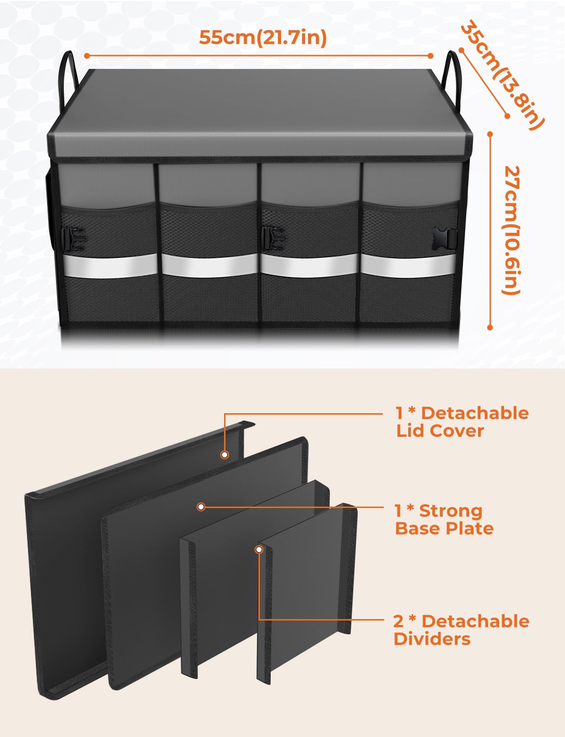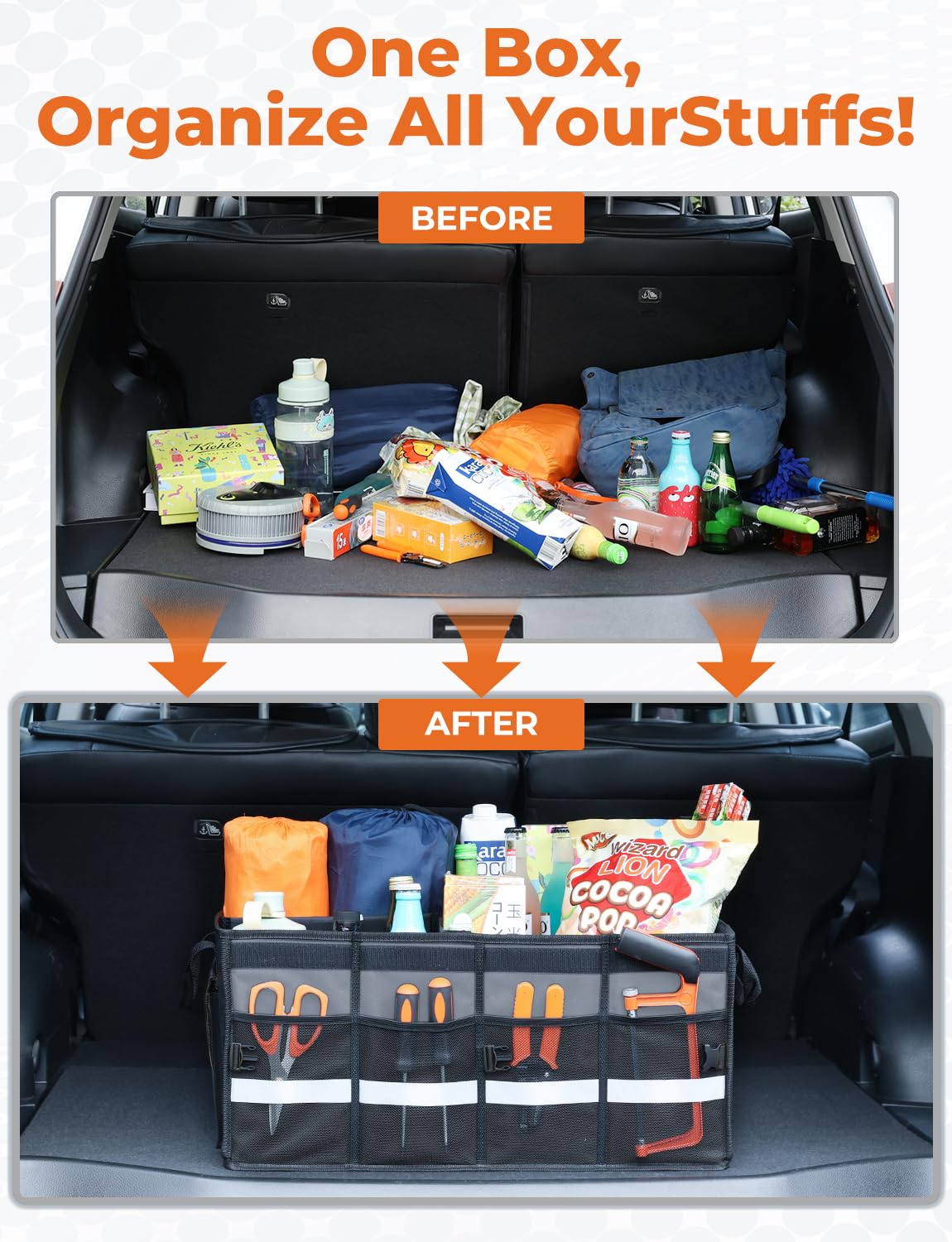 Warning effect: the reflective band provide extra visibility and safety during a load and unload the cars box at night; get the oasser trunk organizer and start to enjoy your clean and tidy car