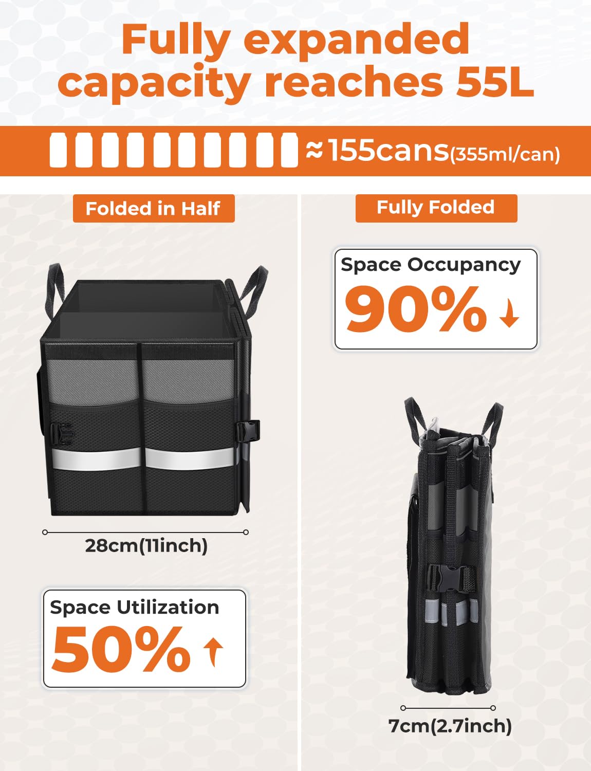 55L capacity: the trunk storage organizer can fold in snap with clips into a flat portable bag for easy carrying and storing; half-folded mode is ideal for the business or solo traveler by fitting in the passenger seat