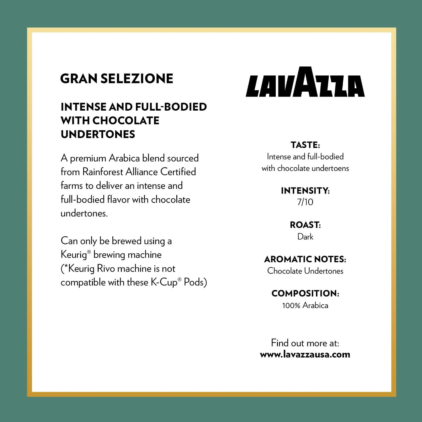 No matter how you take your coffee, Lavazza has a blend and preparation to perfectly fit into your coffee ritual. Four generations of the Lavazza family have dedicated over 125 years to sourcing the best blends of coffee beans from all over the world to bring you an unmistakable taste and aroma that is uniquely Lavazza. Our Gran Selezione ground coffee blend is no exception. A mix of Rainforest Alliance Certified Central and South American Arabica varieties create an intense dark roast with bold flavor. You’ll taste hints of chocolate with every full-bodied sip. This blend creates a delightfully sippable cup of coffee quickly using a Keurig® Brewer. Enjoy a premium experience where every small moment can be savored. Keurig and K-Cup are trademarks of Keurig Green Mountain, Inc., used with permission.