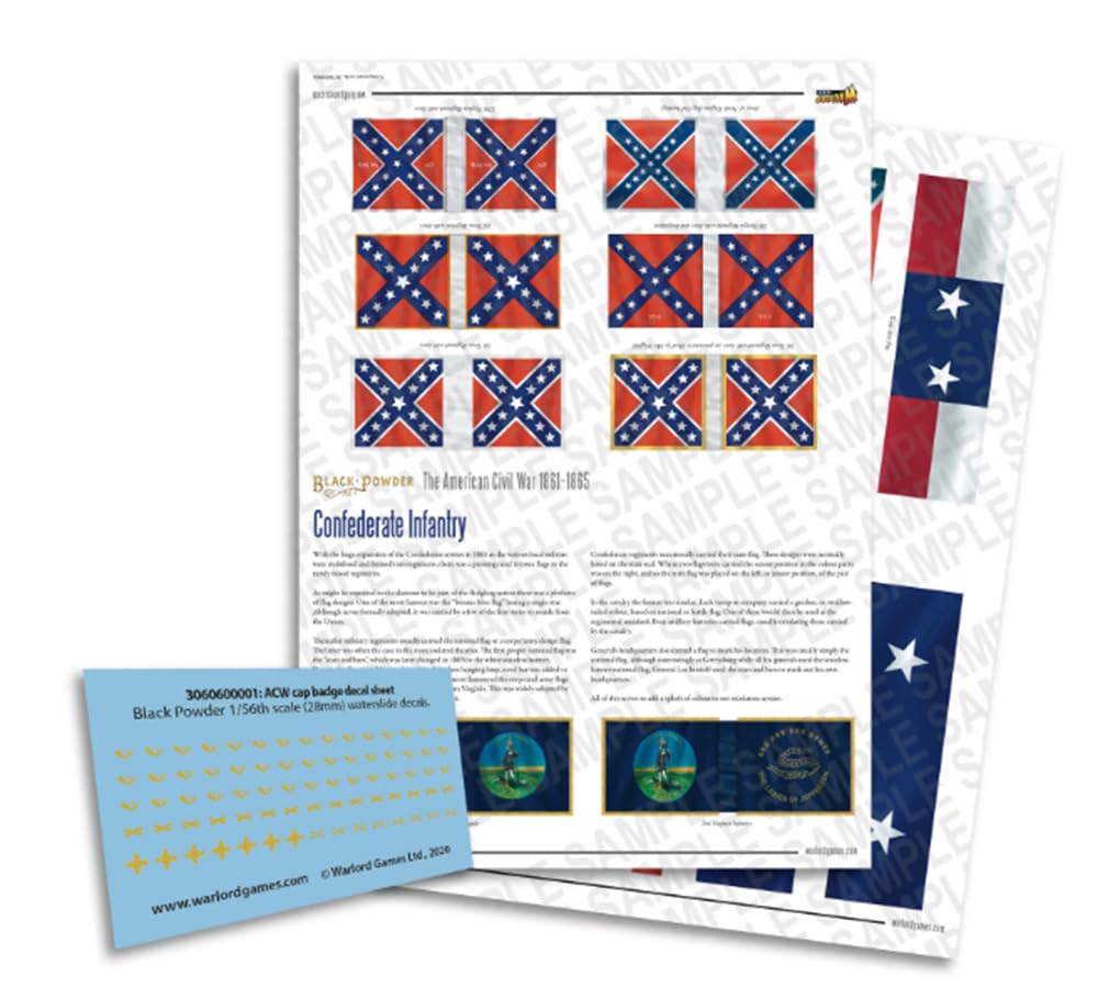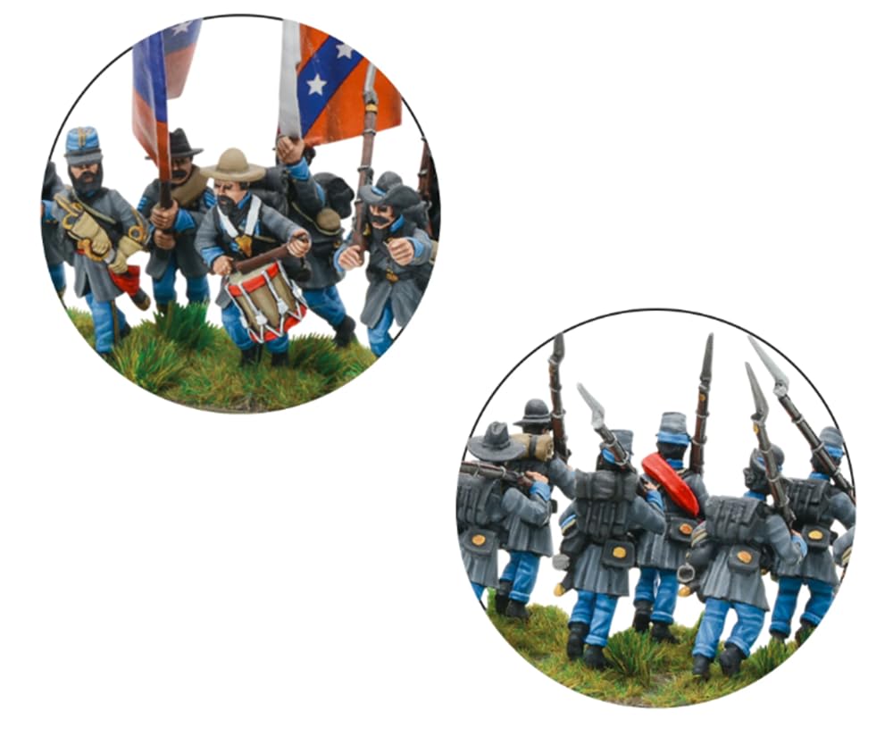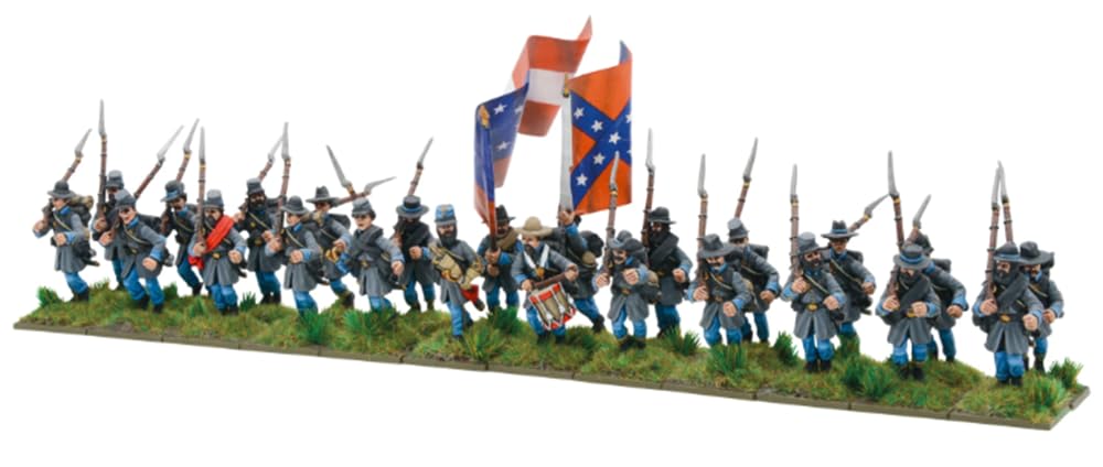 In many civil wars in history, both sides were equipped in a very similar fashion with the color of their uniforms and the flags they fought under being the identifying features. This was no different for the forces of the Union and the Confederacy in the American Civil War, and these miniatures, advancing with their firearms in ‘right shoulder shift’ are equally suited to be painted as either a Union or Confederate regiment. Wearing dark blue tunics, light blue trousers and armed with percussion rifles, the Union soldiers learnt how to maneuver and march great distances to take the war to the south. Early regiments were of mixed quality with few having drilled before, let alone seen active service of any note. By the war’s end they were a tough and efficient fighting body of men, a match for their adversary, ‘Johnny Reb’. Confederate regiments were tough, with many in their ranks used to privation and familiar with firearms. This was just as well, as compared to their northern foes in the Union they were frequently poorly equipped, fed and armed – much of their equipment was taken from Federal prisoners or privately purchased. The better maintained troops favored the Enfield muzzle-loading rifles if available, but many types of rifles were used during the war, even old flintlocks in reserve units. Ragtag they may look, but southern troops had a spring in their step and were renowned for their quick and terrifying charges, many emitting the unearthly, ululating ‘Rebel Yell’ to unnerve their ‘blue belly’ opponents. Box contains 24 Warlord resin figures (including command group), plastic bases, MDF Snake Fence scenery, cap badge decal sheet and full-color flag sheets for both Union and Confederate troops.