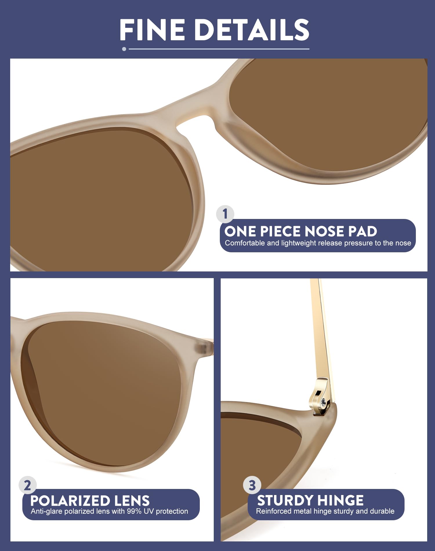 COMFORATBLE & LIGHTWEIGHT -- These vintage trendy sunglasses featured Reinforced metal hinges which is flexible, ultra light and skin-friendly; Integrated nose pad design can bring you a stress-free wearing experience, all the details make it sturdy to use.