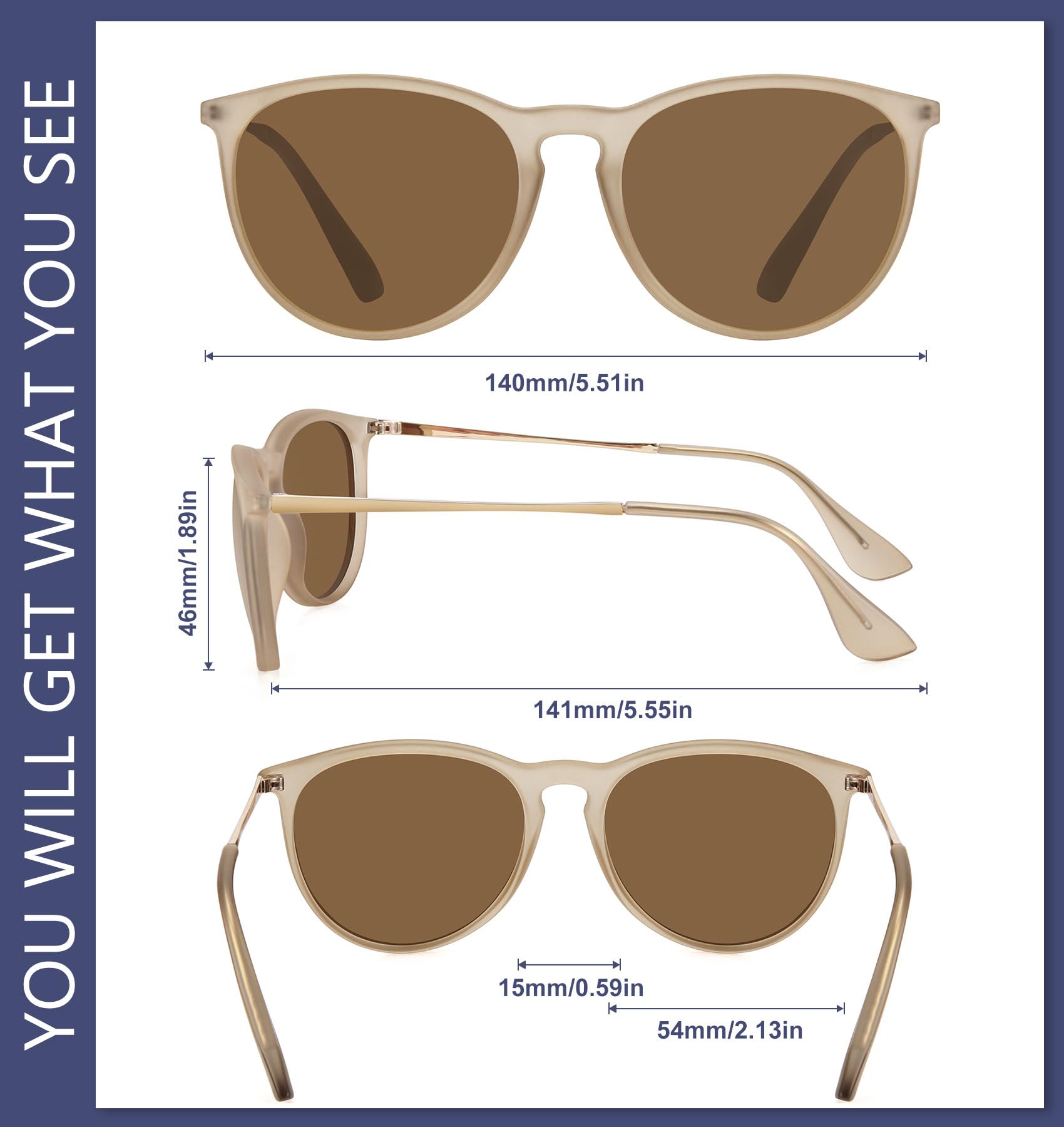 DIMENSIONS -- Lens height: 46mm (1.89inches); lens width: 55mm (2.13inches); temple length: 141mm (5.55inches); nose bridge:15mm (0.59inches); frame length: 140mm(5.51inches). Microfiber Pouch, Cleaning Cloth is Included.