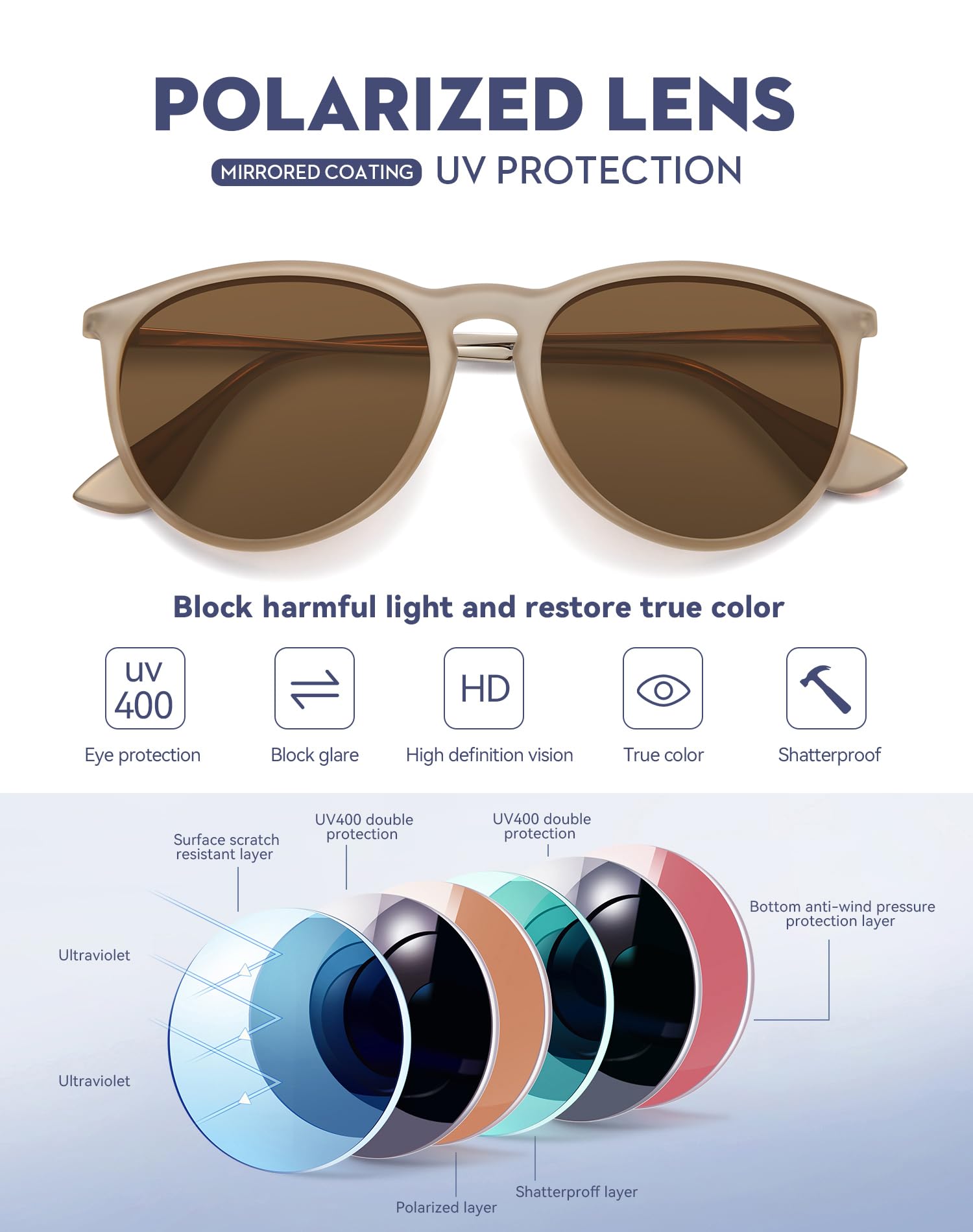 POLARIZED LENS UV PROTECTION - These womens mens sunglasses polarized lens effectively eliminate the glare, restore true color and block the sun's harmful UVA UVB rays. High-definition lenses, with anti-scratch coating, gives you a natural clear vision, will make the field of vision clearer.