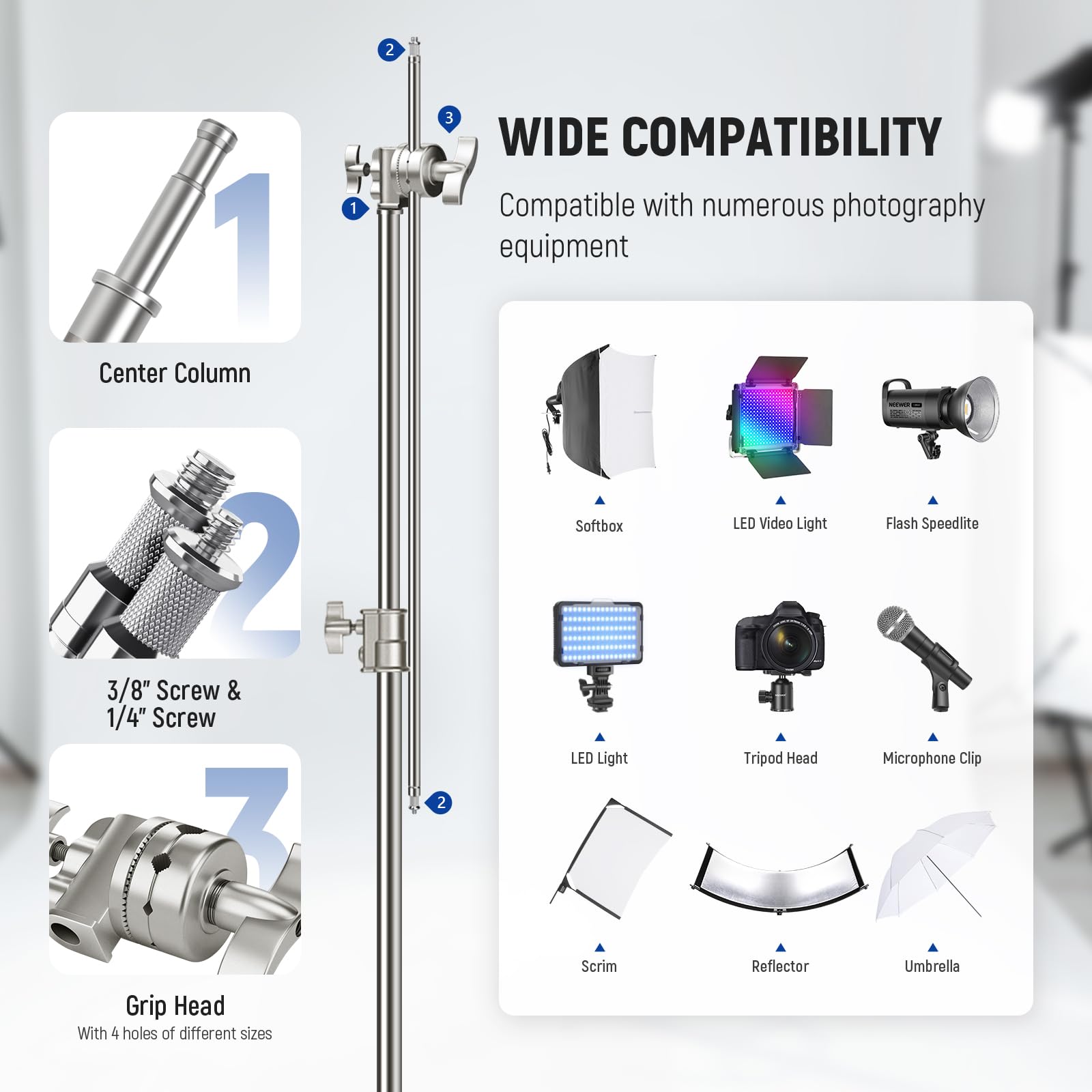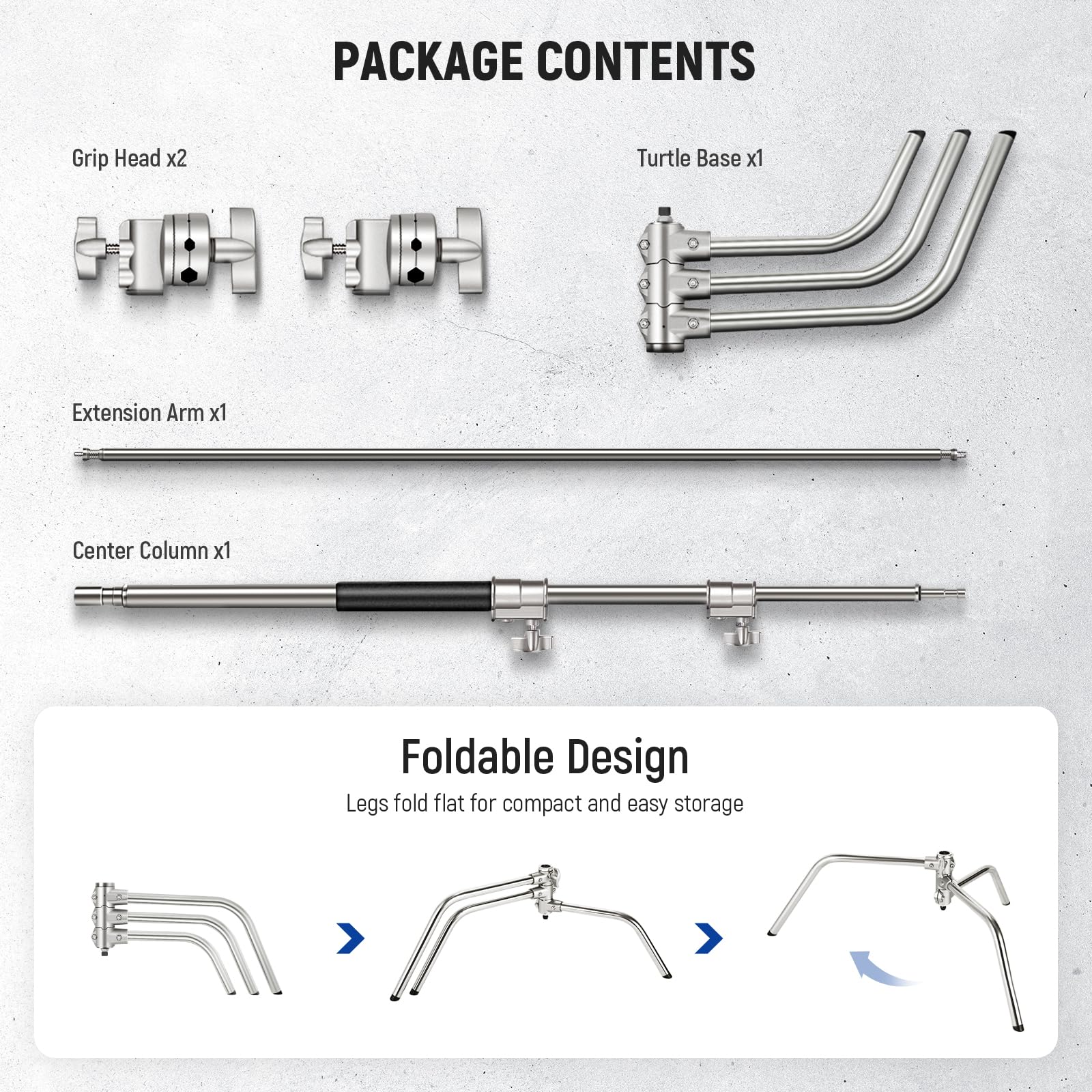 【Heavy Duty 100% Stainless Steel C Stand】 Solidly engineered with sturdy stainless steel, this durable NEEWER C stand with boom arm is a heavy duty mounting solution for studio monolights, LED video lights, softboxes, reflectors, photography umbrellas, and other equipment
