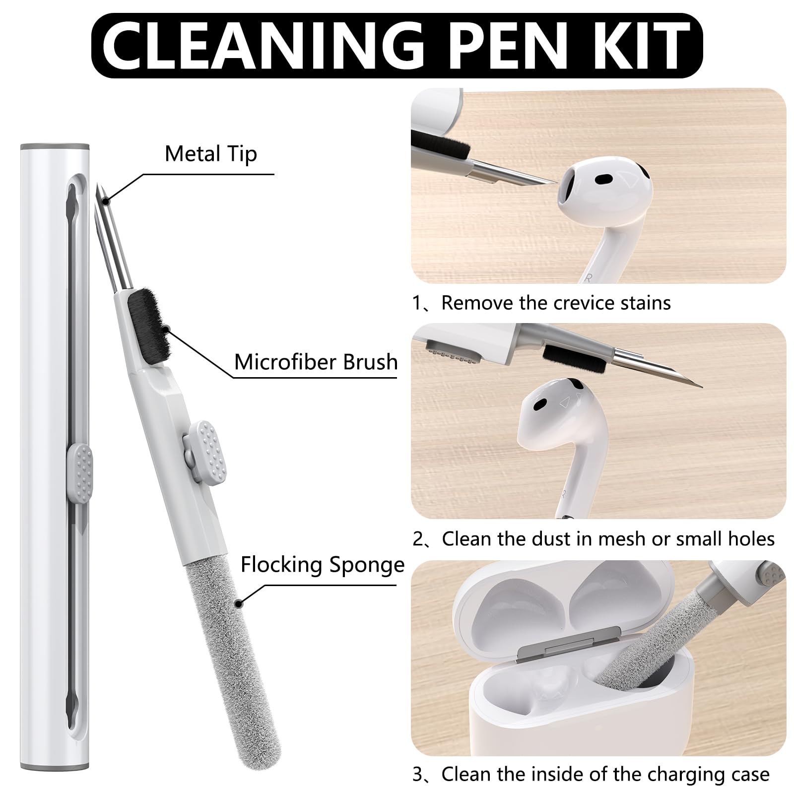 3 in 1 Cleaning Pen: The cleaning pen with metal pen tip, soft brush and the high-density Flocking brush,Can help you remove dust and dirt from your headphones,Always keep your AirPods as new
