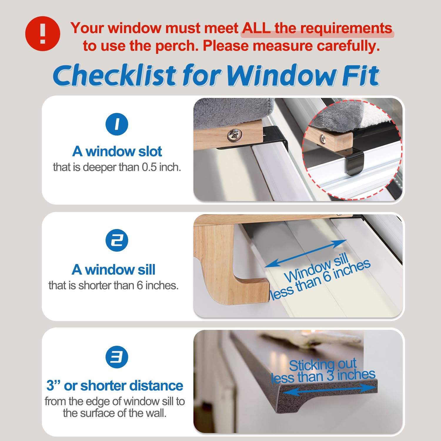 【No Suction Cups or Drilling Needed】 **lmportant: Check for WINDOW REQUIREMENT** Ensure your window has a SLOT at least 0.5 inches deep for the perch to hook onto (hook thickness: 0.08 inch). The bracket is widely adjustable to fit various setups, with a maximum window sill depth of 9 inches.
