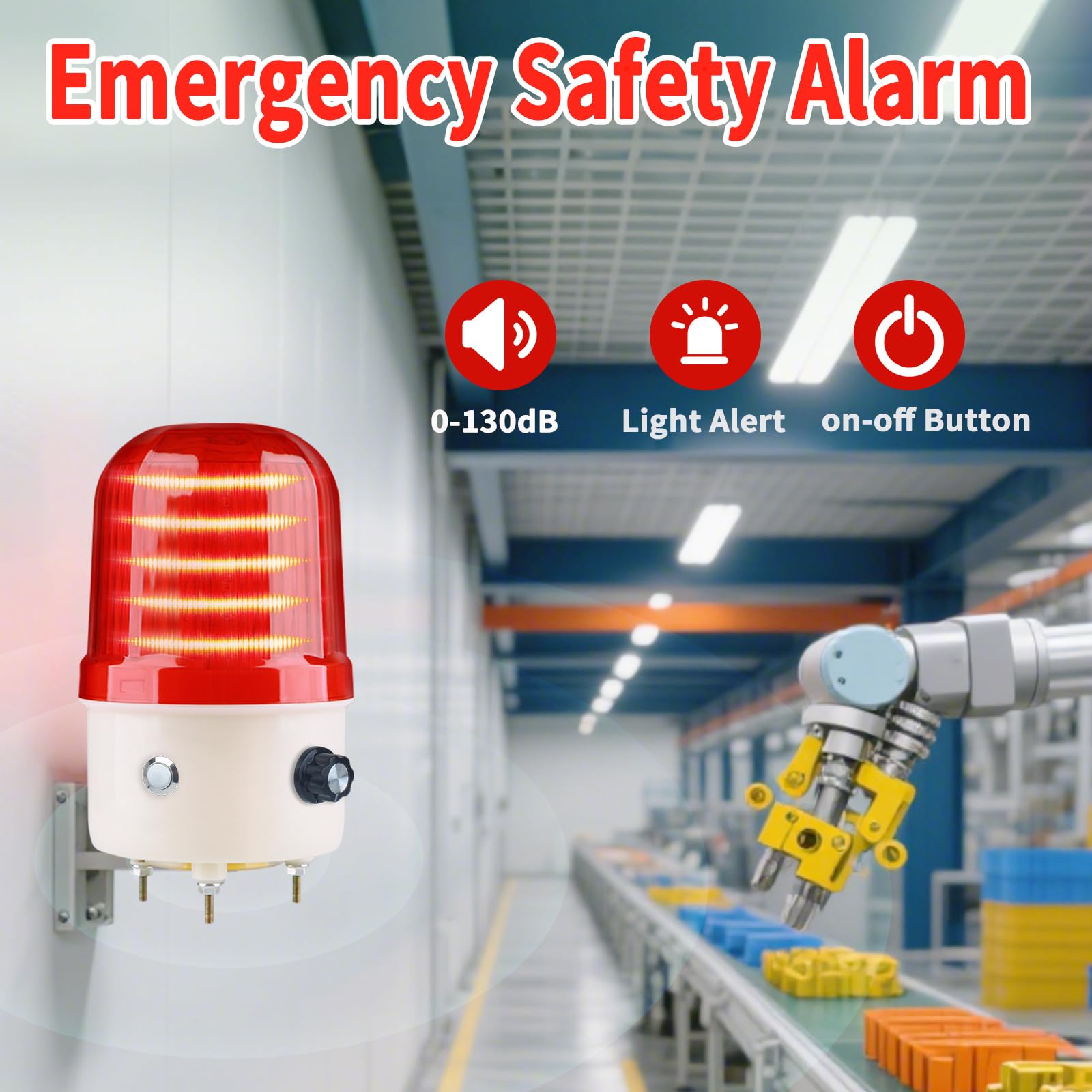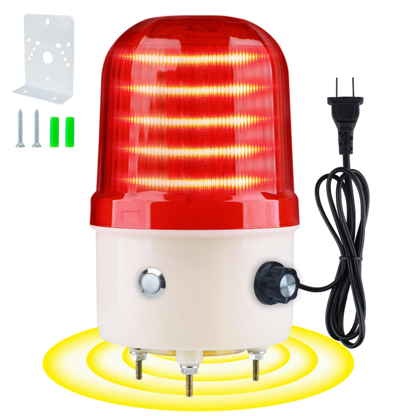 AC110V Plug with Switch: Features a convenient plug-and-play design with an integrated switch for easy control, eliminating the need for wiring. Volume Control: Offers adjustable volume from silent to 120 decibels, suitable for a wide range of environments. Durability: Constructed with polycarbonate and ABS plastic for long-lasting strength and resilience in tough conditions. Size & Mounting: The compact 170*87 mm size is portable and fits indoor settings, with secure bolt mounting adaptable to various surfaces. Rotating Light: Provides 360-degree alert visibility, enhancing emergency response awareness. Applications: Versatile for construction, warehouses, parking, traffic direction, and security areas to ensure safety and caution. Energy Efficiency: With a low 2-3 watt consumption, it promotes sustainability and reduces energy expenses over time.