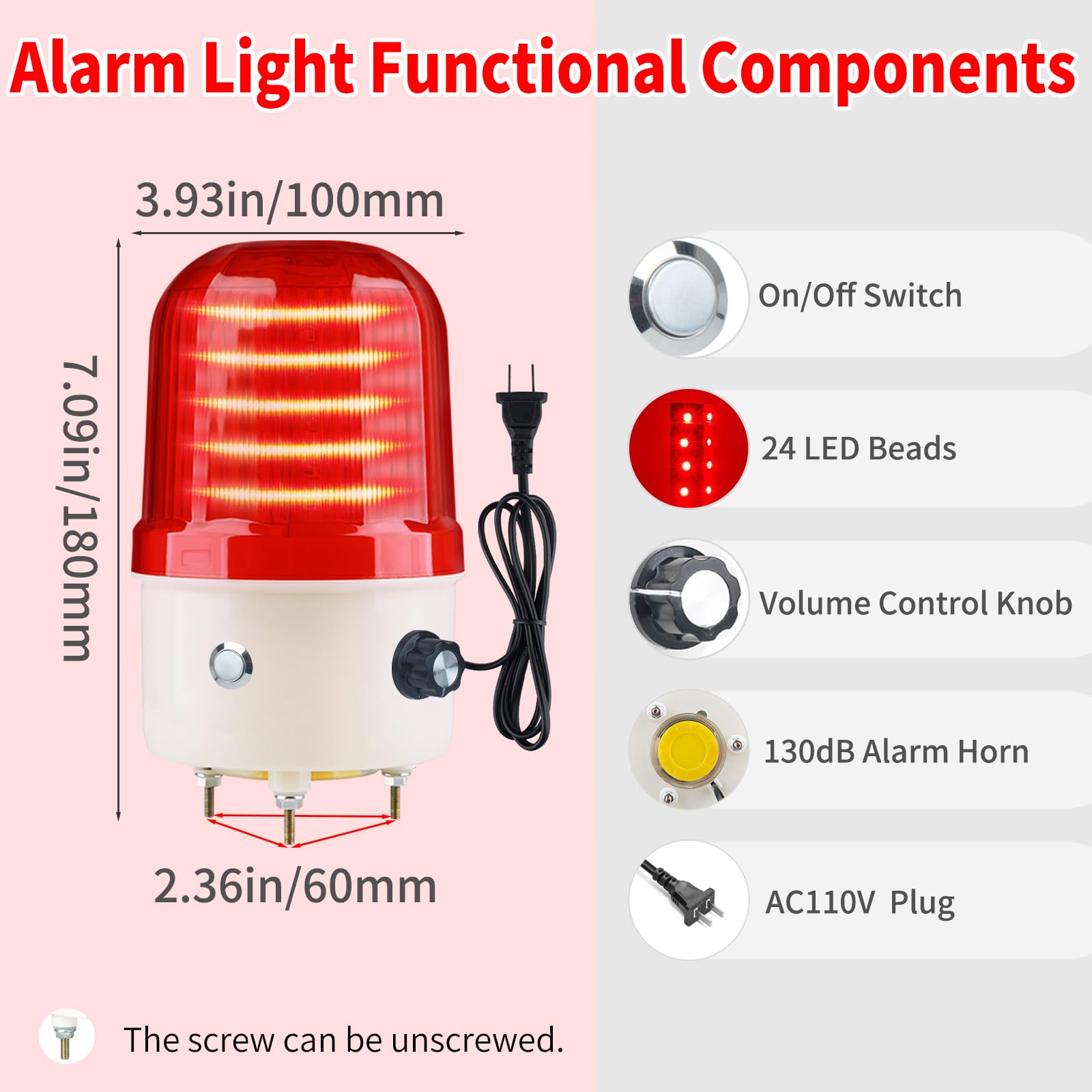 Power Switch: Includes a red rotating strobe light with a power switch and a 110V cord with a plug.