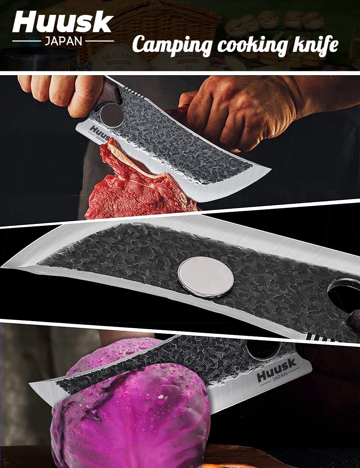 Competent for Various Tasks: This huusk meat cleaver knife is designed for kitchen, camping, hiking, and barbecue. The arched shape blade is perfect for different kitchen tasks like mincing, slicing and dicing meat, vegetables, fruits, detaching chicken and deboning beefsteak. While the plain blade part can be used to separating ribs, cutting branches and for outdoor survival.
