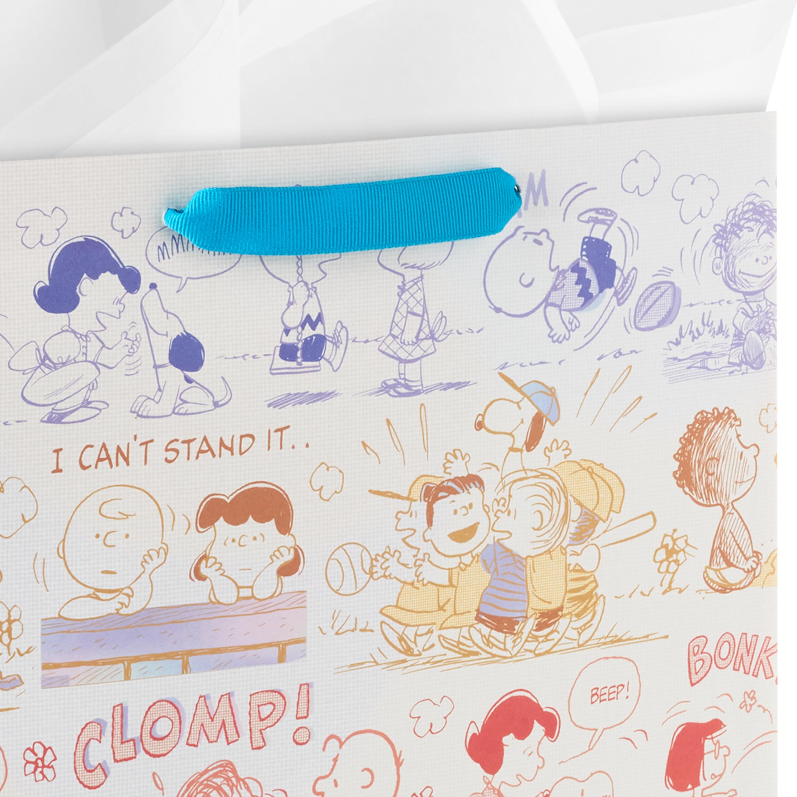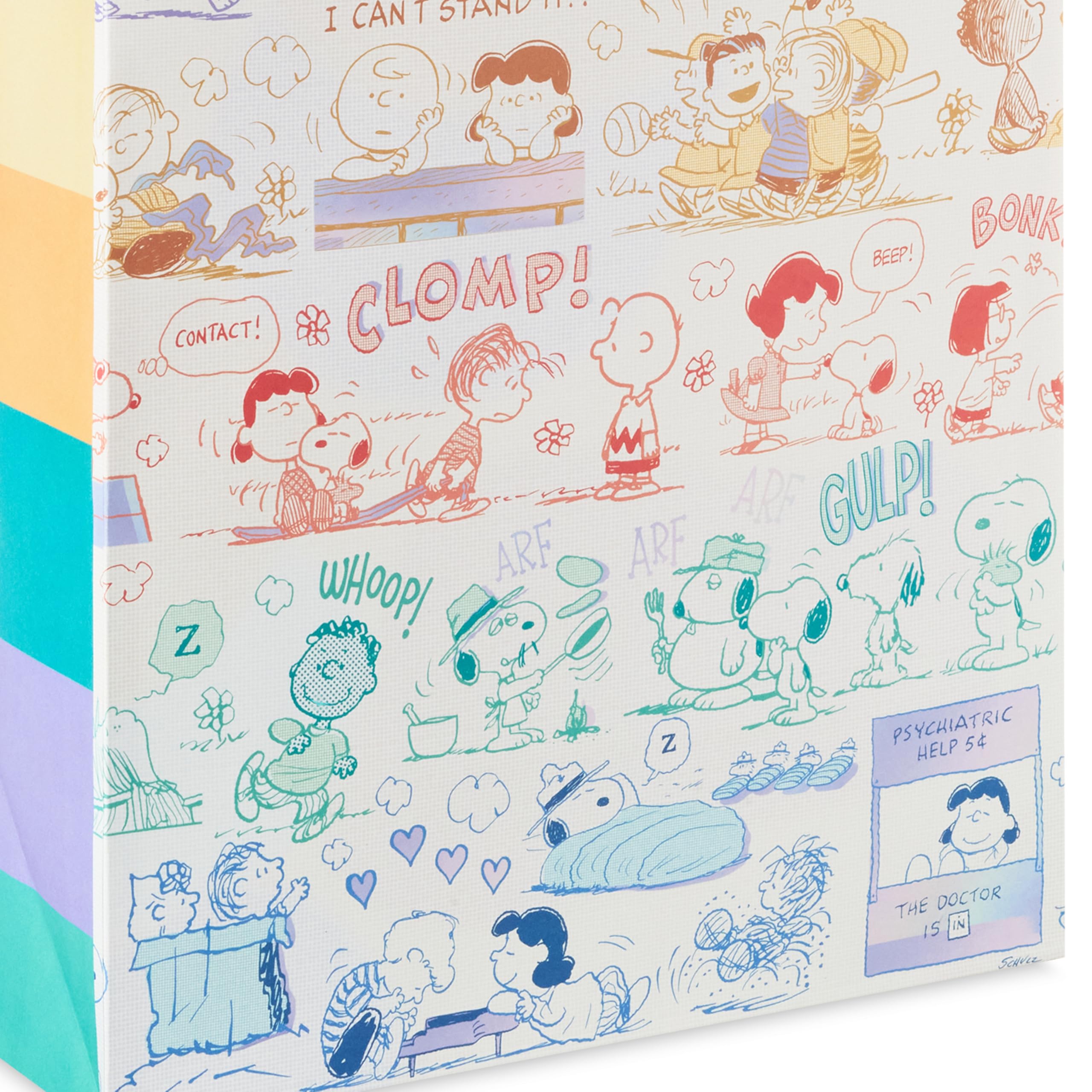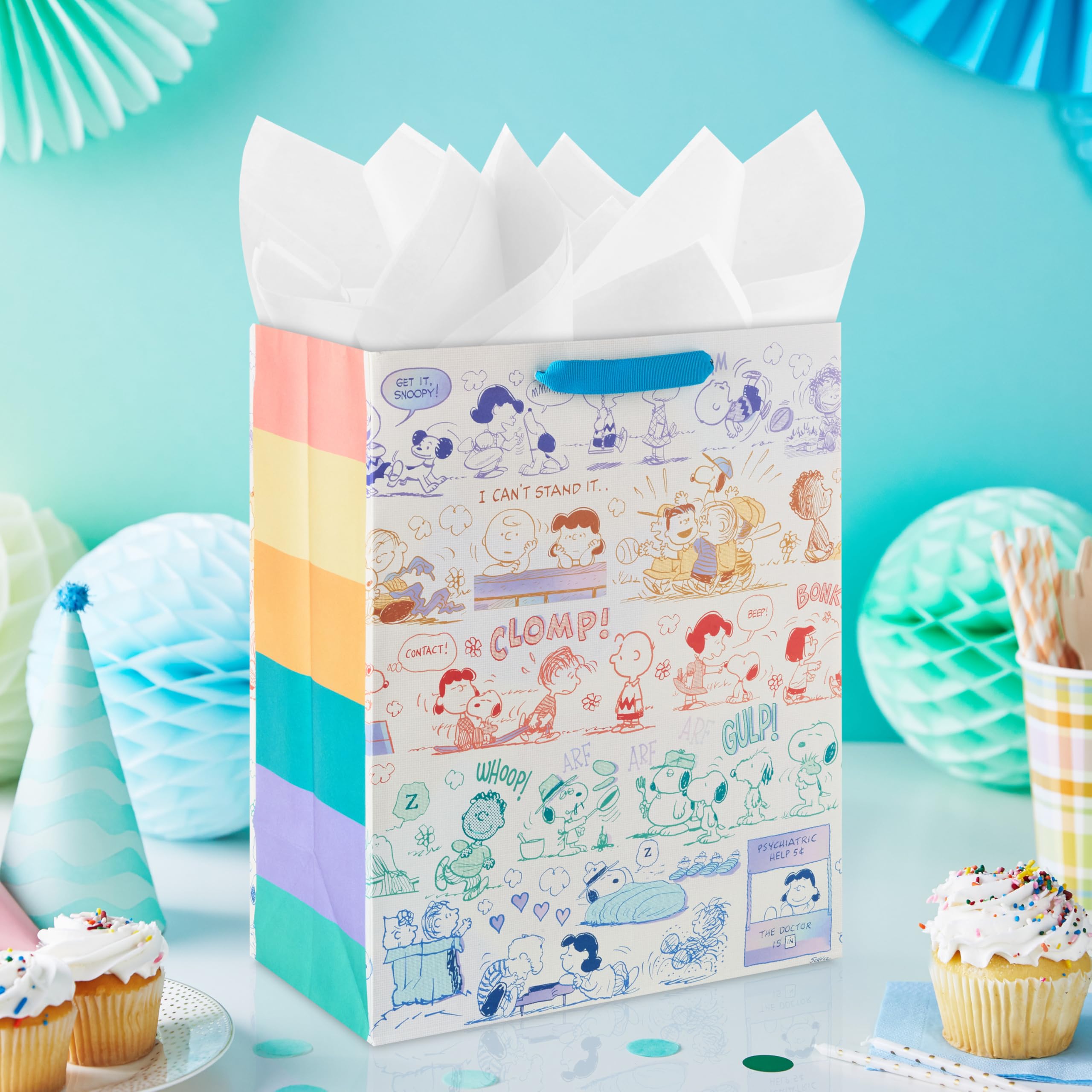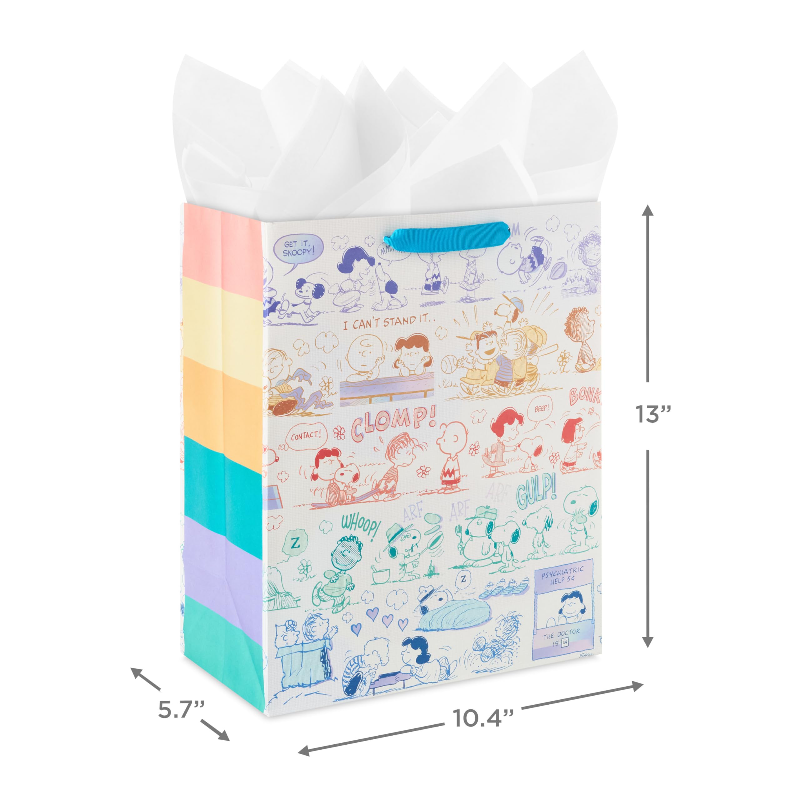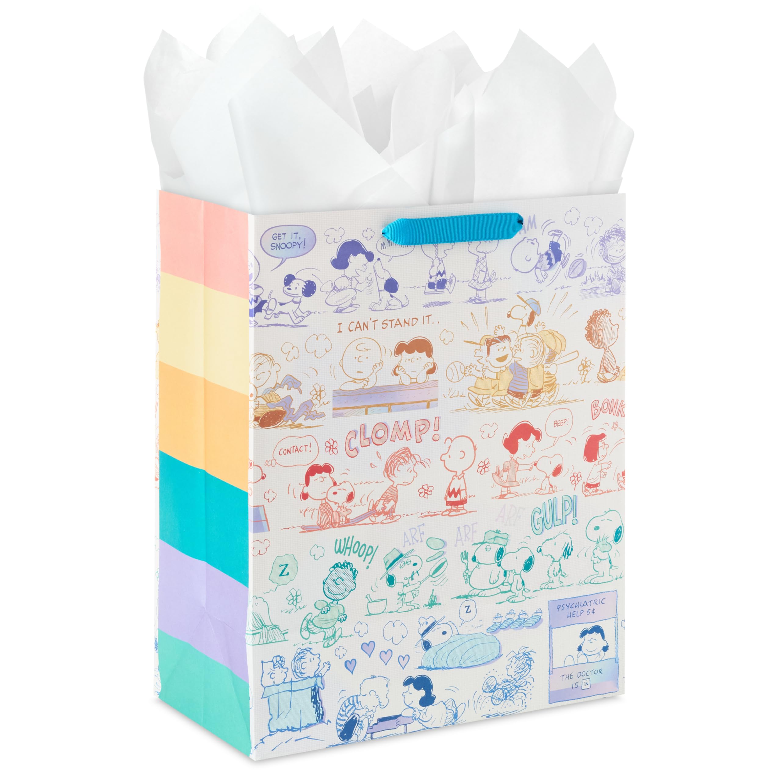 Delight your favorite Peanuts fan with this colorful gift bag with tissue paper. Featuring rows of classic scenes from the beloved comic strip, this gift bag is perfect for celebrating kids, grandchildren, friends, fans, collectors and more. Purchase includes 3 sheets of tissue paper for easy gift wrapping. The Hallmark brand is widely recognized as the very best for greeting cards, gift wrap, and more. For more than 100 years, Hallmark has been helping its customers make everyday moments more beautiful and celebrations more joyful.