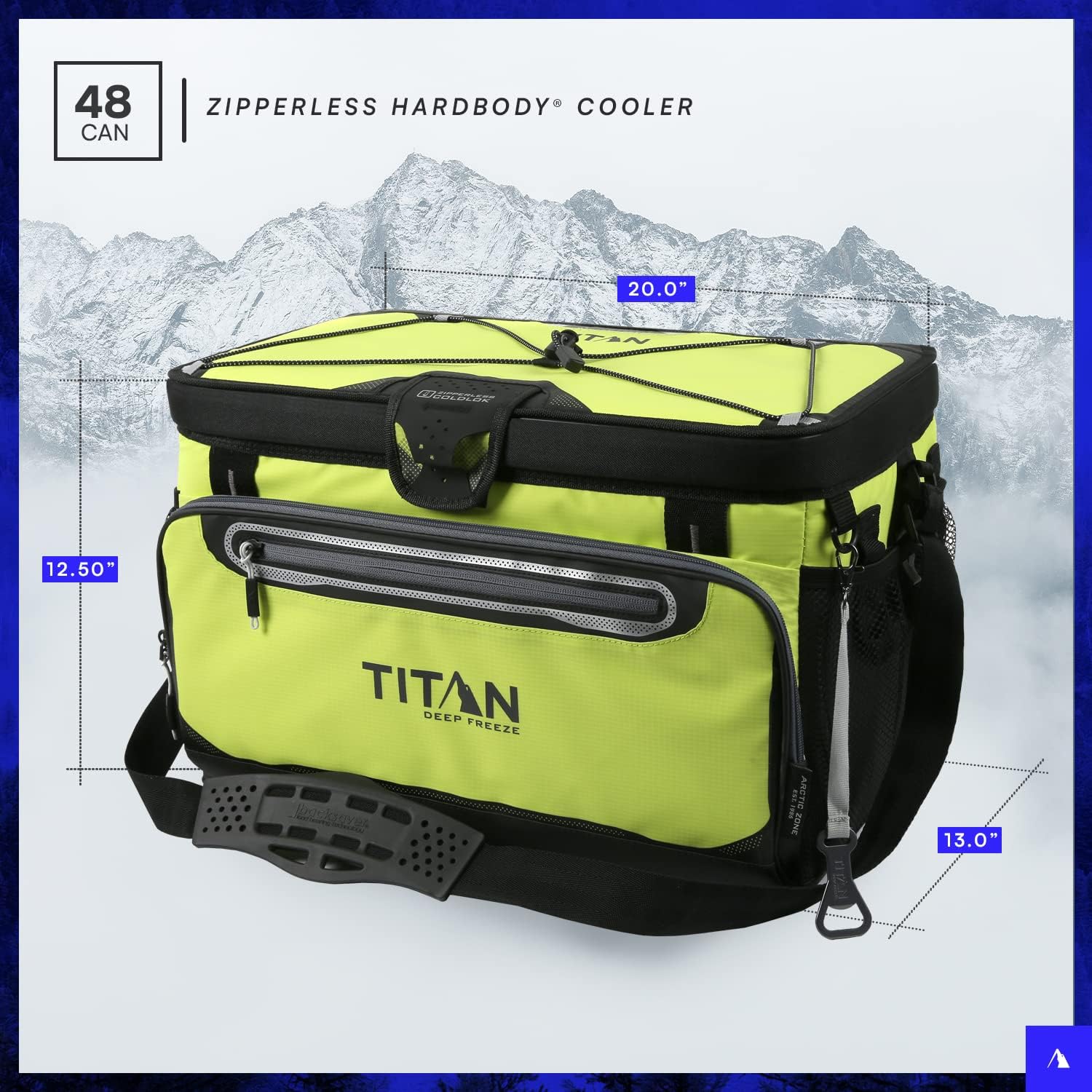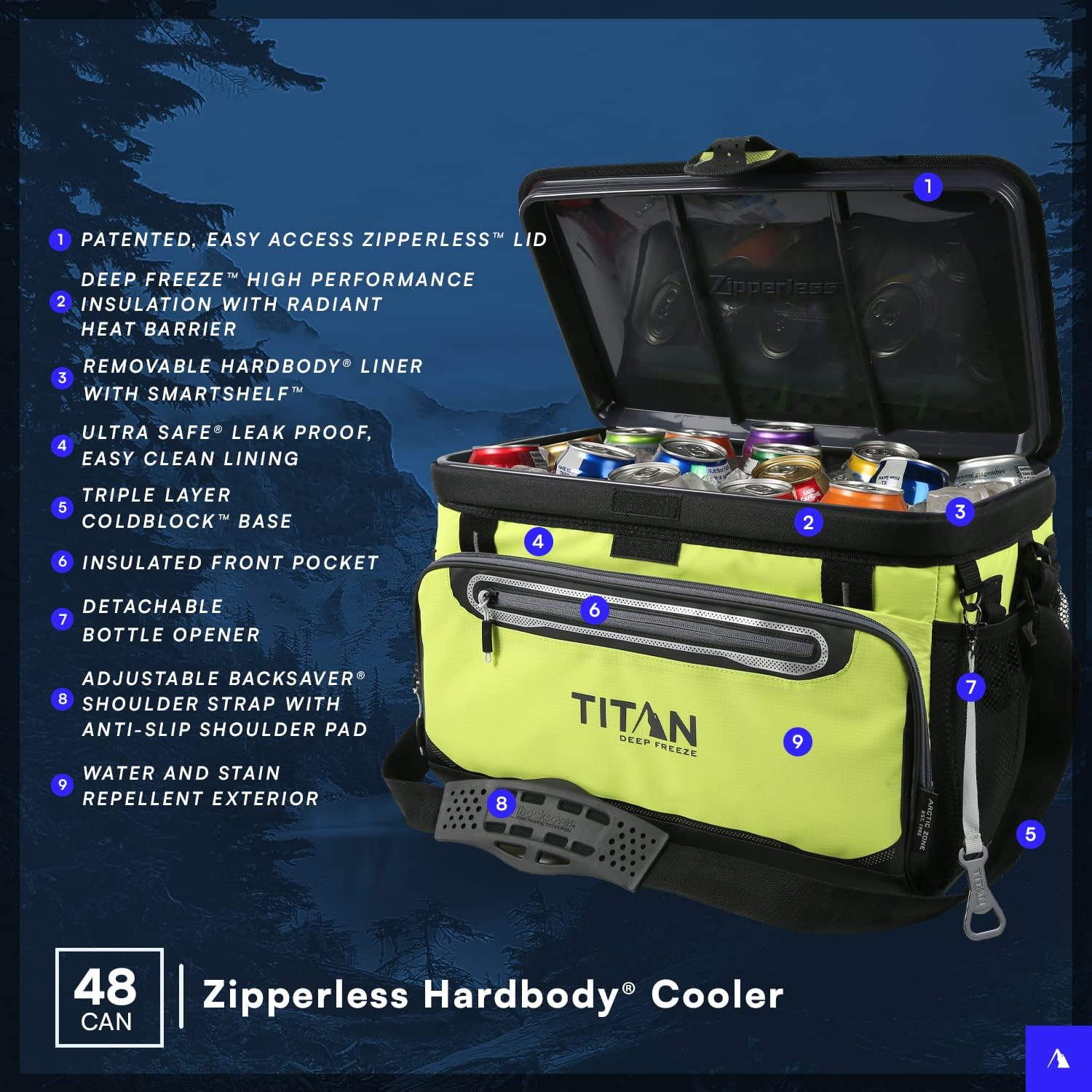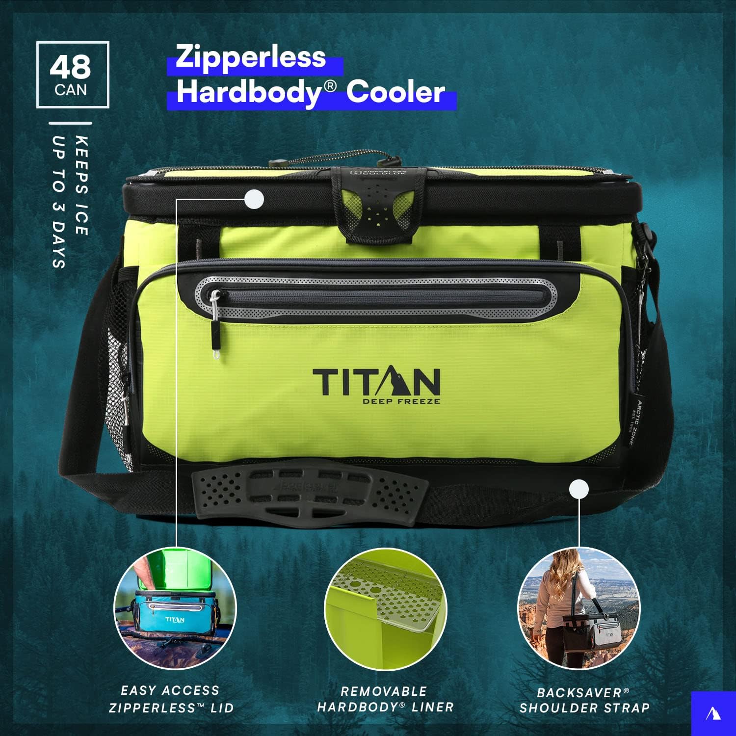 TITAN DEEP FREEZE ZIPPERLESS HARDBODY COOLER: Zipperless cooler features a patented, "flip-open" Zipperless lid for quick access to food and drinks; Keeps ice up to three days and holds up to 48 cans