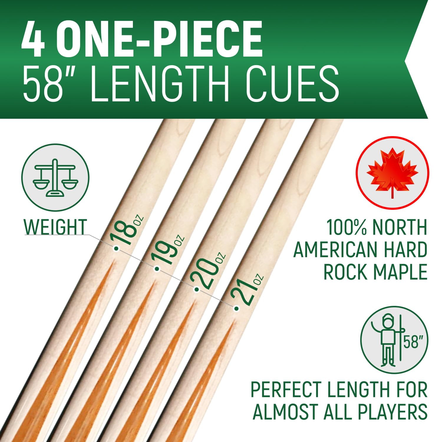 Players one-piece cues feature 100% North American Hard Rock Maple with true four-prong construction and a host of finishing touches to enhance playability and durability - they’re the best Maple one-piece cue in the price range and represent a solid value for any commercial space or home room. 4 Cues option includes: 1 - 18oz cue, 1 - 19oz cue, 1 - 20oz cue, 1 - 21oz cue.