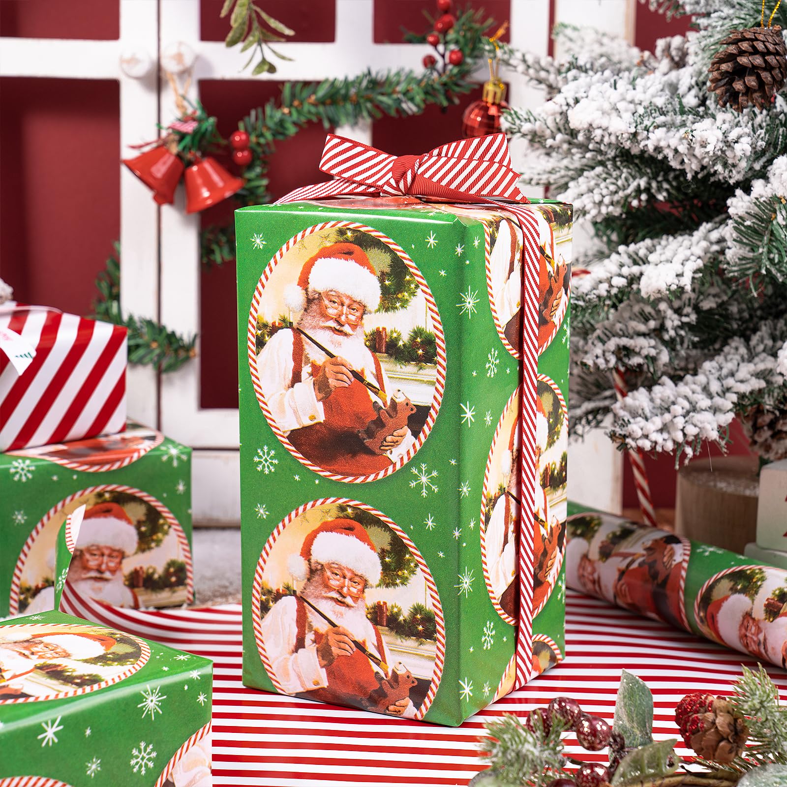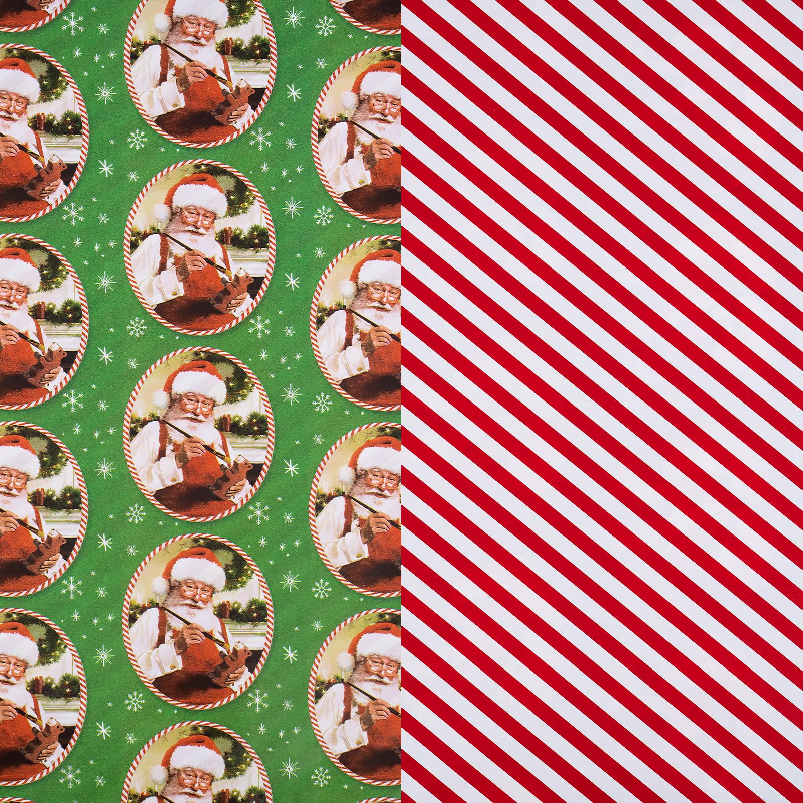 Adorable Christmas Design: Features a heartwarming vintage santacClaus illustration on a green background with white snowflakes on one side, and a red and white candy cane stripe on the reverse, switch between classic and fun in one roll