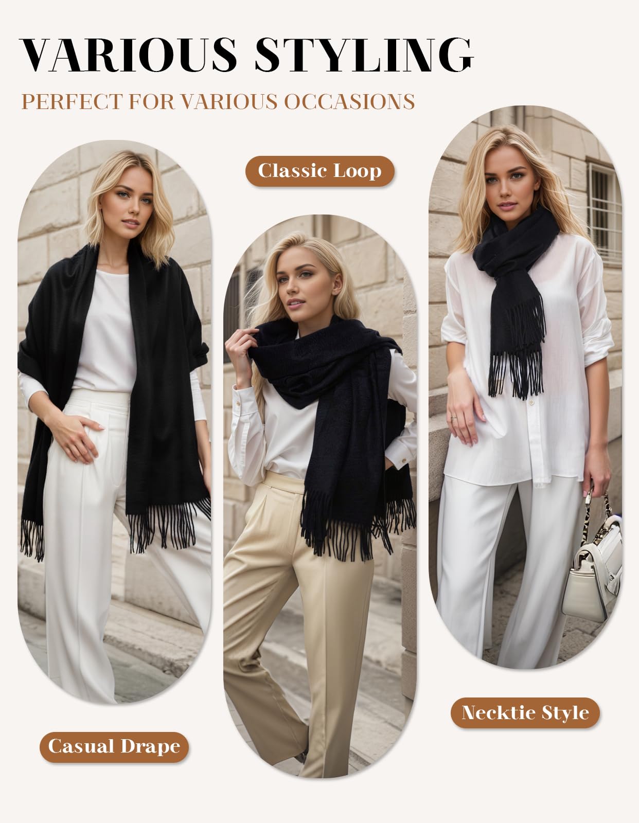 MATERIAL: This scarf is crafted from a soft, cozy fabric that feels as luxurious as cashmere. It’s large, warm, and thick, yet surprisingly lightweight—perfect for those chilly evenings outdoors.
