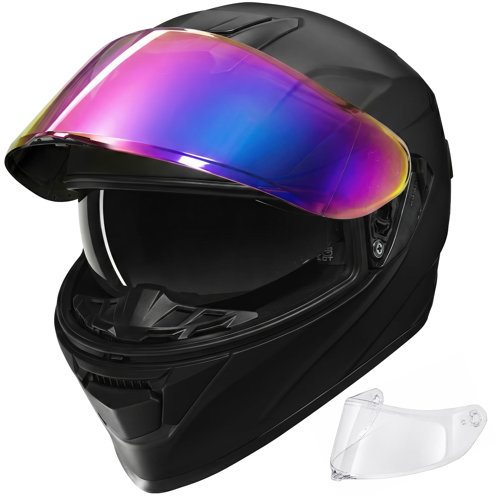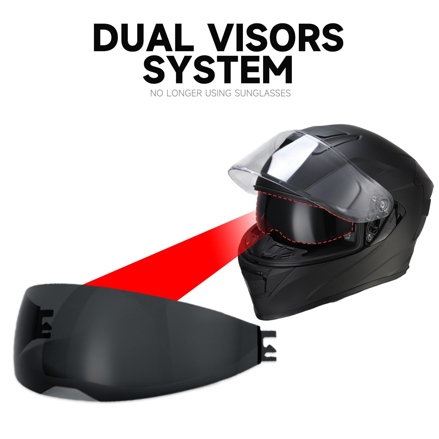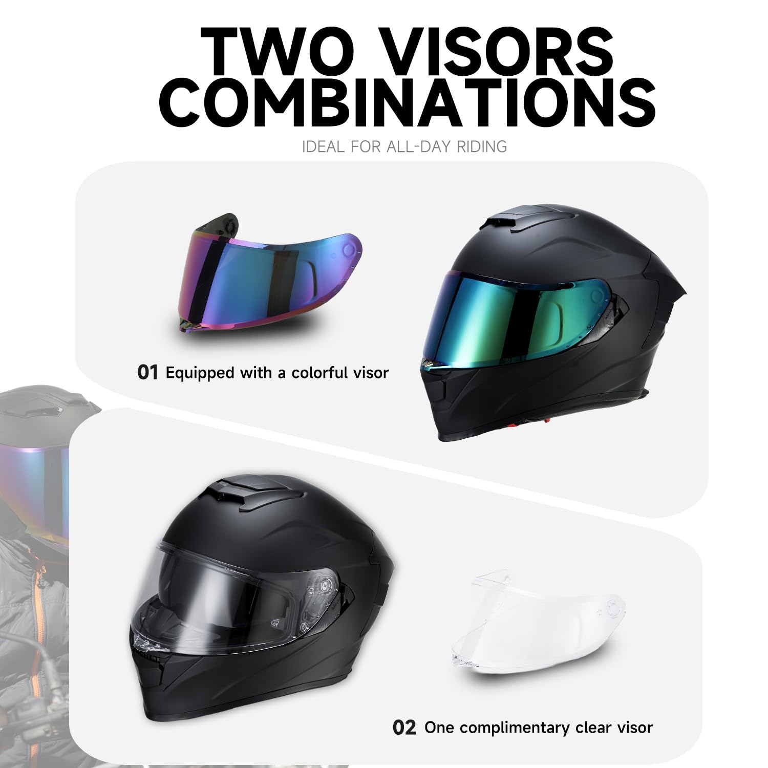 【Dual Visor System + Extra Tinted Shield (3 Visors Total)】 Designed with a clear outer visor and a built-in drop-down sun visor, plus an additional tinted visor included for replacement or customization. Easily adapt to day, night, and changing light conditions—ideal for year-round riding and holiday gifting.