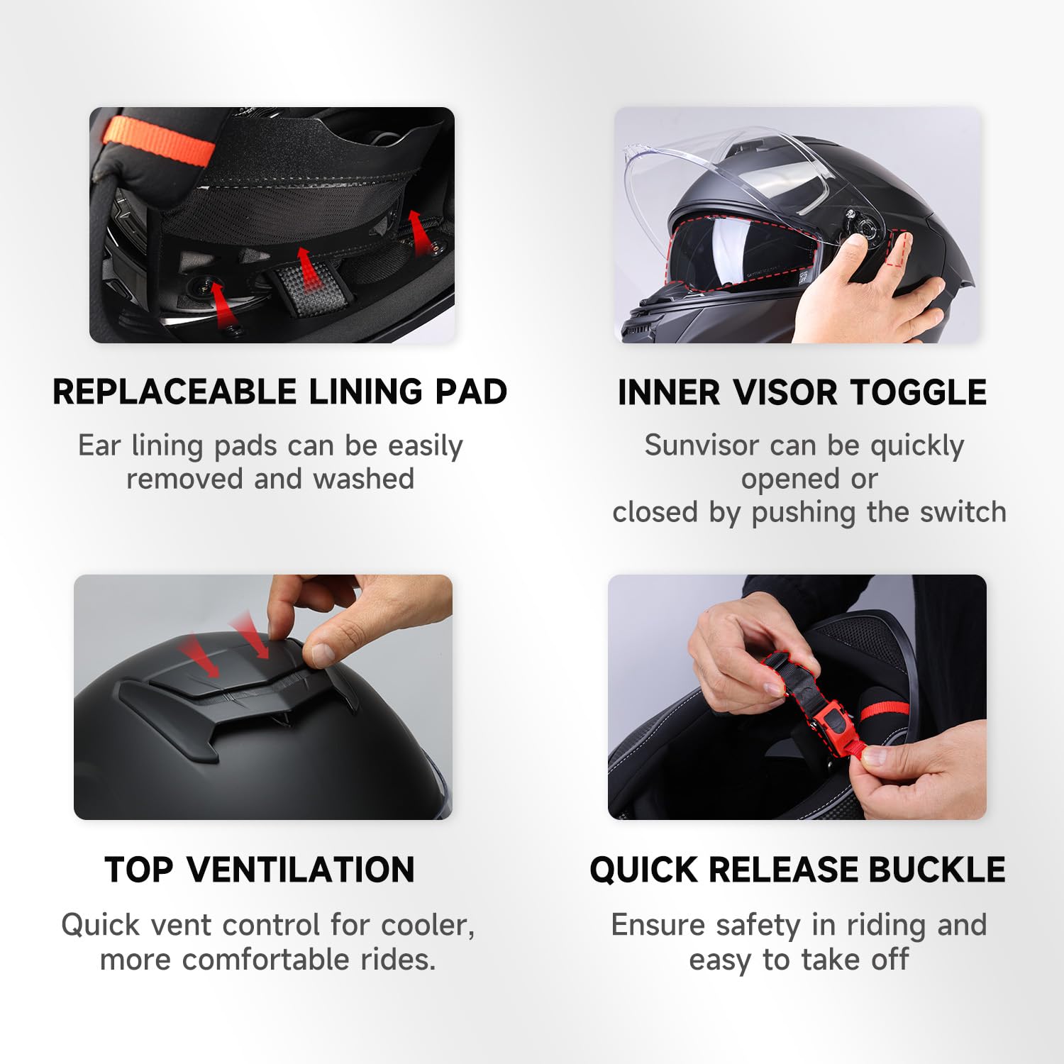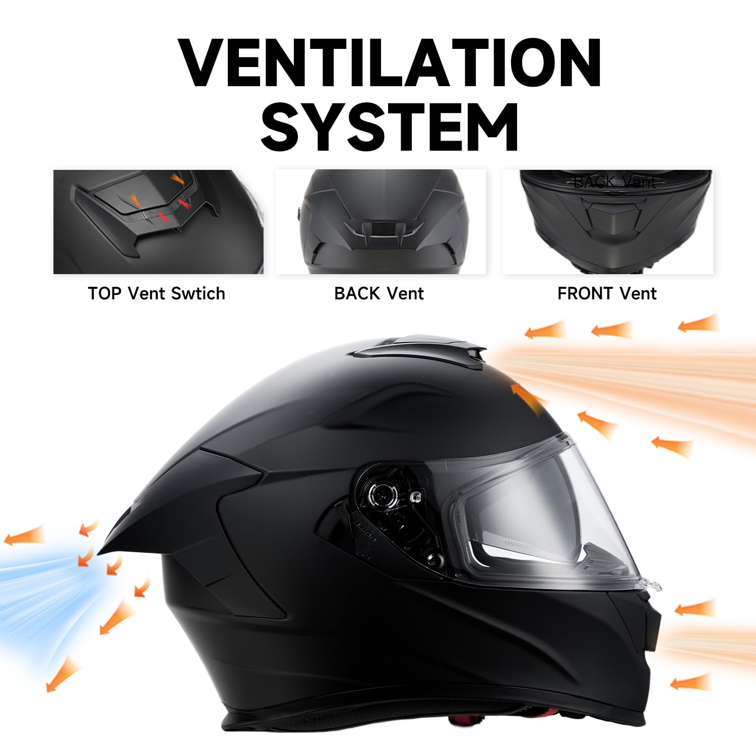 【Adjustable Top Ventilation for Controlled Airflow】 Features an adjustable top vent switch that allows riders to control airflow based on riding conditions. Front and rear vents work together to improve ventilation, reduce fogging, and maintain comfort without increasing wind noise.