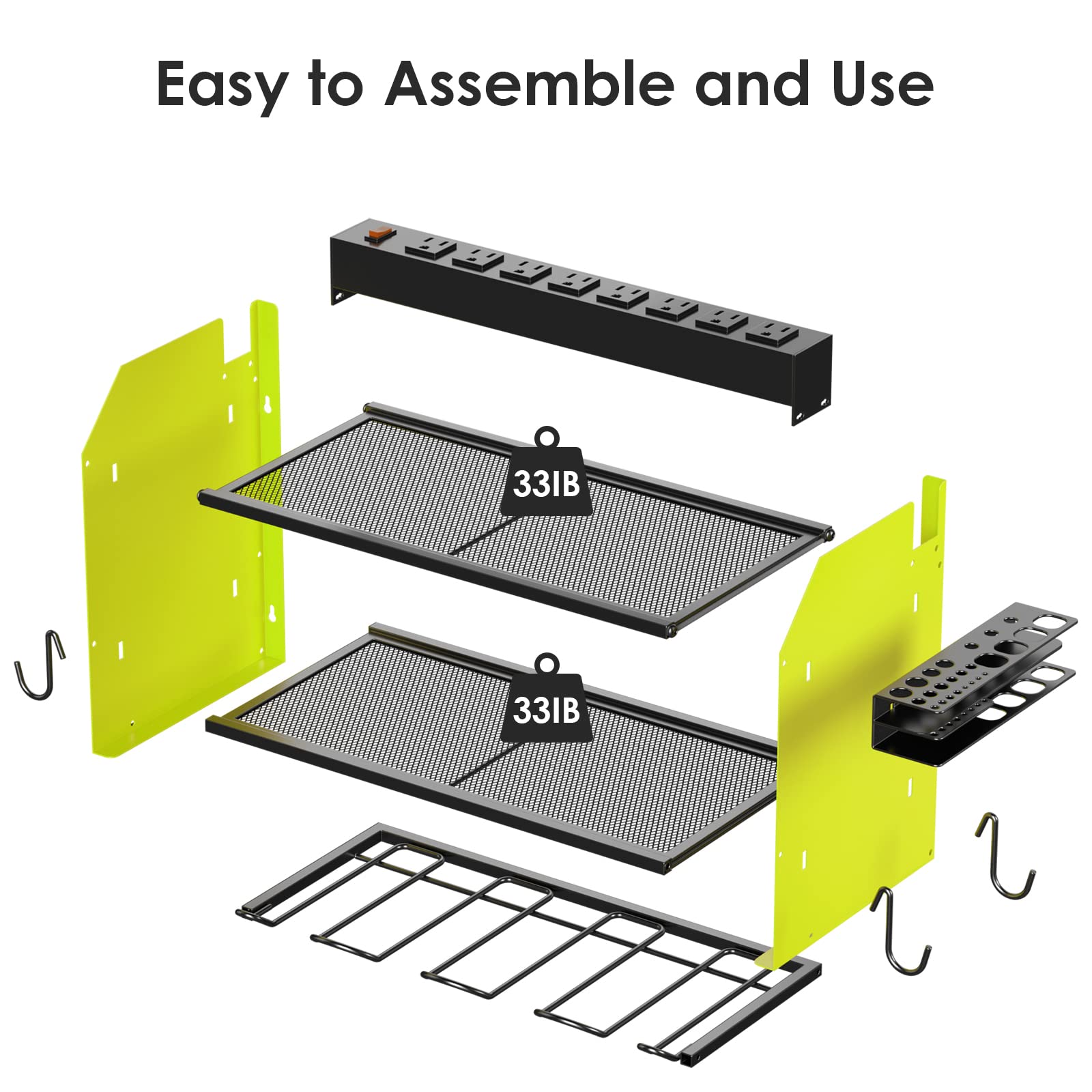 Wall mount power tools organizer come with 4 slots, 4 hooks and drill bit rack, built-in power strip, double layer structure can keep rechargeable tools organized in the work area and save your bench space. The tools in the picture are for demonstration purposes only and are not included.