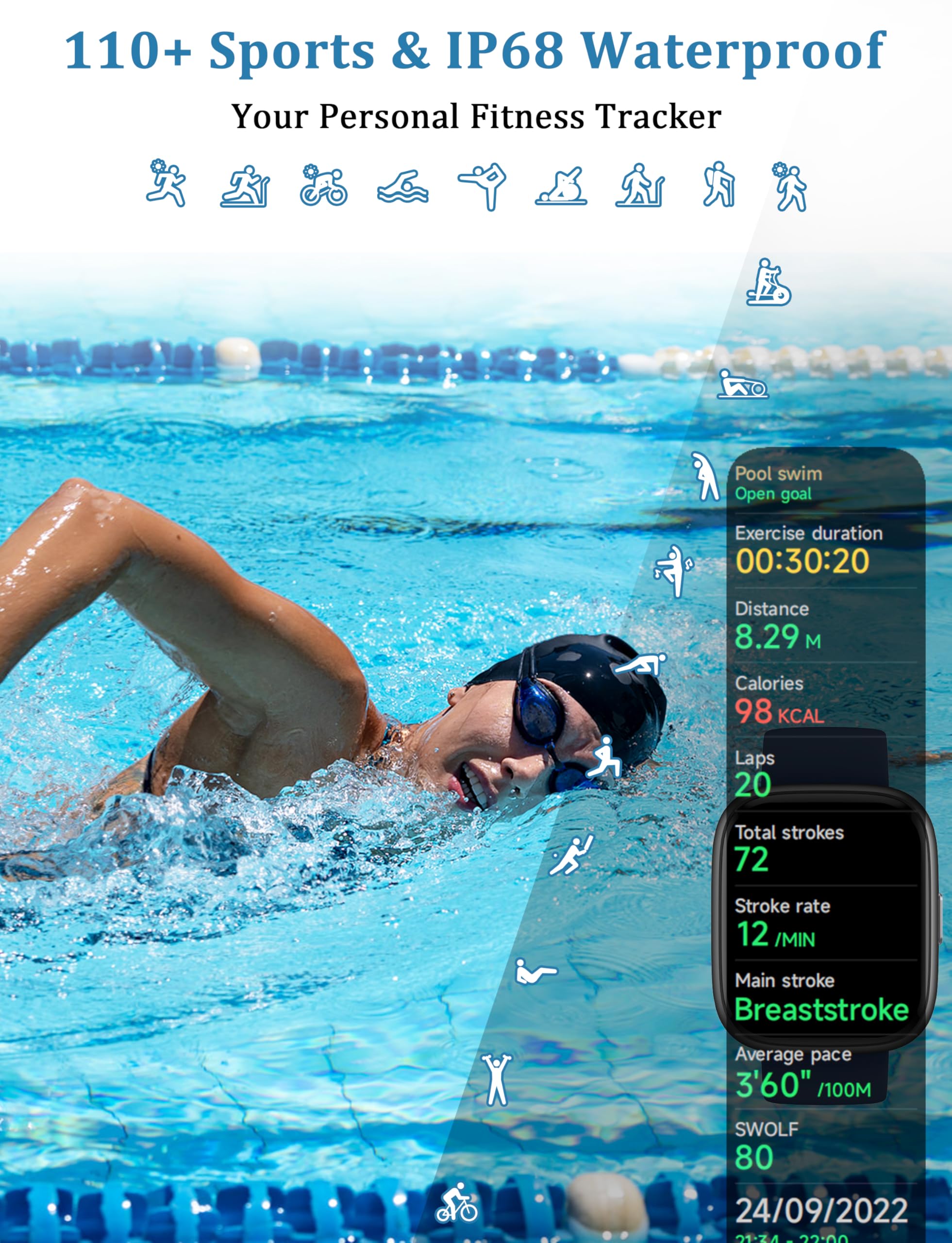 Versatile Sports Tracking Smart Watches for Women & Men: The sports watch supports over 100 sports modes,including Running, Walking, Hiking, Badminton, Basketball, Boating, Climbing, Cycling, Fitness, Football. Swimming, Yoga & More. This fitness tracker provides detailed insights for all your activities. It automatically detects running and walking, recording calories, steps, and distance effortlessly. Its IP68 waterproof rating allows for use without worry during swimming and other water-based workouts. 𝐃𝐨𝐧'𝐭 𝐰𝐞𝐚𝐫 𝐢𝐭 𝐢𝐧 𝐡𝐨𝐭 𝐛𝐚𝐭𝐡𝐬, 𝐬𝐚𝐮𝐧𝐚𝐬 𝐨𝐫 𝐝𝐢𝐯𝐢𝐧𝐠.