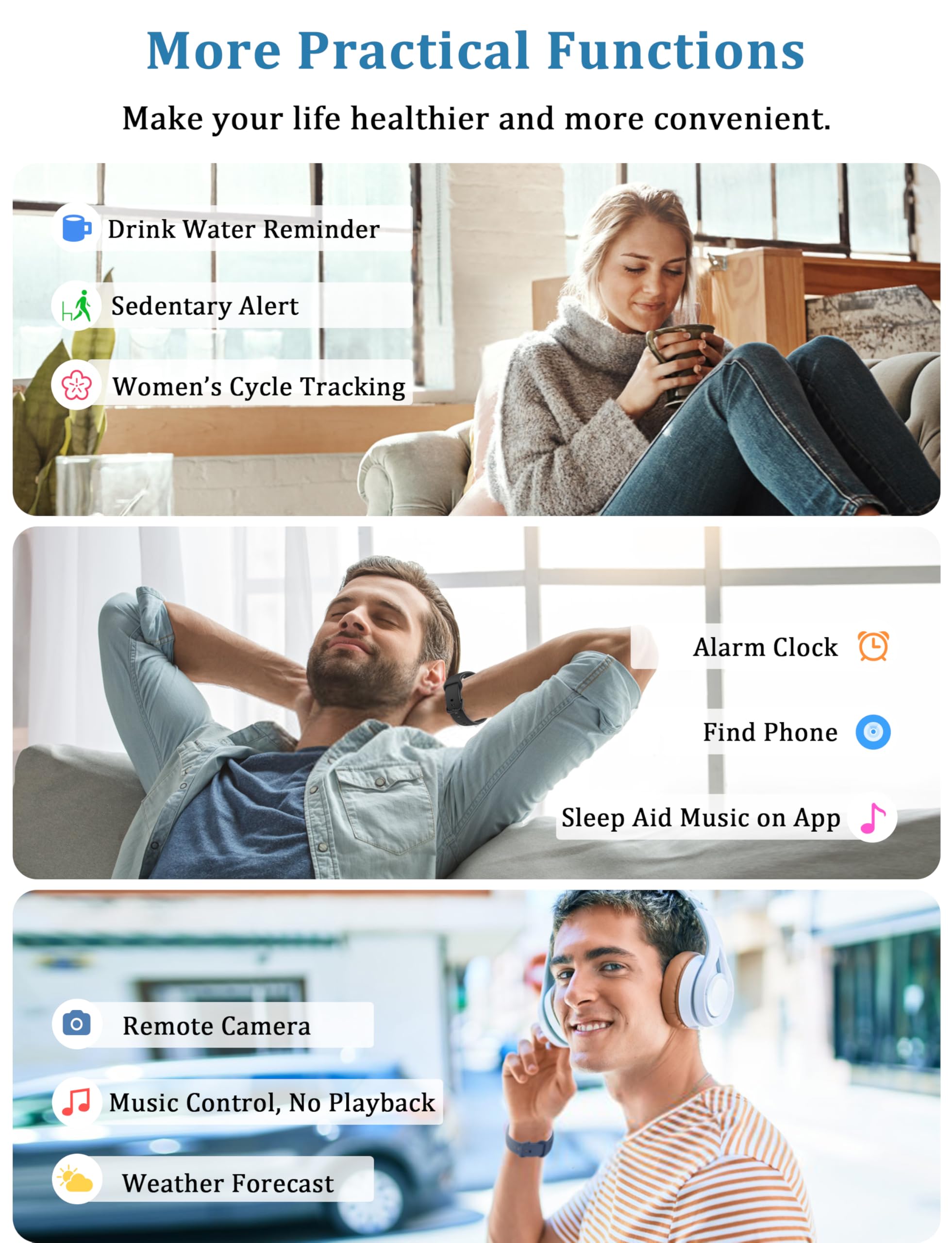 Advanced 24/7 Health Tracking Fitness Watch: Experience thorough health management with continuous heart rate and blood oxygen monitoring. This smartwatch can track stress levels and manage stress effectively with breathing exercise. With automatic sleep monitoring, you can analyze and enhance your sleep quality. Additional features such as menstrual cycle tracking, drinking water reminders, and activity alerts make this watch an essential health companion.