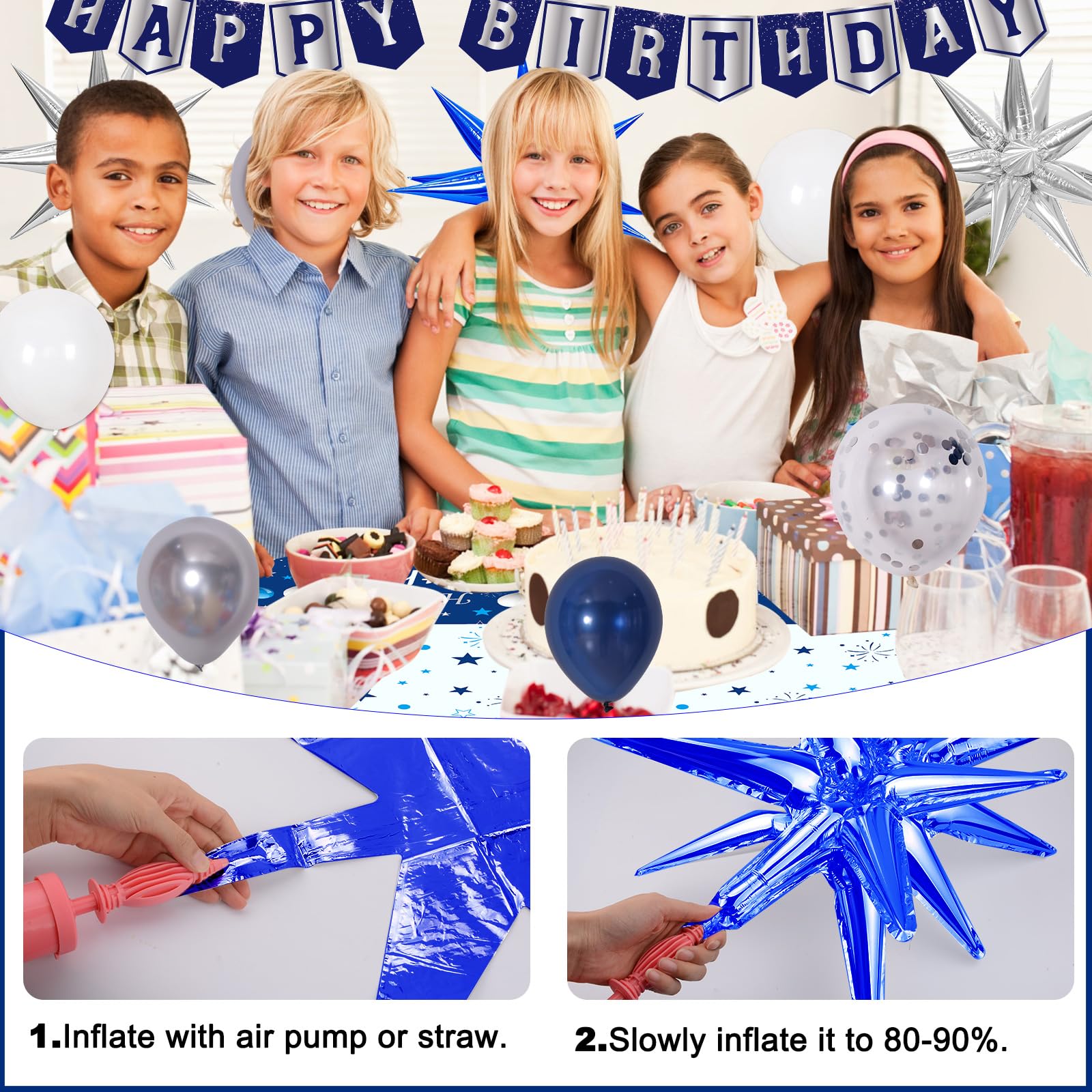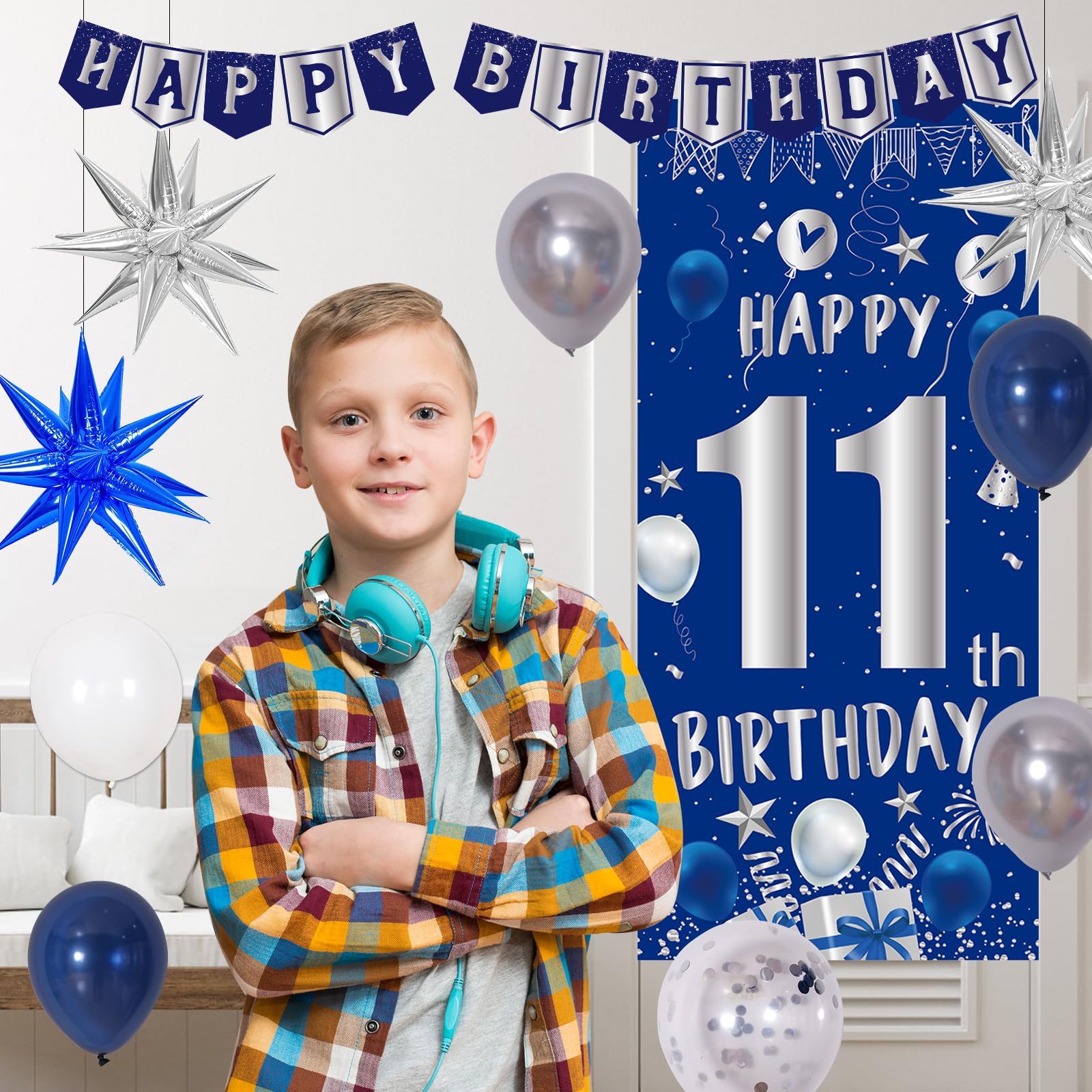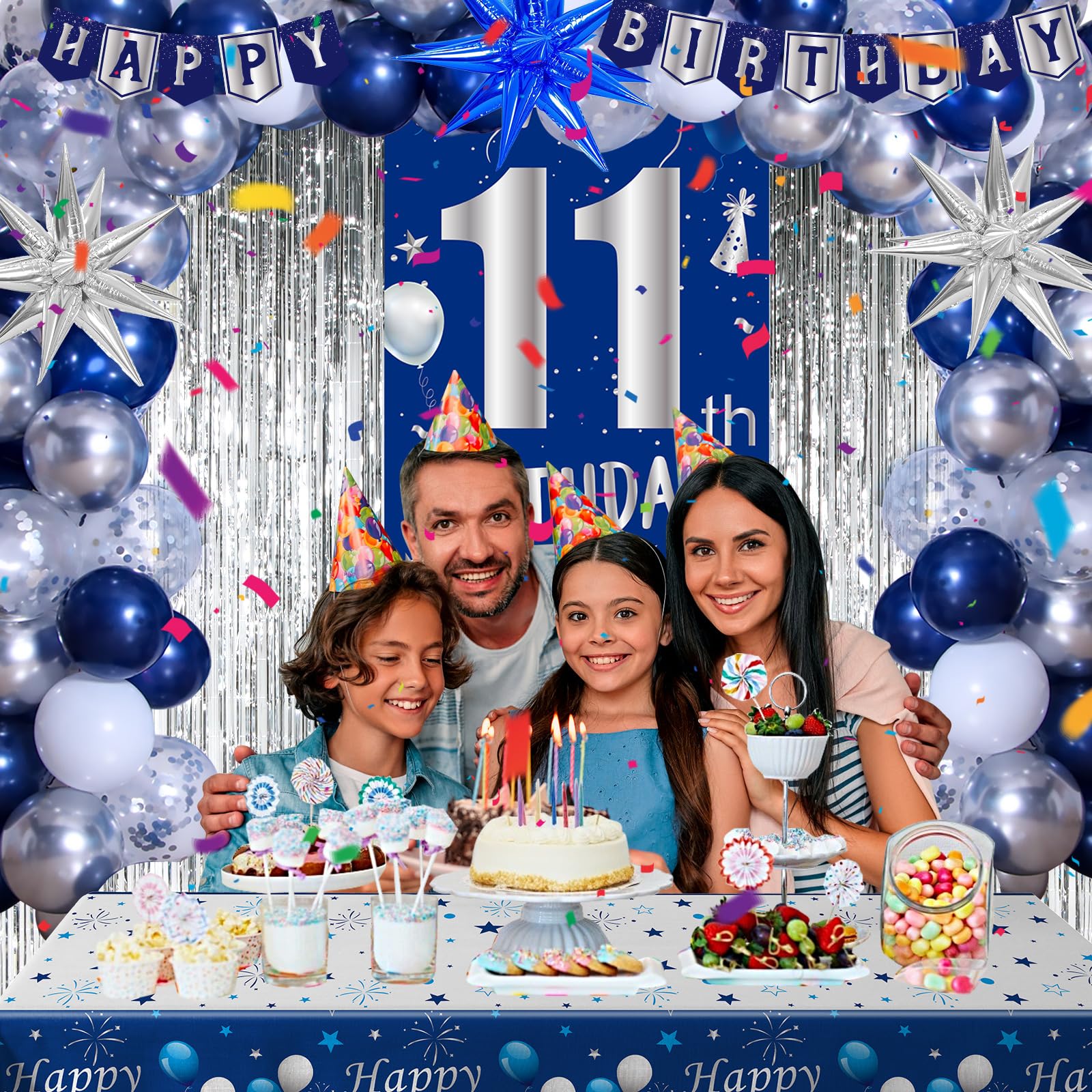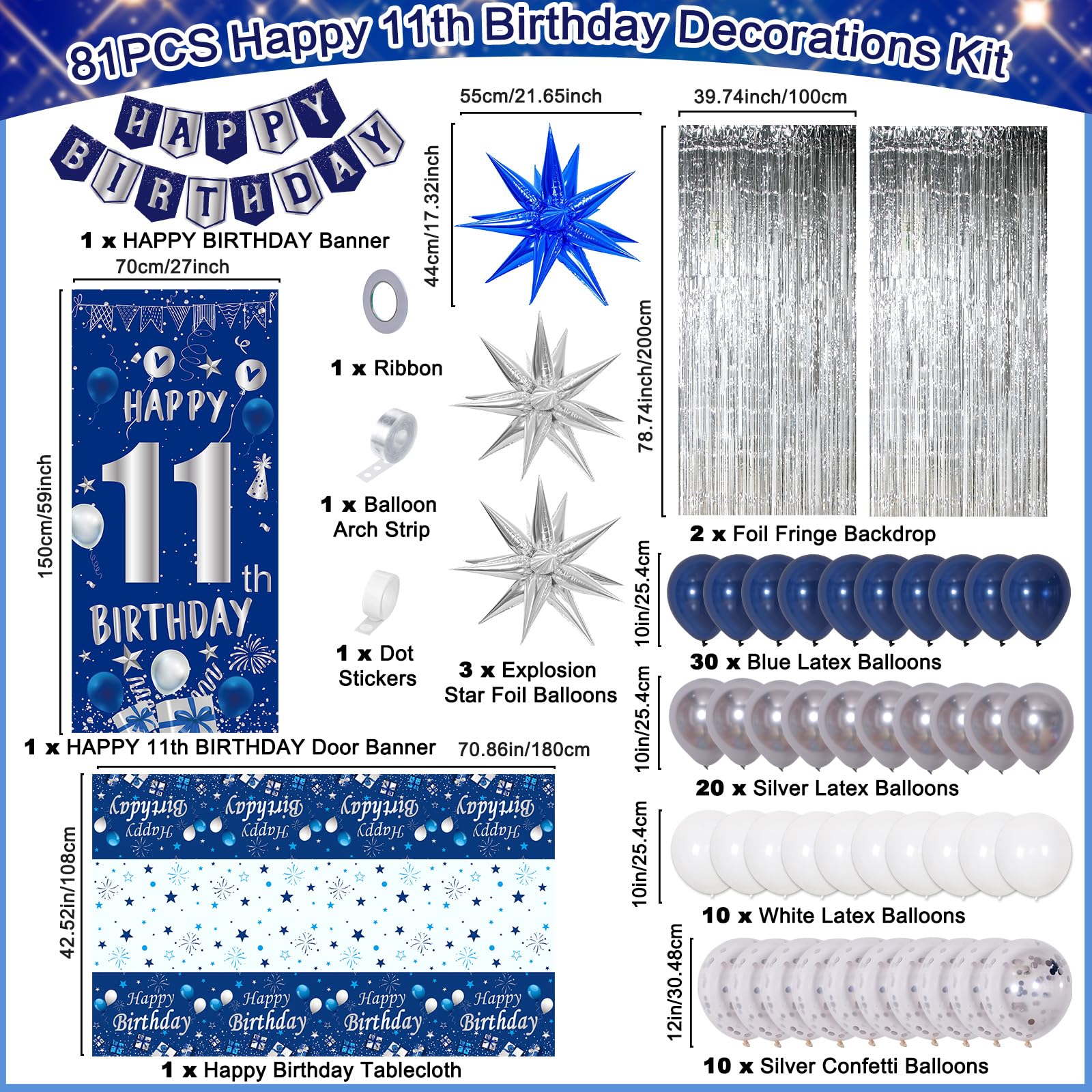 81PCS 11th Birthday Decorations Pack - The blue 11th birthday decorations for boys kit includes 1 x happy 11th birthday door banner, 1 x happy birthday banner, 1 x happy 11th birthday tablecloth, 2 x silver foil fringe backdrop, 3 x explosion star foil balloons(2pcs silver + 1pc blue), 60 x 10in latex balloons(30pcs blue + 20pcs silver + 10pcs white), 10 x 12inch silver confetti balloons, 1 x balloon arch strip, 1 x dot stickers, 1 x ribbon. One package meets you girls boy 11 birthday party needs