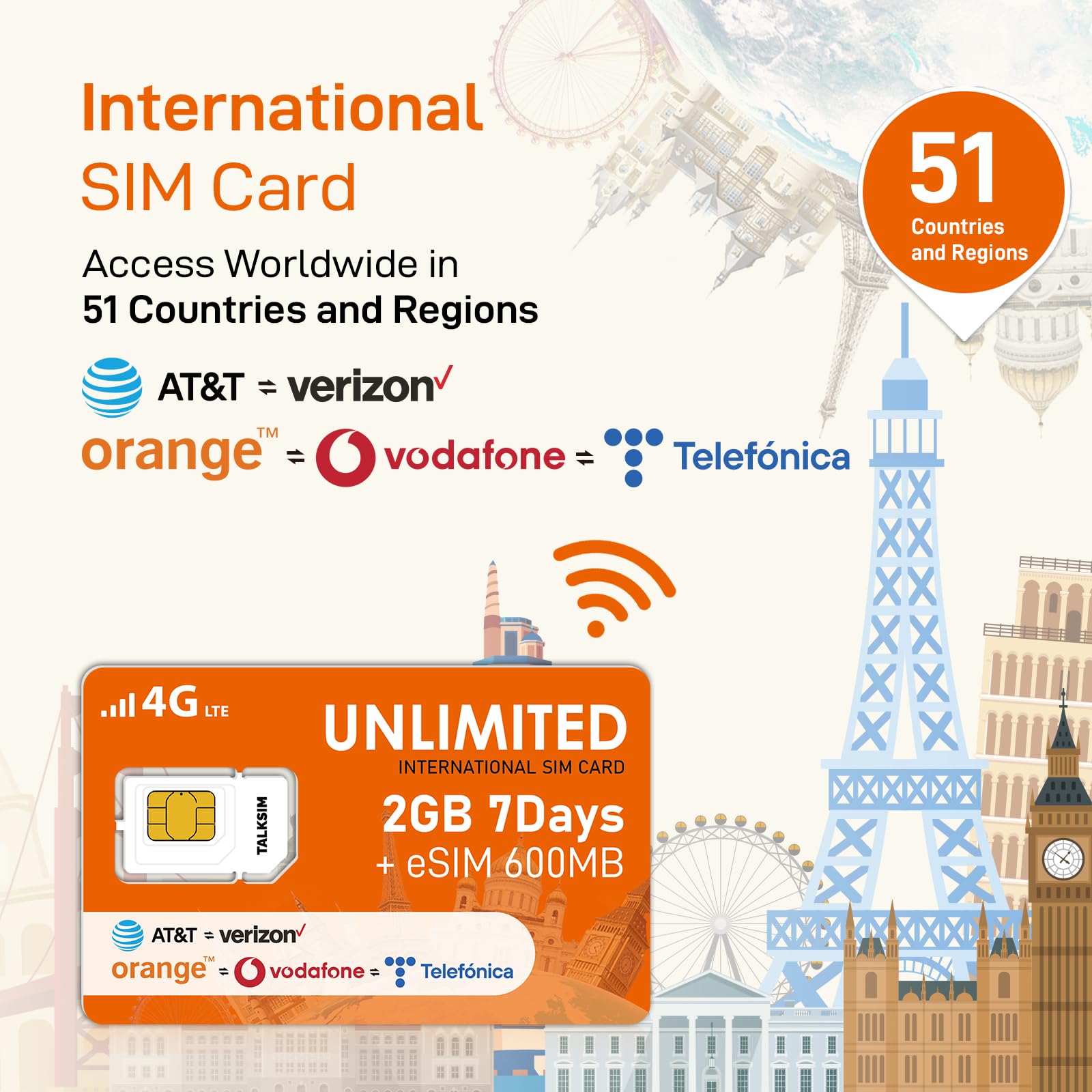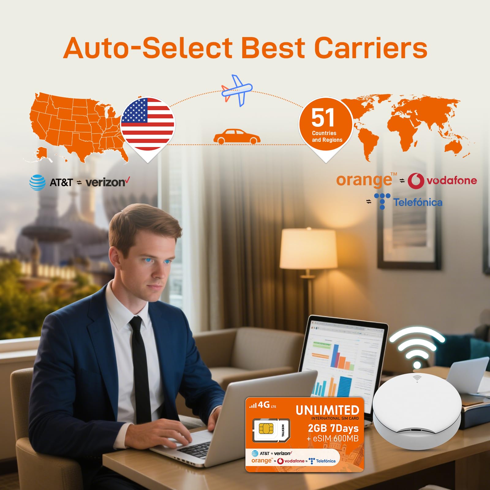 【Dual SIM & eSIM Combo– Global Connectivity in One Card】One Pack, Two Ways to Connect. Includes both an international SIM card (unlimited 2GB/7 days) and a travel eSIM (600MB trial) for maximum flexibility. Connect 50+ countries with zero cross-border switching hassle. Use it as a US local SIM/eSIM or European travel SIM/eSIM with stable 5G/4G speeds, ensuring stable connectivity for business/sightseeing. Effortlessly switch effortlessly between cross-continental network scenarios.