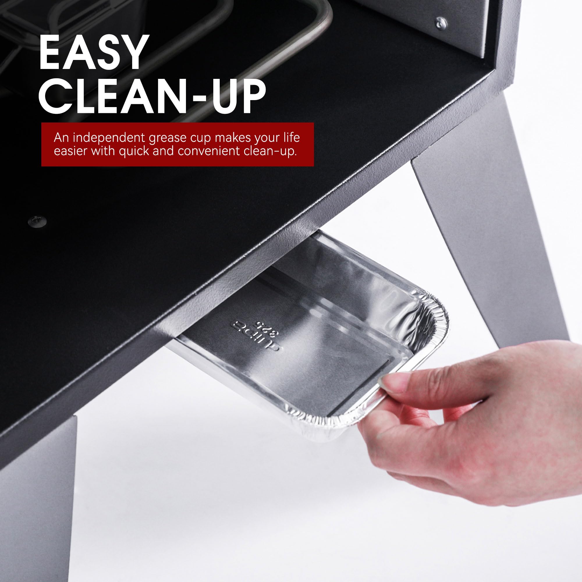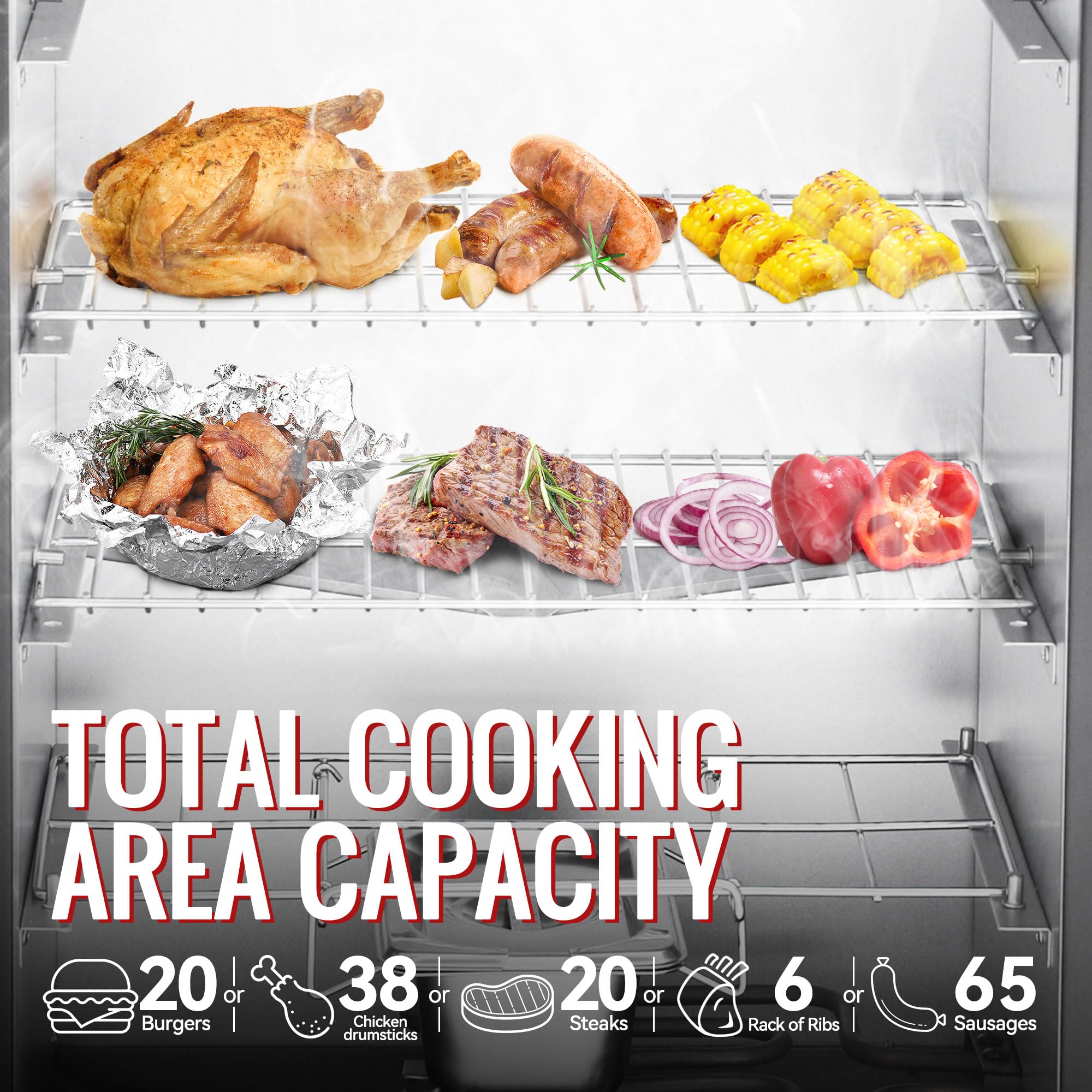 Large Cooking Space: A total of 454 sq. in. cooking area, including 3 chrome-plated steel smoking racks, offers you an ample cooking area for your favorite food