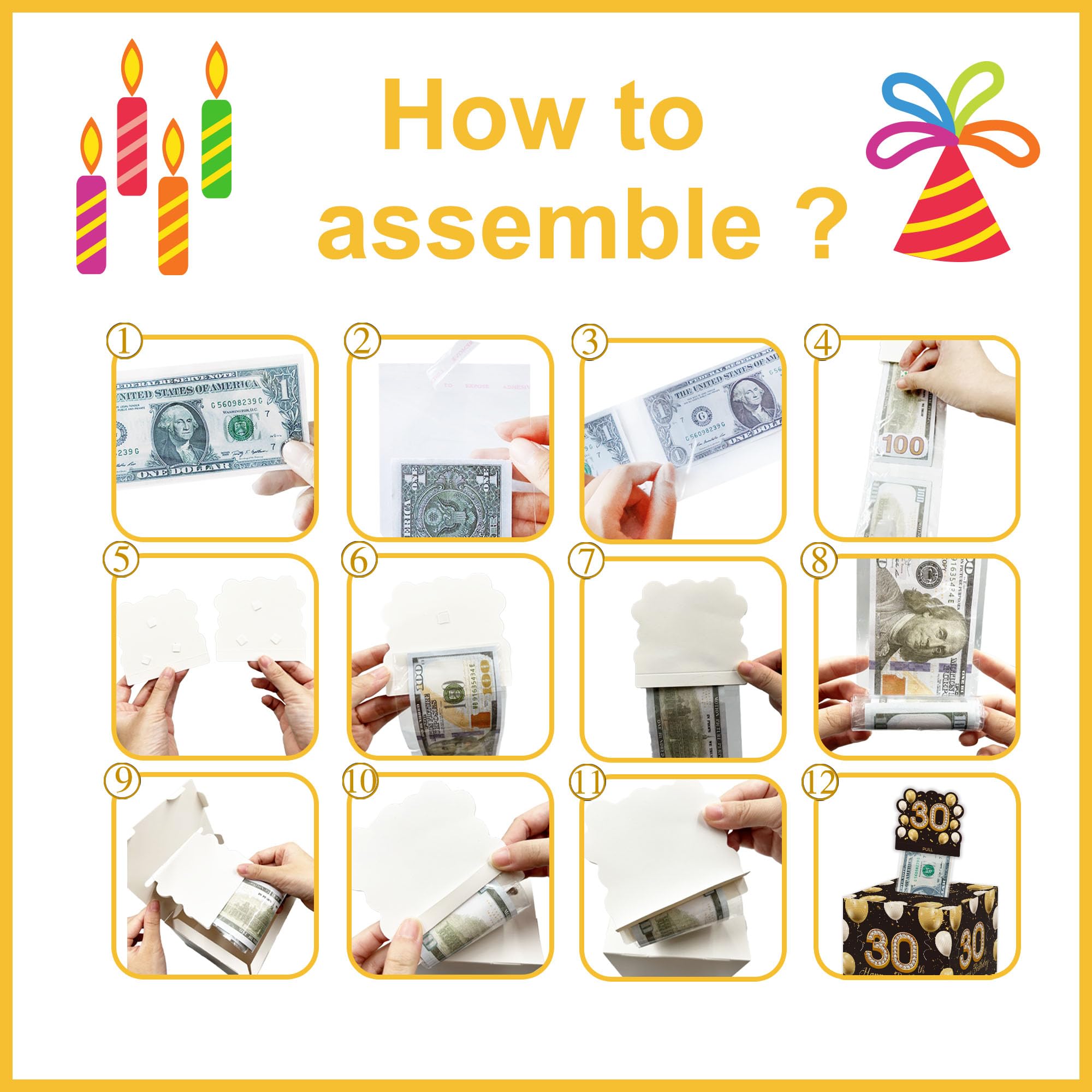 Surprise Gift Box: this gift box measures 5x5 inches, is made of durable cardboard. It also includes 2 theme-related shaped card(with adhere glue dots), 1 roll of transparent tape and 35 plastic pouches similar to the size of U.S. currency for easy placement of bills.