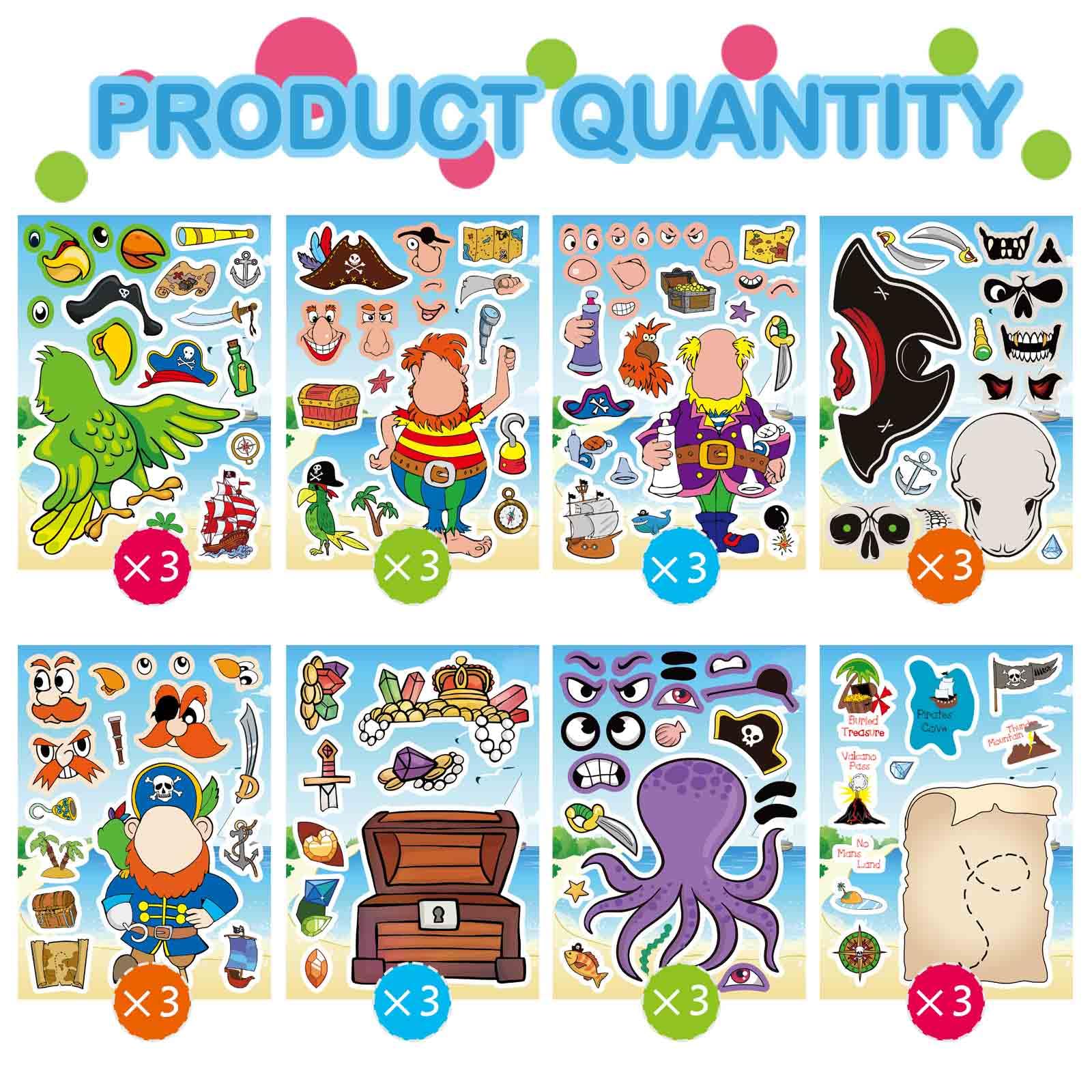 Make Your Own Pirate Sticker Adventure: You will receive 24 sheets of pirate-themed stickers, featuring an exciting variety of designs such as pirate ships, treasure chests, maps, skulls, swords, anchors, parrots, and more. These vibrant and detailed stickers bring the world of pirates to life, perfect for kids and adults alike.