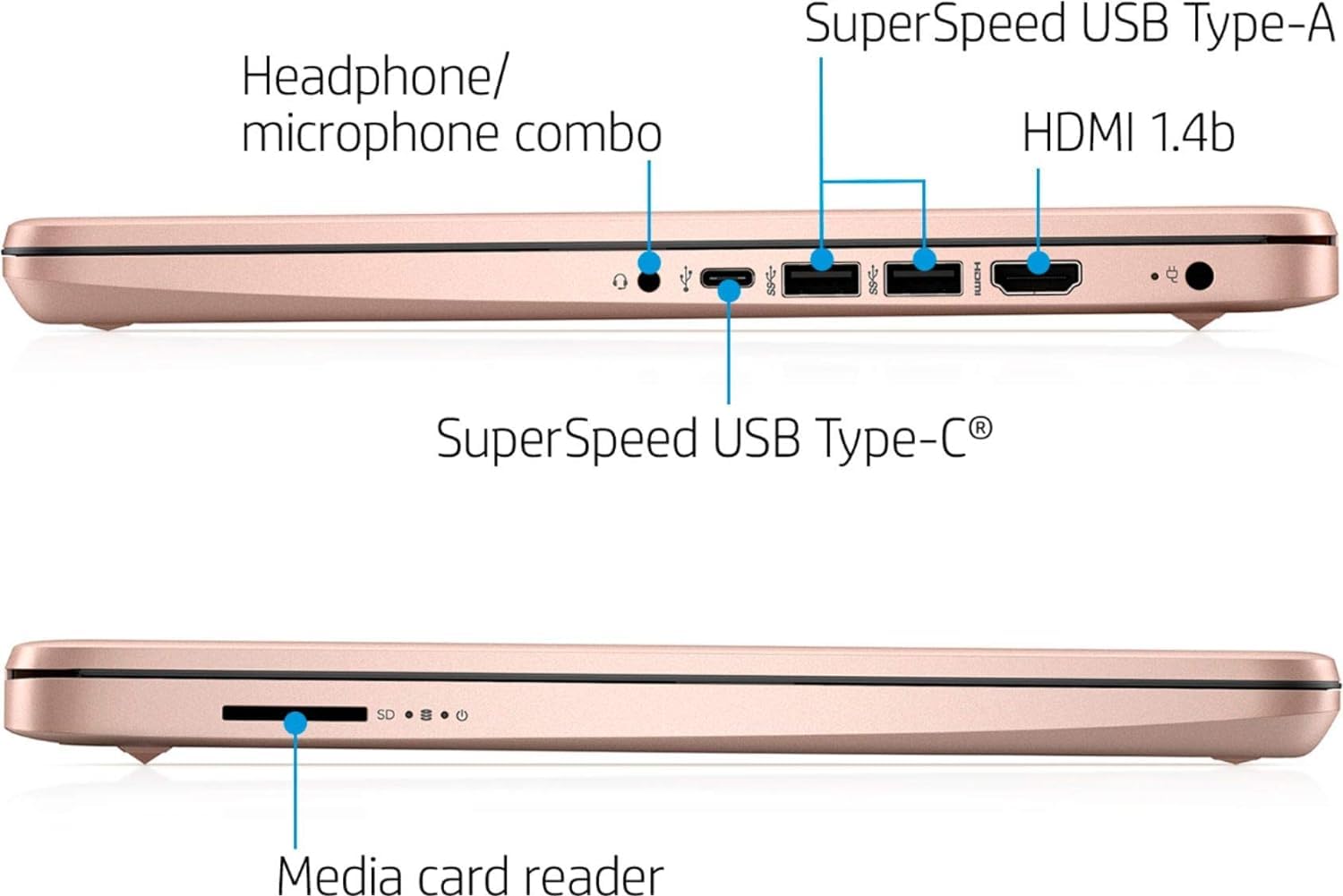 Processor: Intel Celeron N4120 (up to 2.6 GHz burst frequency, 4 MB L2 cache, 4 cores, 4 threads) Graphics: Intel UHD Graphics Operating system: Windows 11 Home 64-bit Memory: 16GB DDR4 SDRAM Hard Drive: 1.6TB Storage (128GB onboard hard drive + 512GB external hard drive + 1TB OneDrive Cloud Storage) Optical Drive: No Display: 14-inch diagonal, HD (1366 x 768), micro-edge, BrightView, 220 nits, 45% NTSC Connectivity: Realtek RTL8821CE 802.11a/b/g/n/ac (1x1) Wi-Fi and Bluetooth 4.2 combo Audio: Dual Speakers Keyboard: US English, NonBacklit Full Size Keyboard Built-in HD Webcam: HP True Vision 720p HD camera with integrated dual array digital microphones Media Drive: Multi-format SD media card reader Ports: 1 x USB 3.1 Gen 1 Type-C (Data Transfer Only, 5 Gb/s signaling rate) 2 x USB 3.1 Gen 1 Type-A (Data Transfer Only) 1 x AC smart pin 1 x HDMI 1.4b 1 x Headphone / Mic Combo Jack Battery: Up to 11.5 Hours Color: Rose Gold Dimensions L x W x H (inches): 12.7 x 8.8 x 0.7 Weight: 3.2 lbs