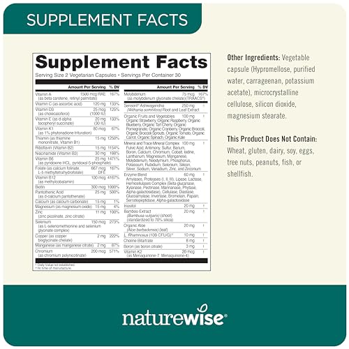 Men's Multivitamin with Stress Support provides comprehensive support for men's health. This unique whole food complex multivitamin addresses key aspects of men's health with 22 vitamins and minerals to support heart and immune health.* Rich with fulvic ionic minerals and trace minerals, NatureWise Men's Multivitamin meets the nutritional needs of men to help them feel their very best.* Among the 22 vitamins and minerals in this formula are vitamin A, C, D3, E, K2, B-complex, calcium, magnesium, zinc, and more. This multivitamin for men also contains organic fruits and vegetables, such as strawberry, blueberry, raspberry, kale, and broccoli. This vitamin is enhanced with digestive enzymes that specifically target the digestion of starches, protein, fats, and fiber to promote better absorption of the vitamin.* Men’s Multivitamin is formulated with a comprehensive fulvic acid complex that may enhance your overall well-being, immune function, and brain function.* On top of its robust vitamin complex, Men’s Multivitamin is designed for stress support with its dose of Sensoril® Ashwagandha, which may support a healthier stress response and promote relaxation.* Support your daily health and your body’s stress responses with NatureWise Men's Multivitamin with Stress Support. This product is vegetarian, gluten free, and does not contain wheat, eggs, soy, dairy, tree nuts, peanuts, fish, or shellfish.