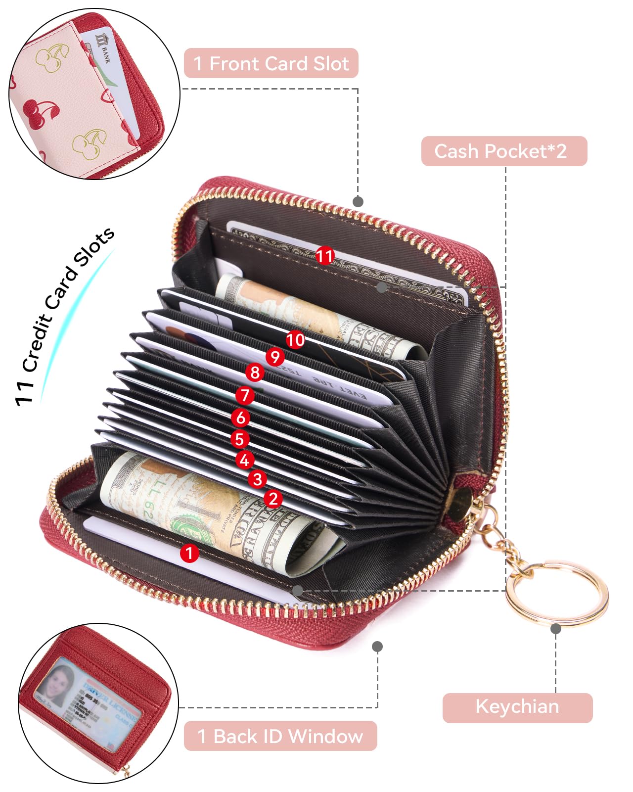 Multi-Slots Card Case: The keychain wallet has 14 card slots in an accordion design for easy access to credit cards, and an ID window on the outside for your ID photo. Your debit card, point card, driver's license, folded cash, etc can also be held in the mini keychain card holder with enough room. Compact size offers a smart solution to your basic needs If you do not want carry much or do not like bulky card holder wallet.