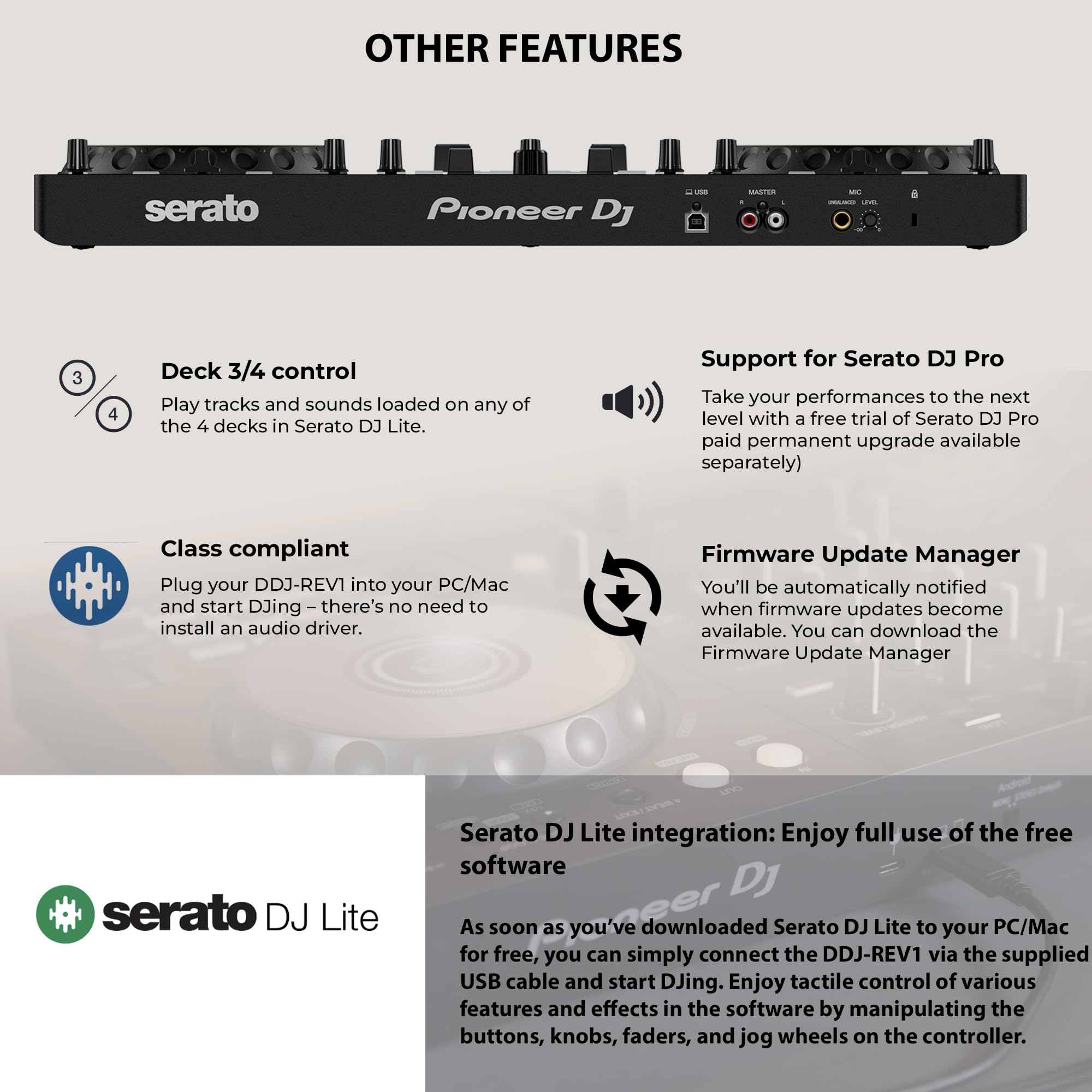 The DDJ-REV1 is designed to work seamlessly with the free Serato DJ Lite software, featuring a battle-style layout that’s intuitive and perfect for aspiring DJs. This 2-channel DJ controller mimics a professional DJM-S mixer and PLX turntable setup, providing features that appeal to open-format and scratch DJs. Its layout offers plenty of room for mixing and scratching techniques, with a fresh control arrangement for optimal performance. The tempo sliders, longer at 60mm compared to those on the DDJ-SB3, give you more precision in your control, and they run horizontally above the decks. Performance Pads have been conveniently moved to the mixer section, making it easier to combine effects, trigger samples, and scratch tracks. Specifications: Inputs: 1 MIC (1/4 inch TS Jack) Outputs: 1 MASTER (RCA), 1 PHONES (3.5 mm stereo mini jack) USB: 1 USB B port Soundcard: 24 bit / 48 kHz Signal-to-Noise Ratio: 103 dB Distortion: <0.005 % Power Supply: USB Type-B bus powered Power Consumption: 5V 500mA In the Box: DDJ-REV1 controller, USB cable, Warranty (varies by region), Quick start guide, Precautions for use This bundle from Austin Bazaar includes a DJ laptop stand, a pair of headphones, and a polishing cloth, giving you everything you need to get started right away while keeping your controller in excellent condition!