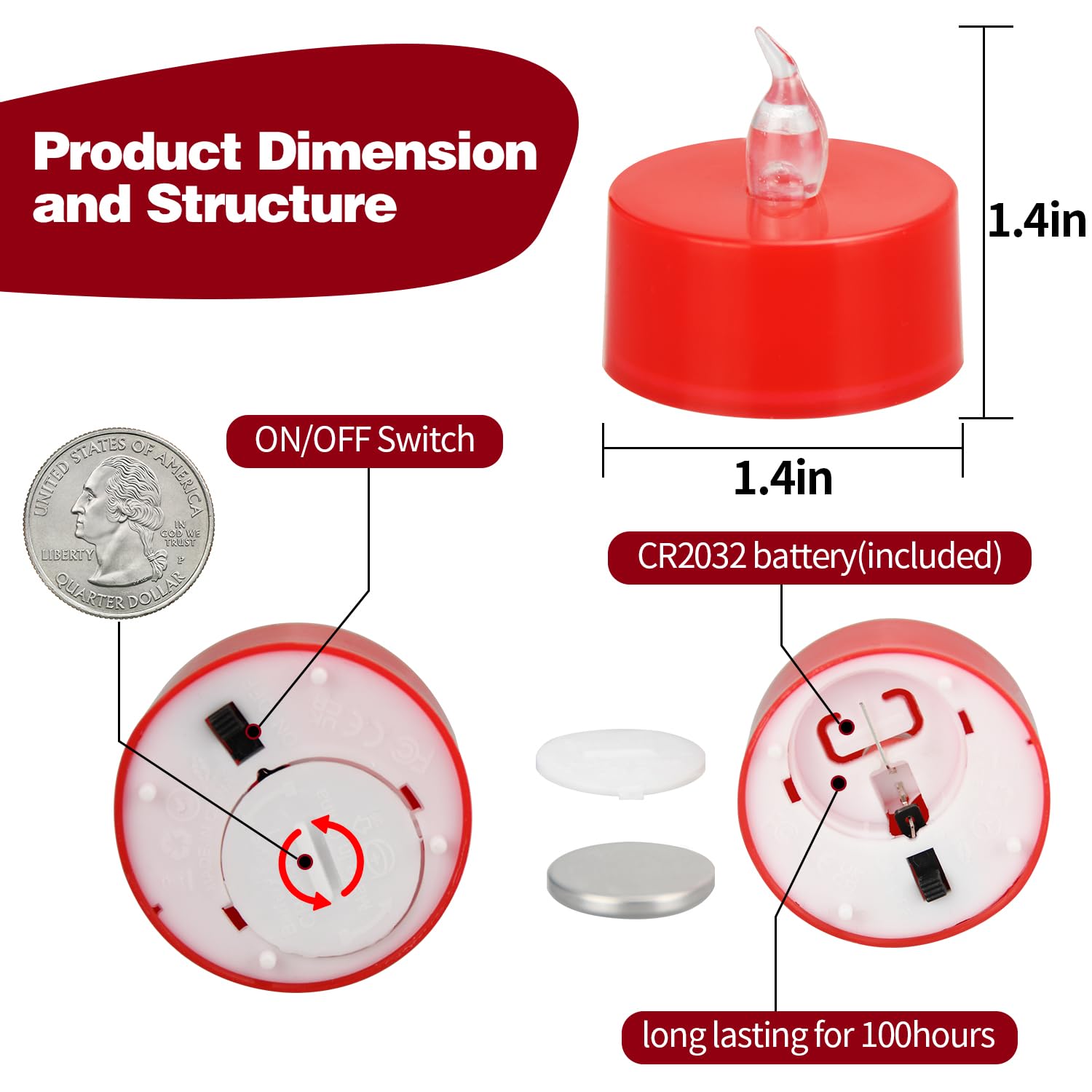 Specifications: Item name: Flameless tea lights Material: PP Tea light size: 1.4 x 1.4 x 1.4in Tea light weight: 0.3oz/piece Light color: Red Light effect: Non-flickering Switch mode: Manual switch Battery: 1pcs CR2032 per light(included) Working time: 100H+ Package List: 12 × Flameless tea lights(red light, red base)