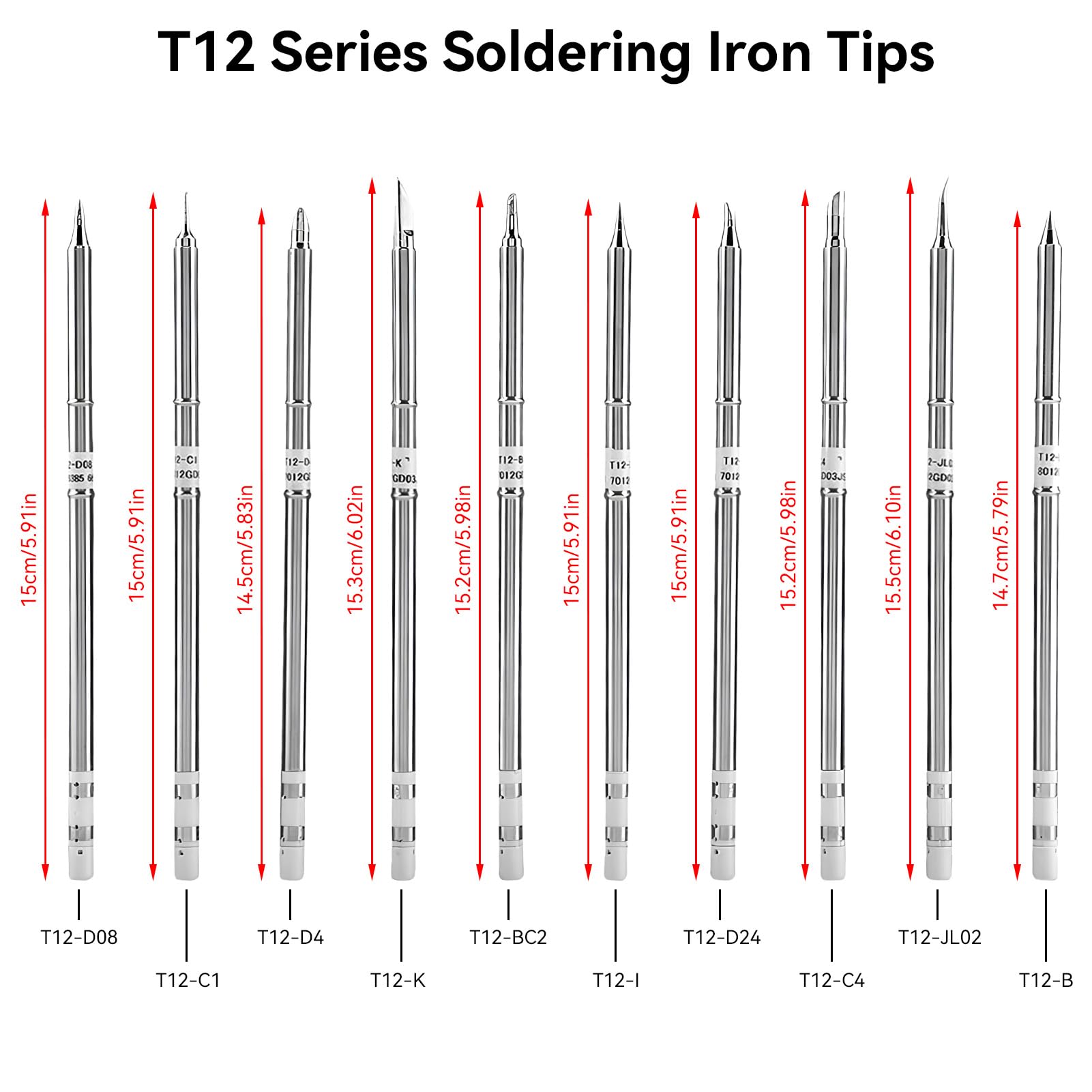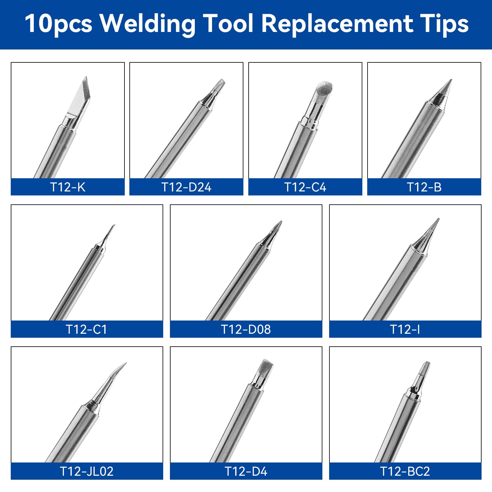 PACKAGE: 10 types of soldering iron tips T12-BC2, D4, JL02, I, D08, C1, B, C4, D24, K, can meet your different soldering needs. Get this soldering head set and make your soldering work efficient.