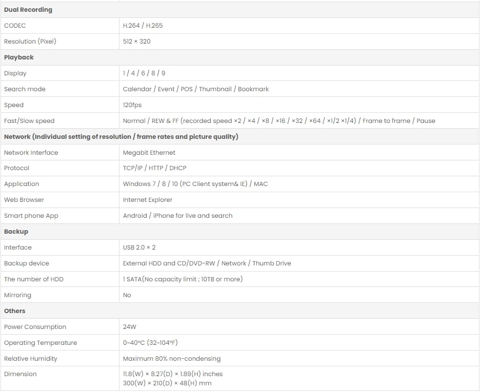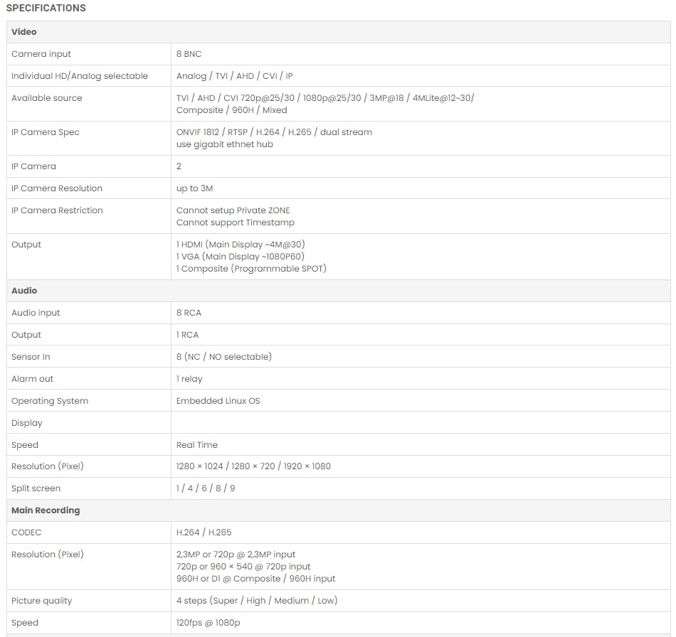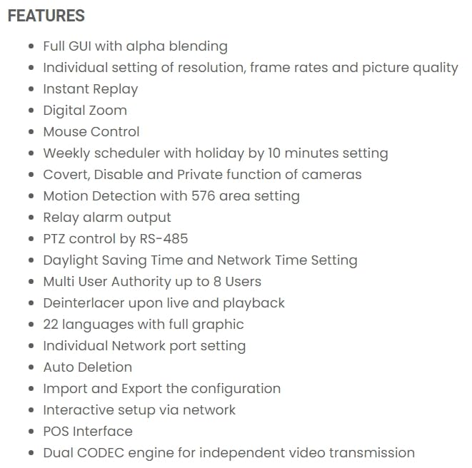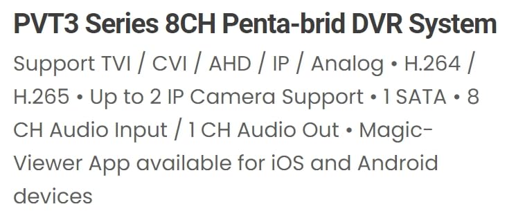 Eyemax Magic Viewer Prestige Series 8CH Penta-brid CCTV DVR System Suport Cameras Upto 5MP,For HD-TVI, HD-CVI, HD-AHD, 960H Analog Cameras -No HDD- Full GUI with alpha blending Individual setting of resolution, frame rates and picture quality Instant Replay Digital Zoom Mouse Control Weekly scheduler with holiday by 10 minutes setting Covert, Disable and Private function of cameras Motion Detection with 576 area setting Relay alarm output PTZ control by RS-485 Daylight Saving Time and Network Time Setting Multi User Authority up to 8 Users Deinterlacer upon live and playback 22 languages with full graphic Individual Network port setting Auto Deletion Import and Export the configuration Interactive setup via network POS Interface Dual CODEC engine for independent video transmission 2TB HDD
