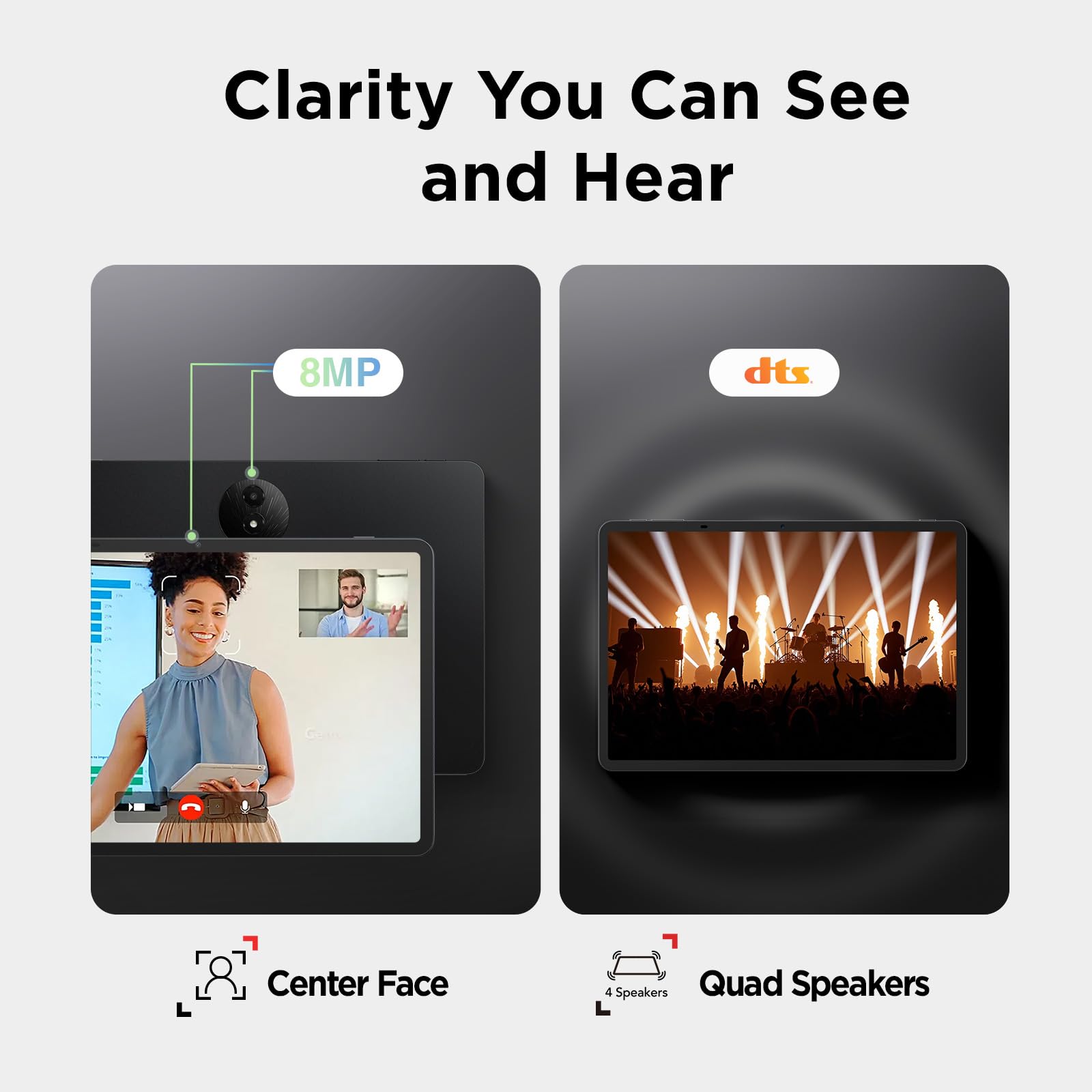 Vivid Visuals, Immersive Audio: The TCL NXTPAPER 11 Plus tablets feature 8MP front and rear cameras for HD video calls and everyday photos. Featuring CenterFace tracking, you stay perfectly focused even while moving. Quad speakers and dual microphones, boosted by smart PA and DTS audio, deliver deep bass and clear vocals. The Sound Booster function instantly boosts volume from 100% to 200%, enhancing your experience in movies, calls, and entertainment
