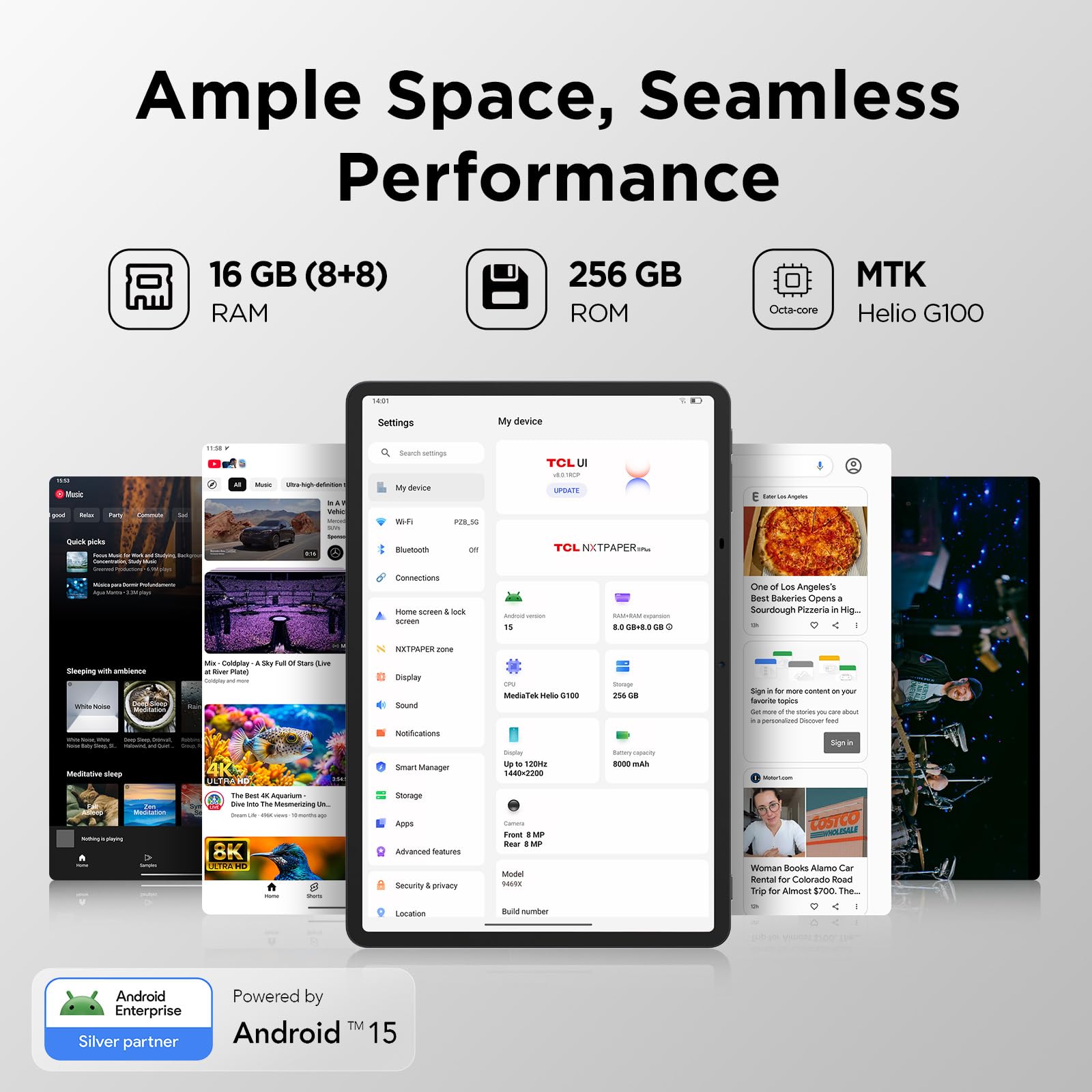 Ample Storage & Powerful Performance: Capture family memories, download entire series, and save large work files—TCL electronics tablets with 256GB of built-in storage make it all possible. Enjoy smooth performance for daily use and demanding tasks with the MediaTek Helio G100 processor and 8GB + 8GB RAM expansion. Powered by Android 15 and TCL’s custom UI, it enhances productivity with features like screen mirroring, extended display, floating windows, and split-screen