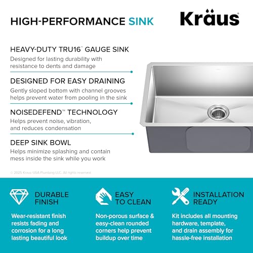 Product Description The KRAUS Standart PRO stainless steel kitchen sink features a sleek modern design with easy-to-clean rounded corners. Made with heavy-duty TRU16 gauge stainless steel for long-lasting durability with great resistance to corrosion, dents, and damage. Undermount sink installation creates a clean transition from sink to countertop and simplifies cleanup by letting you wipe water and crumbs right into the sink. Large NoiseDefend sound dampening pads help absorb noise and vibration. Smooth satin finish and rounded corners make this stainless steel sink easy to keep clean, with channel grooves for easy draining. Comes with protective bottom grid, drain assembly with strainer, template, and mounting hardware for undermount kitchen sink installation. From the Manufacturer Add Please note, Garbage Disposal Flange and Stopper Kit must be purchased separately. Kraus Stainless Steel Kitchen sink comes with: Stainless steel bottom grid with protective feet and bumpers. Stainless steel basket strainer. Dish towel. Mounting and installation brackets, cutout template are included. 30-Inch L x 18-Inch W x 10-Inch H (overall sizes). 28-Inch L x 16-Inch W x 10-Inch H (bowl sizes). Fits 30-33-Inch cabinet. Certified and Listed by UPC, cUPC, CSA, IAPMO, ANSI and SCCManufactured by Kraus. Limited Lifetime Warranty.