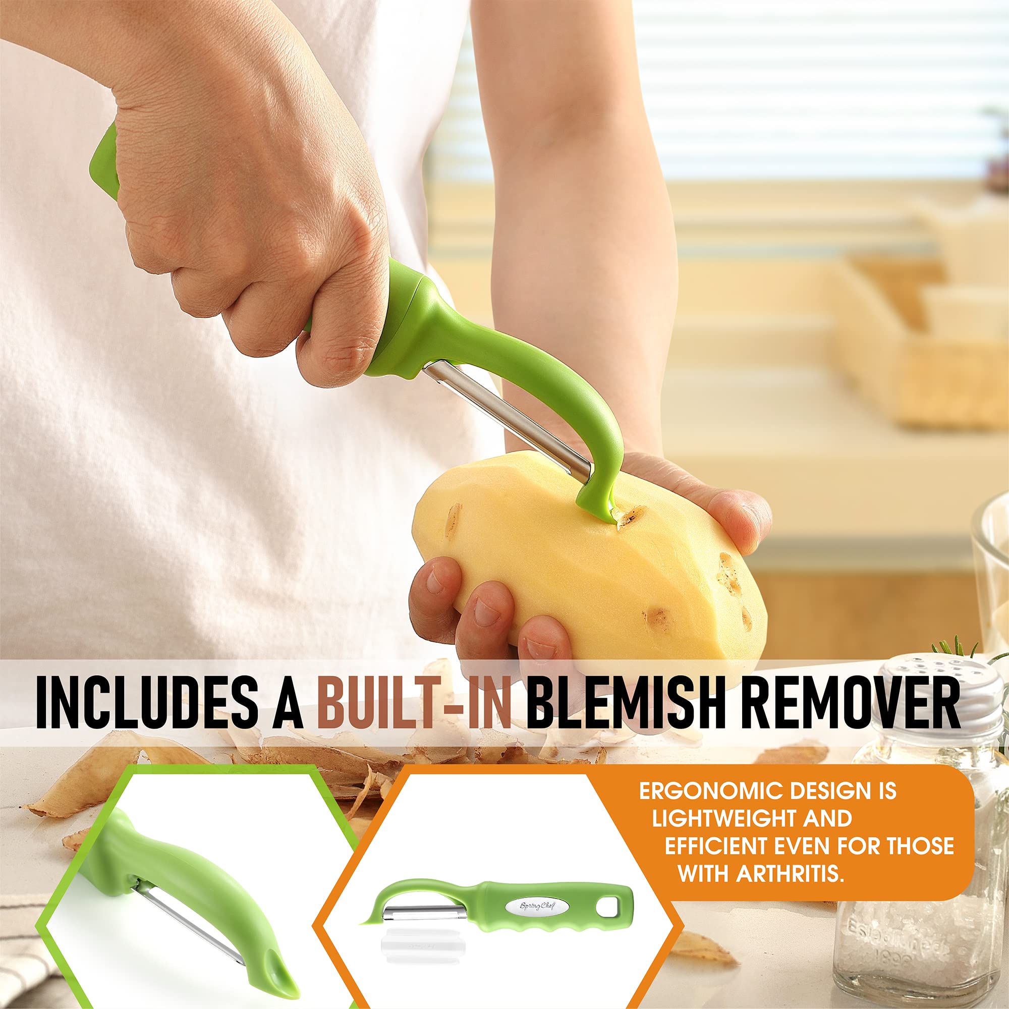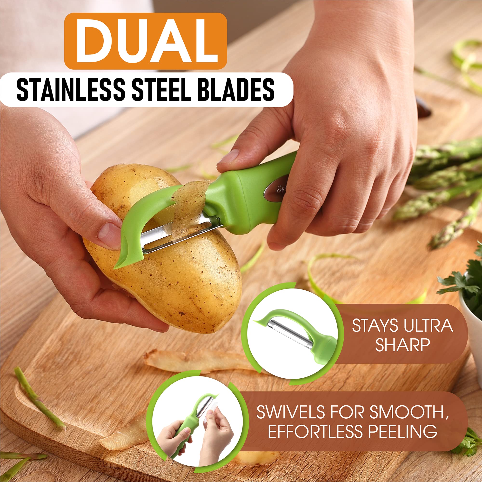 Smooth, Effortless Peeling - Dual Stainless Steel blades stay ultra sharp and swivel to glide along fruits and vegetables easily. Includes a built-in blemish remover.