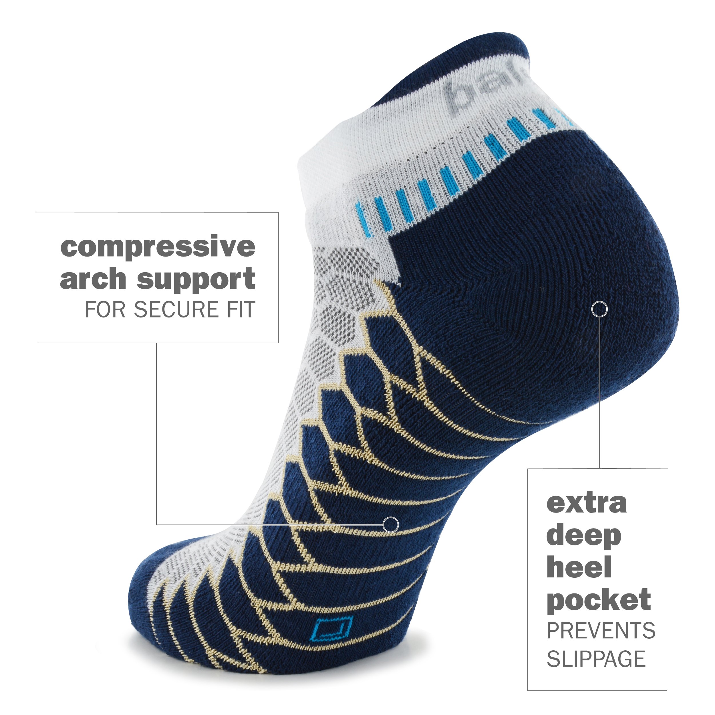 Description The Balega Silver No-Show Compression-Fit Running Sock for Men and Women provides moisture-management and comfort without sacrificing fit and performance. Silver ions are encapsulated in the proprietary Drynamix yarn blend to keep feet clean and dry. Constructed to mimic a running shoe, the varying tension of the fibers and knit patterns throughout the athletic sock lock in the heel and provide compressive arch support for grip and quick pick-up, while allowing the toes to move freely. The seamless, hand-linked toe box minimizes friction for blisters and chafing. A high heel tab and extra deep heel pocket ensures that the sock won’t slip down into the shoe. The Balega Silver No-Show Compression-Fit Running Sock features medium-volume cushioning, ensuring durability for extended training and endurance events.